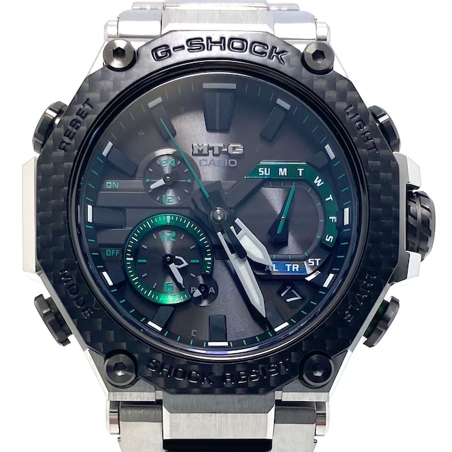 カシオ CASIO G-SHOCK ジーショック MT-G MTG-B200XD-1AJF 電波ソーラー スマホリンク Bluetooth 黒 デイト表示 20気圧防水 【バイヤーズコメント】 タフネスウォッチの代名詞 CASIO G-SHOCK の中でも、メタルと樹脂を融合させた上位ライン MT-G より、MTG-B200XD-1AJFが入荷されました。現在は生産終了しており入手が難しい希少なモデルとなっています。 ブラック文字盤にグリーンの差し色が映える精悍なデザインに加え、カーボン×ステンレスによるデュアルコアガード構造を採用し、圧倒的な耐衝撃性と高級感を両立。電波ソーラー(マルチバンド6)に加え、Bluetoothによるスマートフォンリンク機能を搭載し、常に正確な時刻管理と快適な操作性を実現しています。 20気圧防水で実用性も非常に高く、ビジネスからアウトドアまで幅広く活躍する一本となっています。 程度もかなり良好な状態で、動作にも現状問題ありません。Bluetooth接続も確認済みです。G-SHOCKの最先端技術と洗練されたデザインを堪能できる逸品をこの機会にぜひ。 【商品説明】 ブランド:カシオ CASIO モデル・型番:ジーショック G-SHOCK MT-G MTG-B200XD-1AJF 参考定価:148,500円 程度ランク:Aランク 大きさ:フェイス縦約4.4cm・フェイス横約5.1cm(リューズ含む)・厚さ約1.5cm・ベルト幅約2.1〜2.6cm 重さ:約143g 仕様:ステンレス 腕回り:約17.5cm(余りコマ3個、約3.0cm分あり) ムーブメント:クォーツ・電波ソーラー式 付属品:箱、保証書(日付:2025年3月)、説明書、余りコマ 状態 フェイス:ベゼル及びケースに極小のスレがありますが、気にならない程度です。 ベルト:ベルト表面及び裏面、バックルに極小のスレがあります。 全体的に使用感の少ないかなり綺麗な状態の品です。動作にも現状問題ありません。 古物市場で購入致しました。 中古品となりますので、ご理解頂ける方でお願い致します。