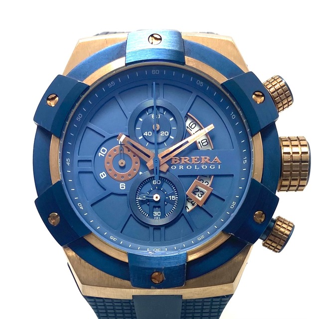 ブレラオロロジ BRERA OROLOGI スーパースポルティーボ Super Sportivo BRSSC4910 AE03 クォーツ クロノグラフ デイト表示 ネイビー ラバーベルト 10気圧防水 【バイヤーズコメント】 イタリア発のデザインウォッチブランド BRERA OROLOGI(ブレラオロロジ) より、ブランドを代表するスポーツクロノグラフライン「スーパースポルティーボ」BRSSC4910 が入荷されました。 迫力あるビッグケースに、ネイビーカラーのダイヤルとラバーベルトを組み合わせた、存在感抜群のスポーティモデルです。クロノグラフ機能を備えたクォーツムーブメントを搭載し、扱いやすさと実用性を両立。 デイト表示機能付き、10気圧防水仕様のため日常使いにも安心。ブレラオロロジらしい大胆なデザインとイタリアンスポーツテイストを存分に楽しめる一本で、コーディネートの主役としてもおすすめです。 程度もまずまず良好な状態の品で、動作にも現状問題ありません。個性のあるスポーツクロノグラフをお探しの方は、この機会にぜひご検討ください。 【商品説明】 ブランド:ブレラオロロジ BRERA OROLOGI モデル・型番:スーパースポルティーボ Super Sportivo BRSSC4910 AE03 程度ランク:ABランク 大きさ:フェイス直径約4.9cm・厚さ約1.6cm・ベルト幅約2.4〜3.2cm 重さ:約169g 仕様:ステンレス、ラバーベルト 腕回り:調整可能 ムーブメント:クォーツ・電池式 付属品:内箱、保証書(日付:2013年7月)、説明書 状態 フェイス:ガラス面に若干のスレや傷があります。ベゼル及びケース、裏蓋にも若干のスレや小傷があります。 ベルト:表裏及び遊革、定革に若干のスレがあります。 全体的にまずまず綺麗な状態の品です。動作にも現状問題ありません。 古物市場で購入致しました。 中古品となりますので、ご理解頂ける方でお願い致します。