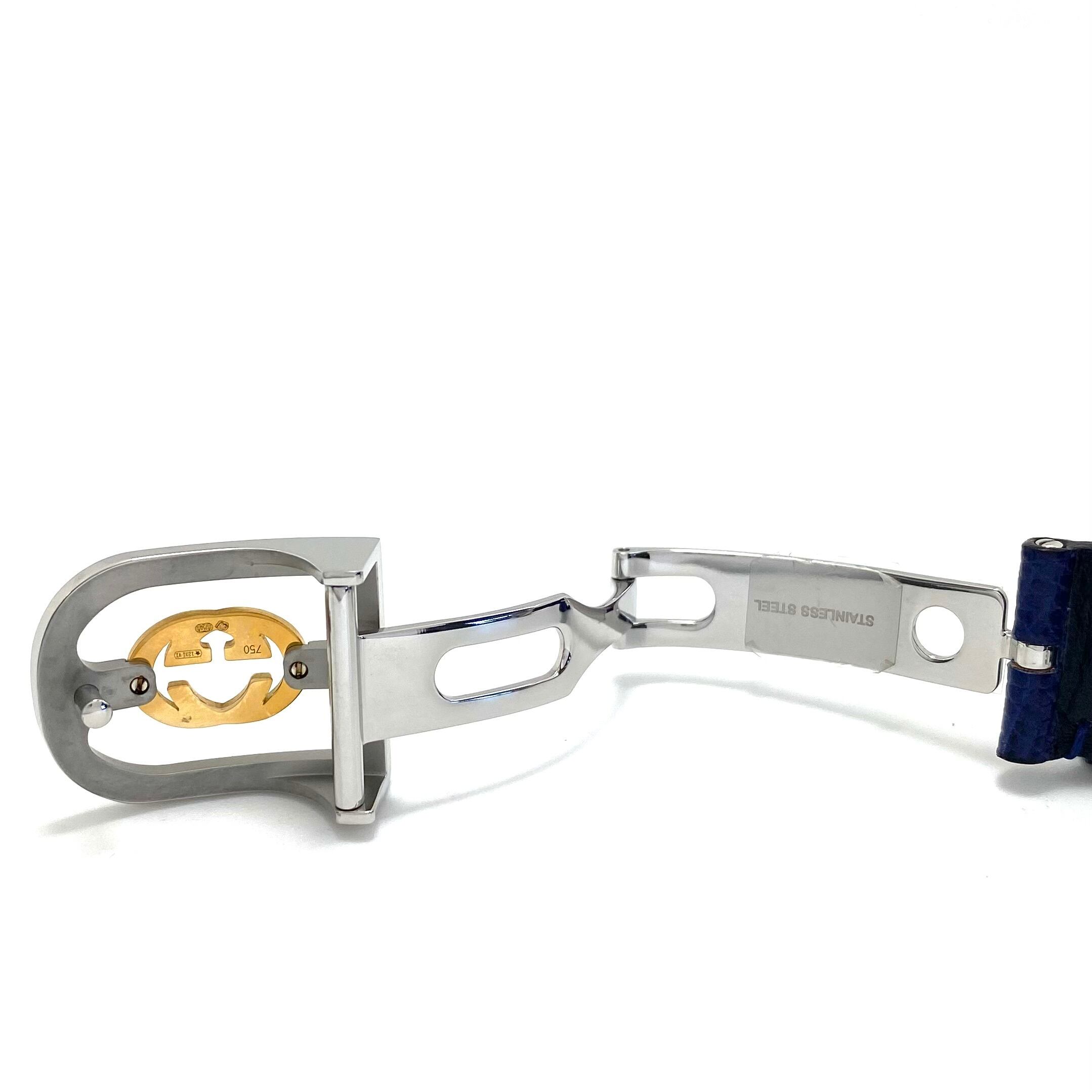 艶やかなブルーのラピスラズリ風ダイアルに、グッチのアイコンであるビー(蜂)モチーフを大胆に配置。クラシカルなケースデザインに個性的なディテールが融合した、タイムレスな魅力あふれるモデルです。