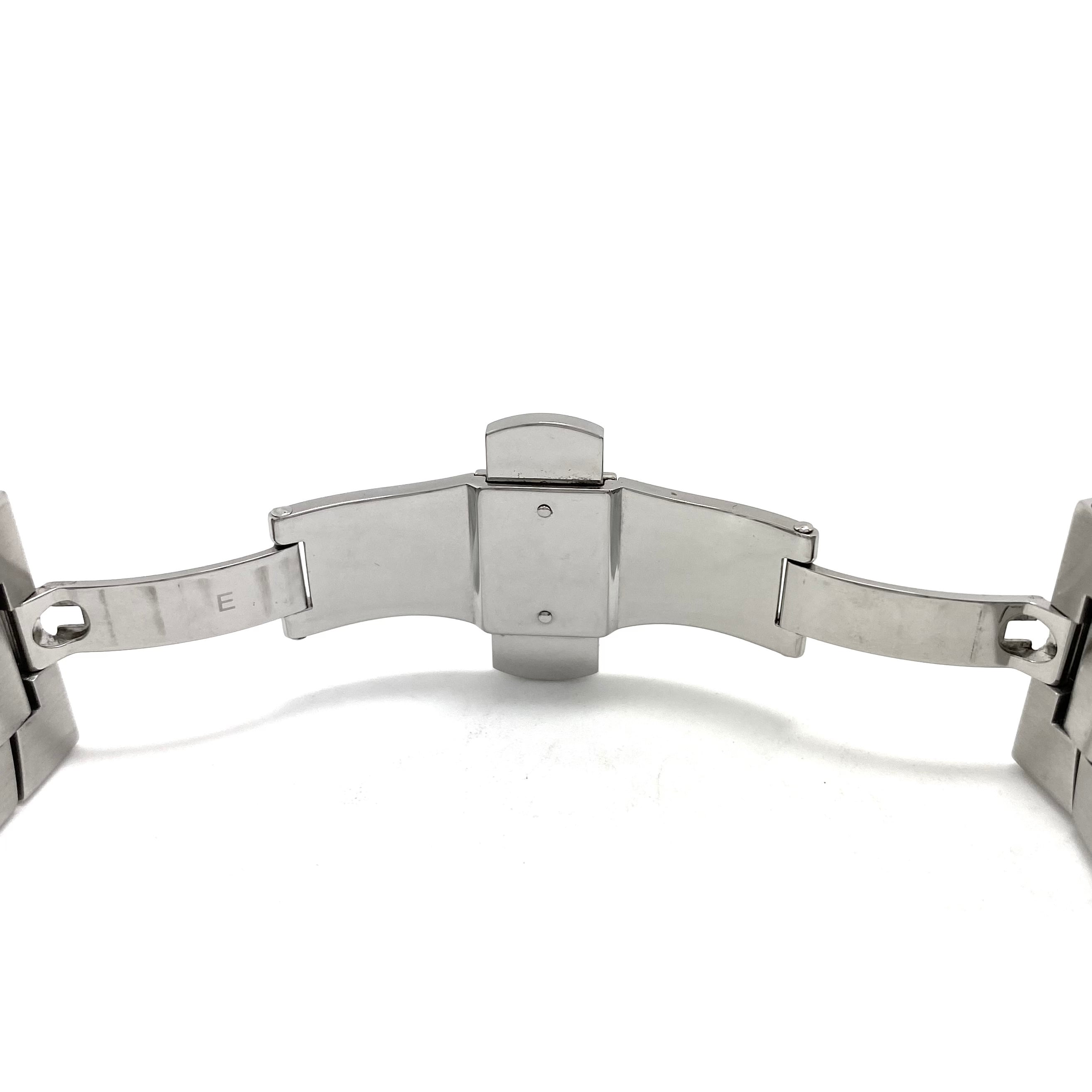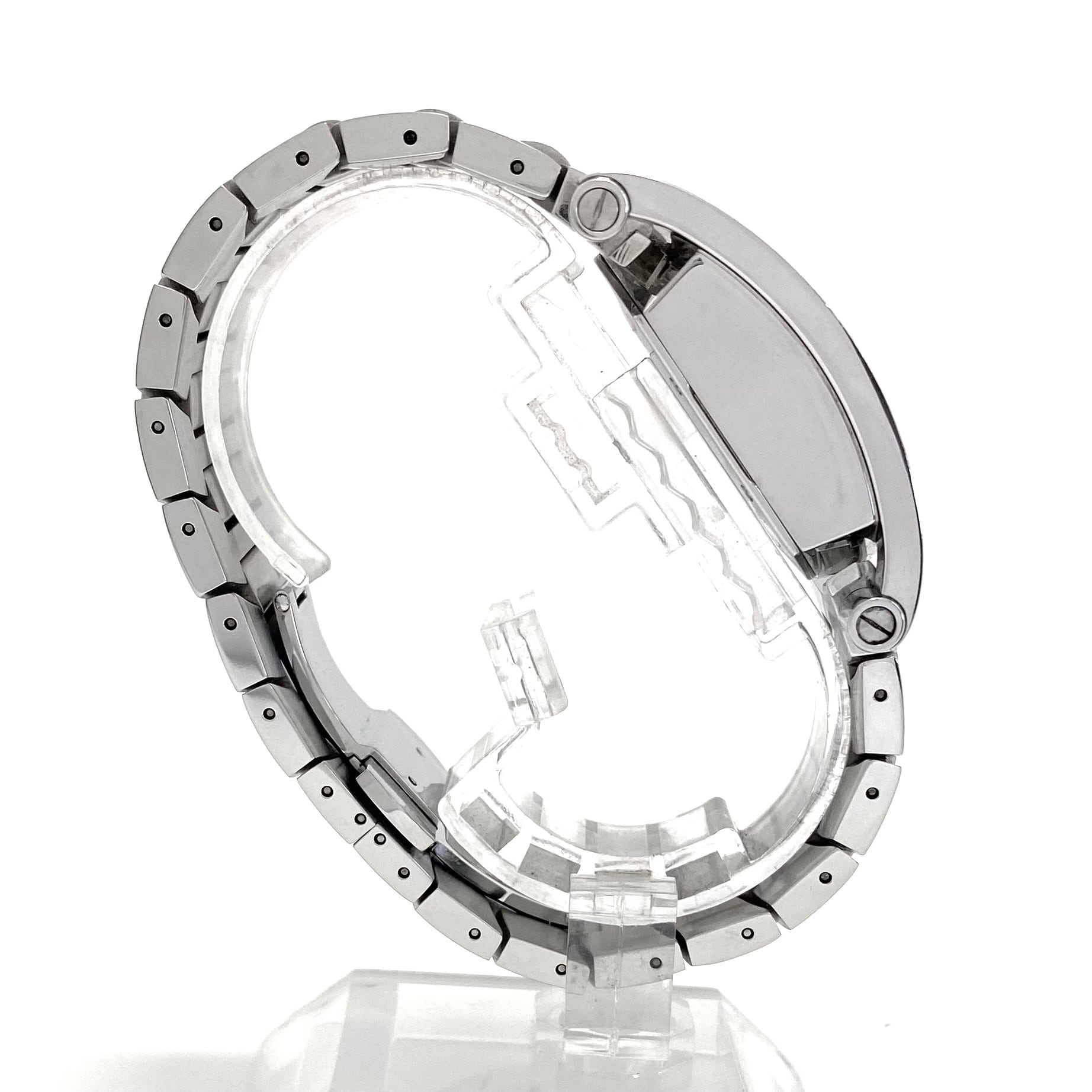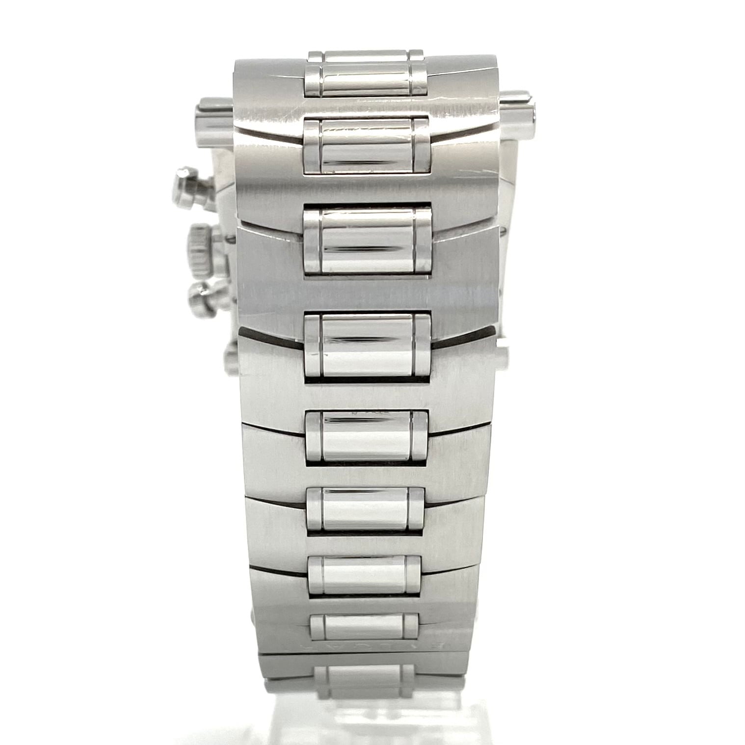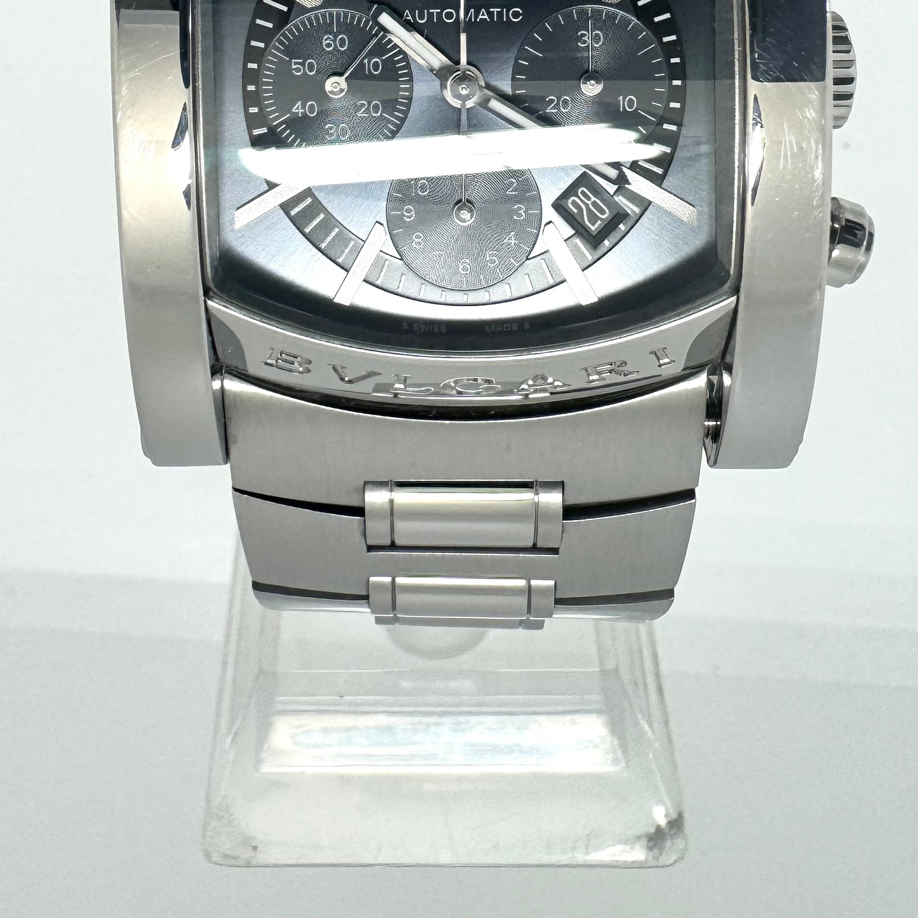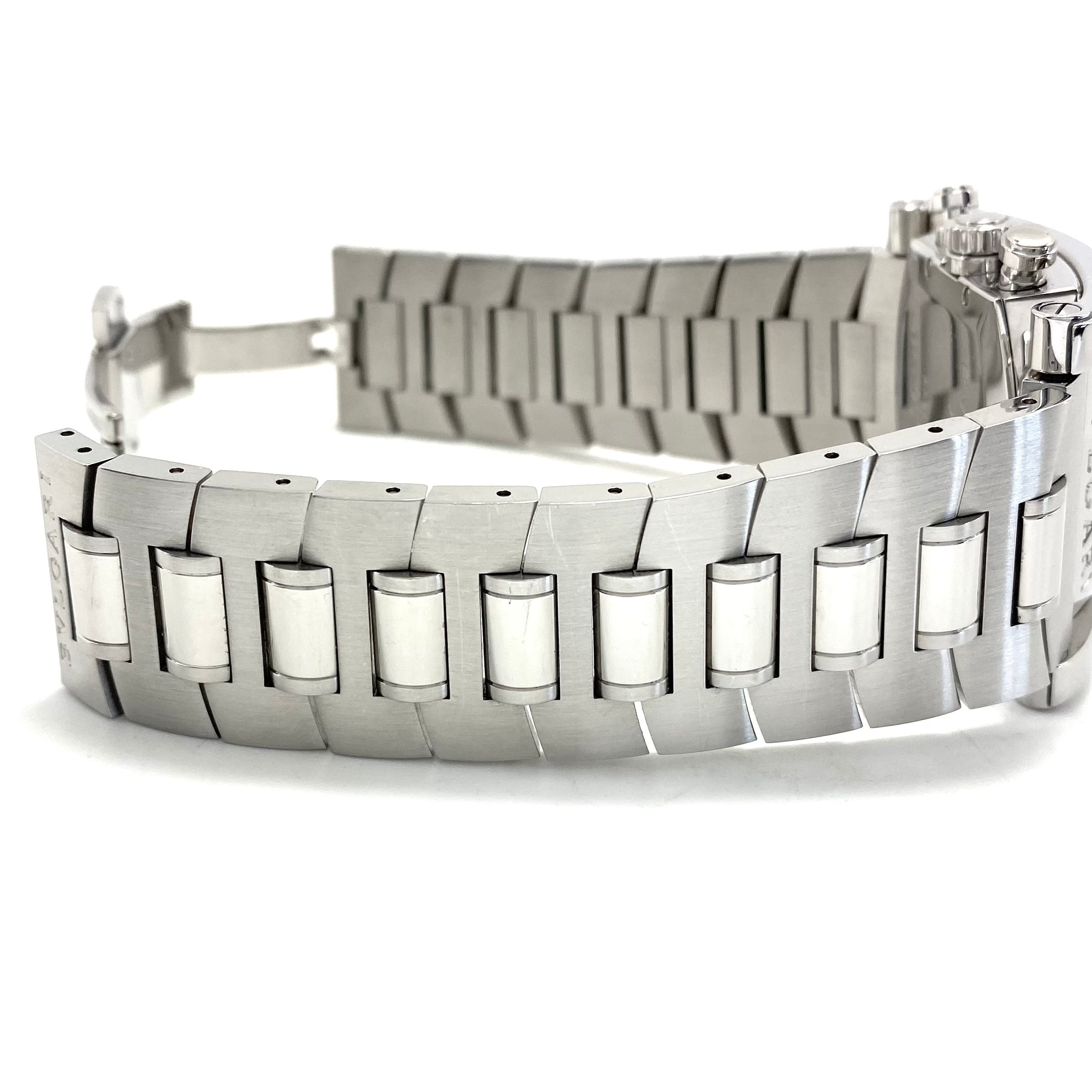 ケース上下に刻まれたBVLGARIロゴが象徴的なアーチ型ベゼル、44mm×34mmの迫力あるサイズ感は、腕元に力強い個性を与えつつも絶妙なバランスで洗練された印象を演出してくれます。またクロノグラフ&デイト表示を搭載し、実用性も兼ね備えたデザインです。