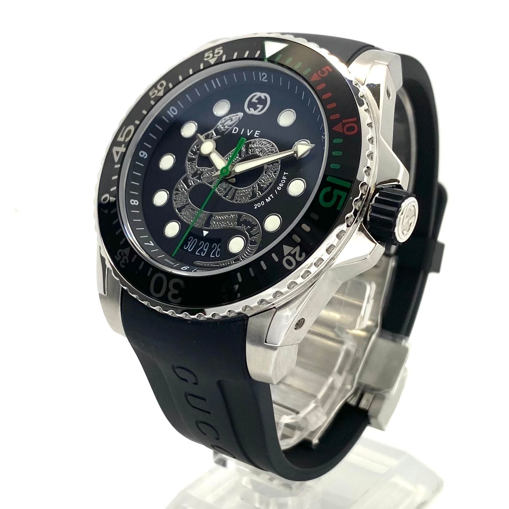 【ほぼ未使用】腕時計 メンズ グッチ GUCCI ダイブ DIVE YA136217 136.2 スネーク 蛇 モチーフ クォーツ 黒 デイト表示 20気圧防水 樹脂ベルト