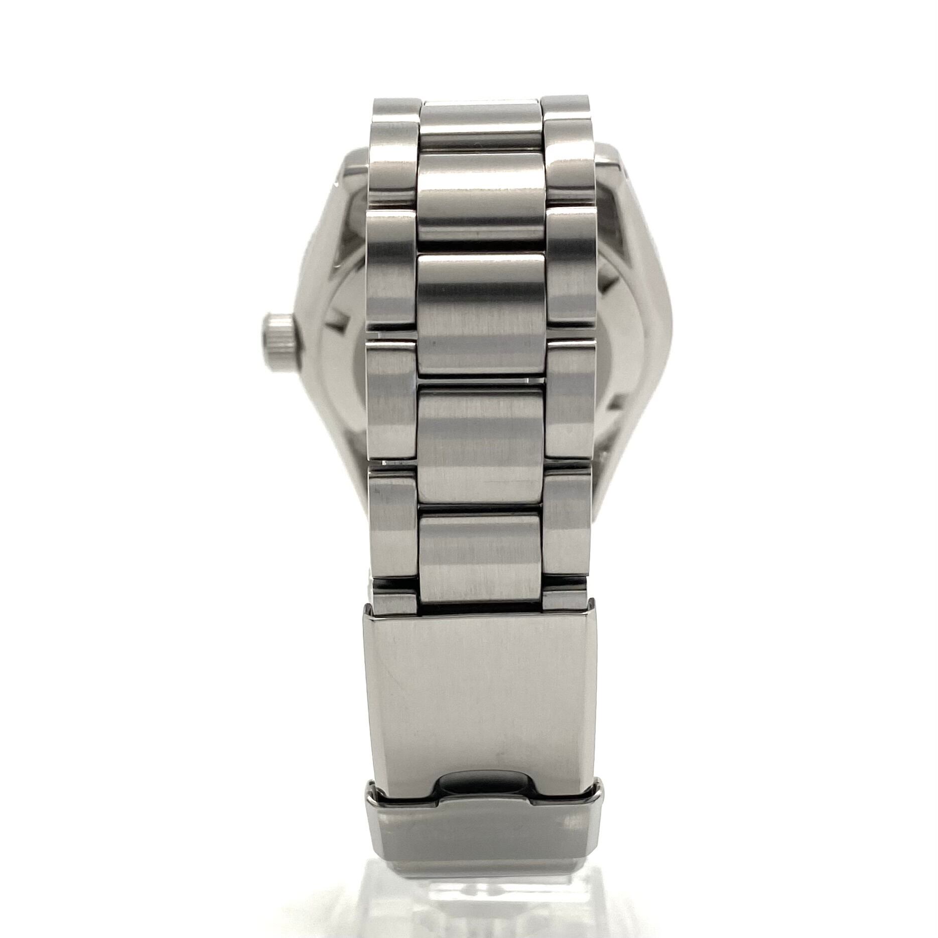 シルバーホワイトのサンレイ文字盤と深みのあるブルーのベゼルが印象的。光を反射して美しく輝く文字盤は、腕元で洗練された存在感を放ちます。ケースはステンレススチール製で、ダイヤシールド加工により日常の小傷からもしっかりガードしてくれます。