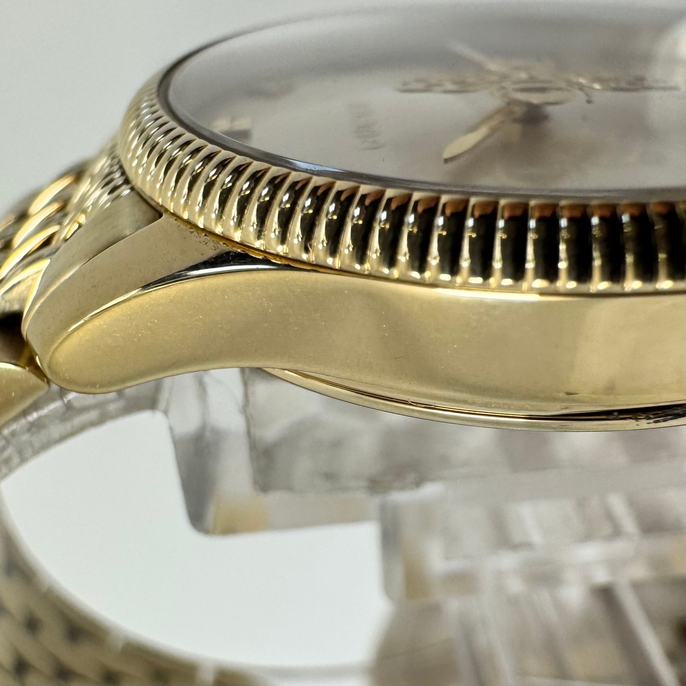 ケースとブレスレットにはイエローゴールドPVDを採用し、リッチで華やかな印象に。文字盤は光の角度で表情を変えるサンブラッシュ仕上げのシルバーダイヤル。秒針の代わりにGUCCIの象徴でもあるビー(蜂)モチーフが舞うように時を刻み、フェミニンで遊び心あふれるデザインに仕上がっています。