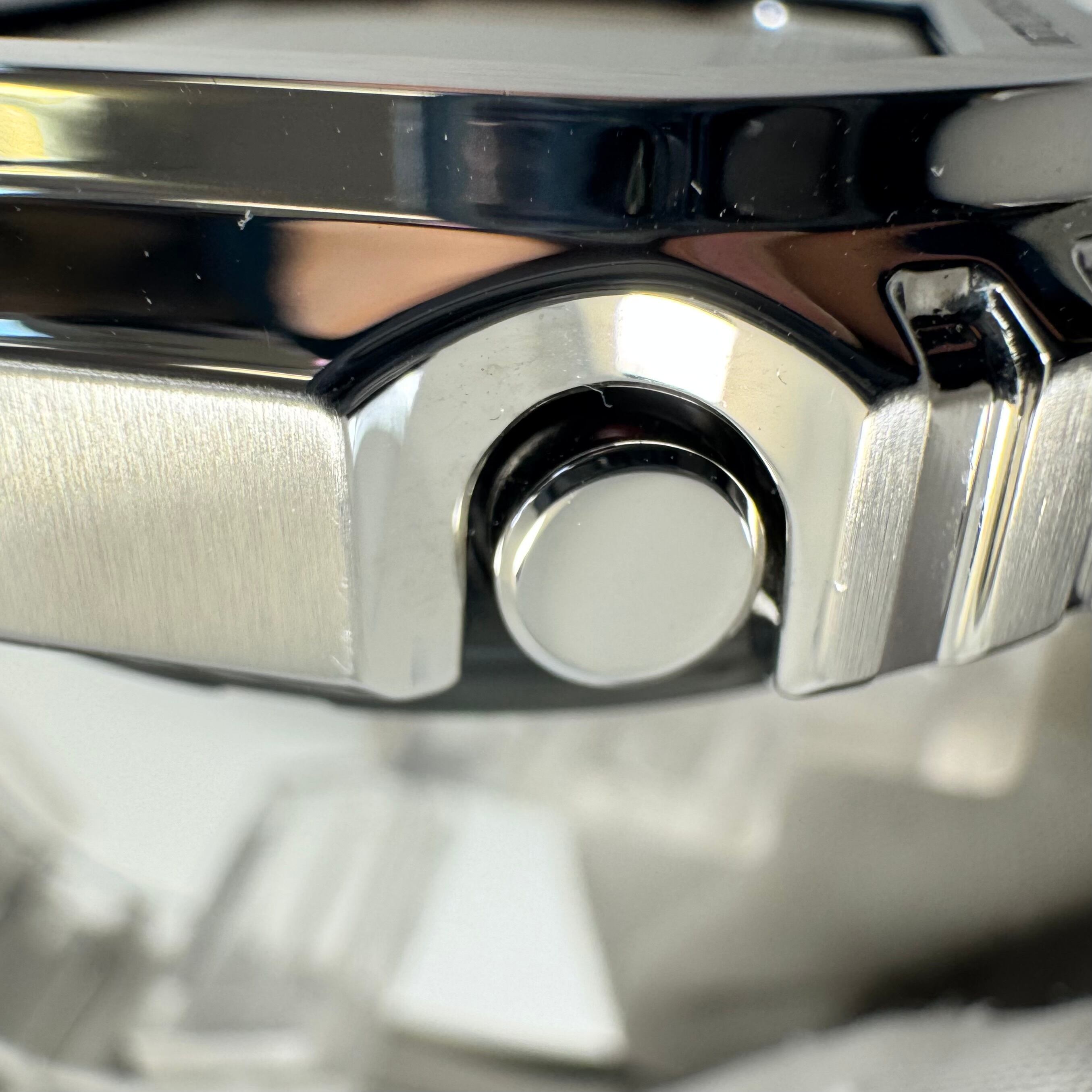またベゼルやケースには繊細なヘアライン仕上げとポリッシュ加工が施され、見る角度によって異なる表情を見せる高級感あるデザインとなっています。