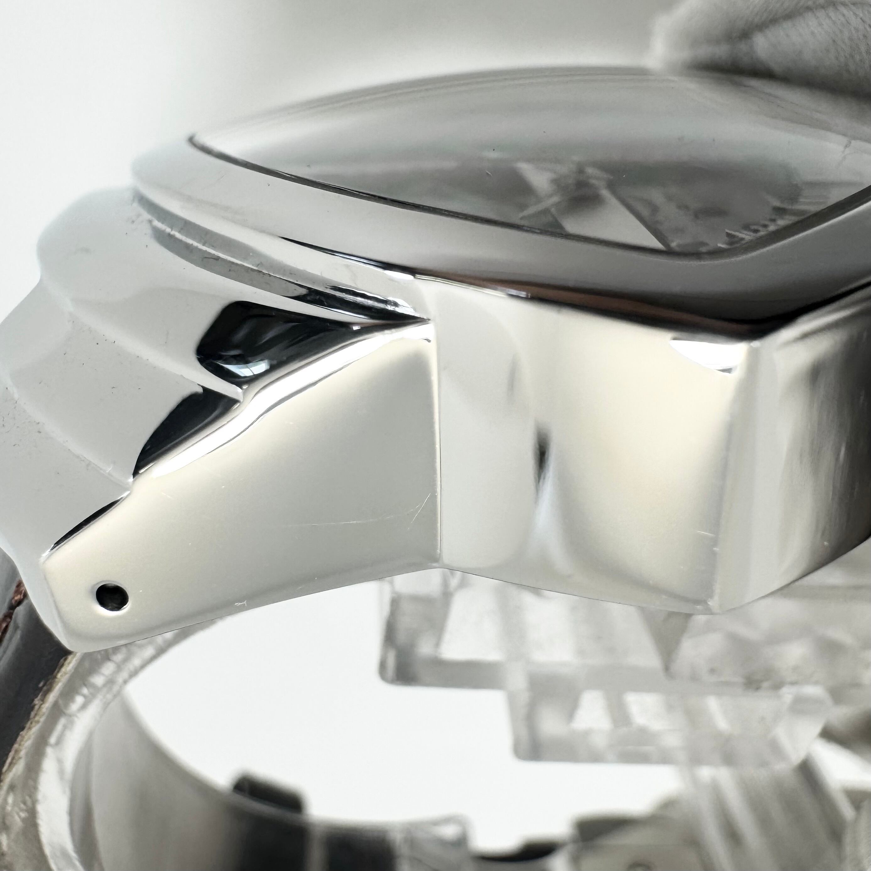 ポリッシュ仕上げのステンレススチールケースに、滑らかなカーフレザーベルトを組み合わせた構成は、クラシックとモダンが見事に融合。独創的な三角ケースが手首に個性と品格を与え、まさに“人と違う”ことを楽しむ大人のための一本です。