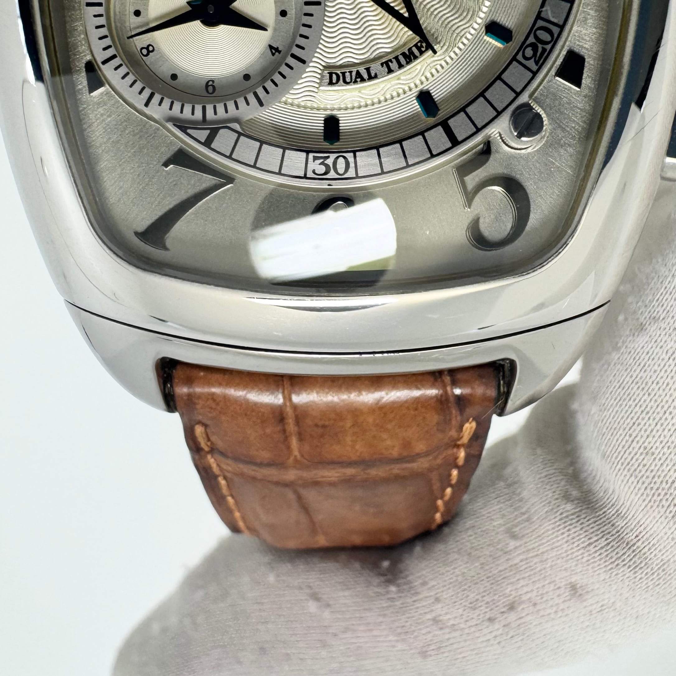 ムーブメントには高精度クォーツを搭載し、2都市の時刻を同時に表示できるデュアルタイム機能を装備。ビジネスや海外旅行でも頼れる実用性を備えています。