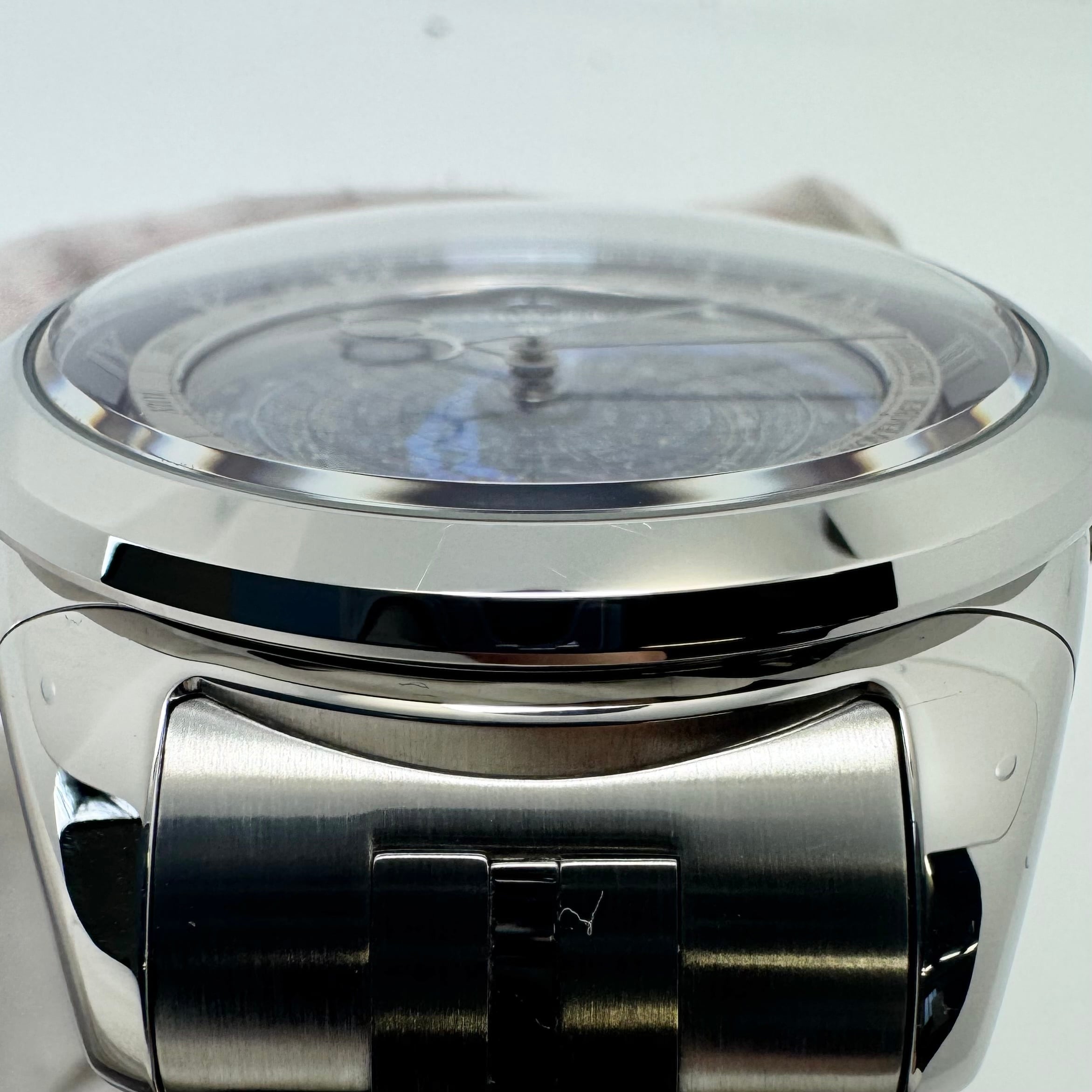 ドーム状に仕上げられた球面サファイアガラス(クラリティ・コーティング採用)は反射を抑え、星座盤の視認性を飛躍的に高めています。ブルー文字盤が深海のような静寂と高級感を演出し、精緻なメタルケースとの調和が腕元に特別な存在感をもたらします。