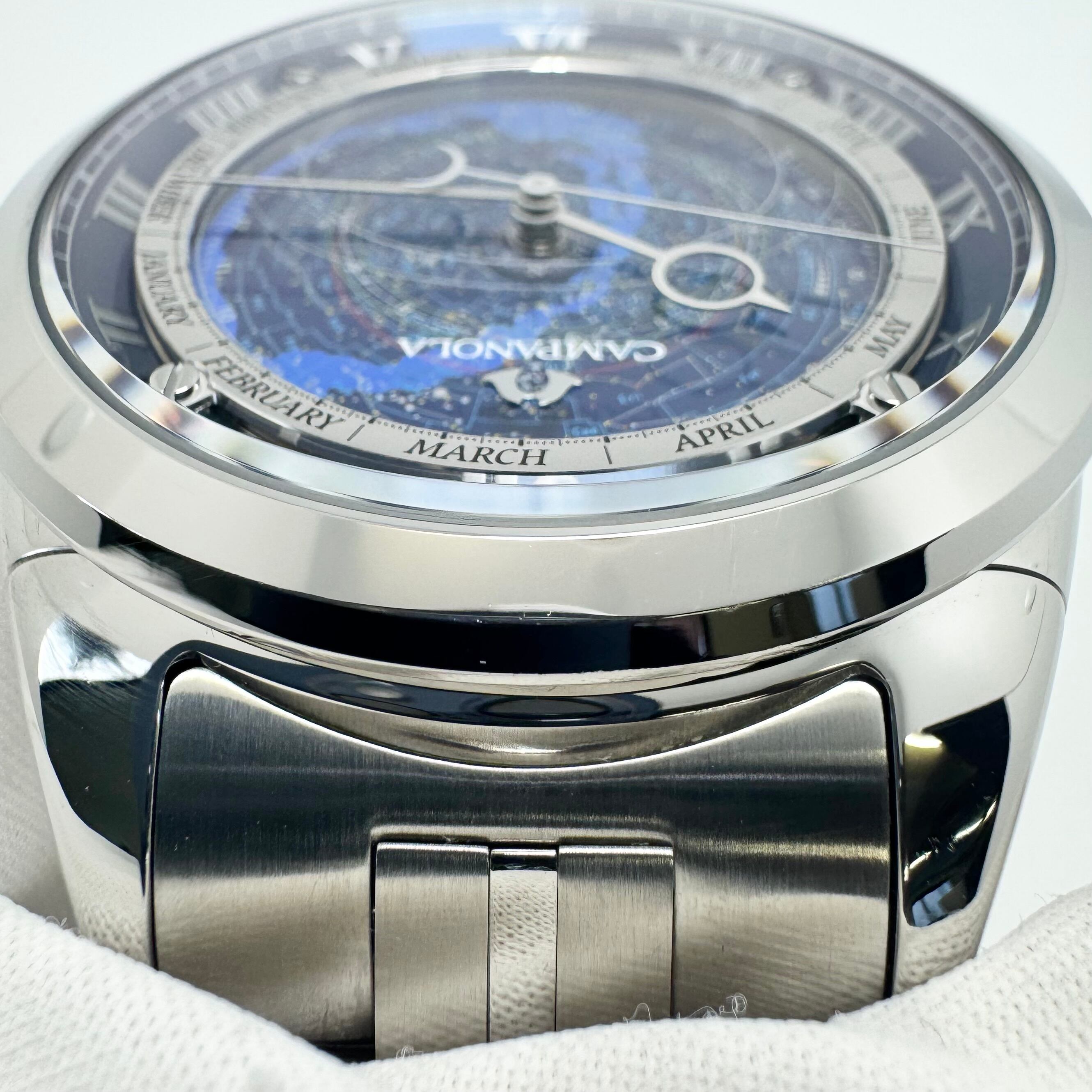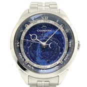 北緯35度で観測可能な全天星座を、4.8等星以上の恒星1,027個・星雲・星団166個を14枚の版を重ねてリアルに表示。時刻に合わせて文字盤が逆回転し、“現在の星の配置”をそのまま腕元に映し出します。