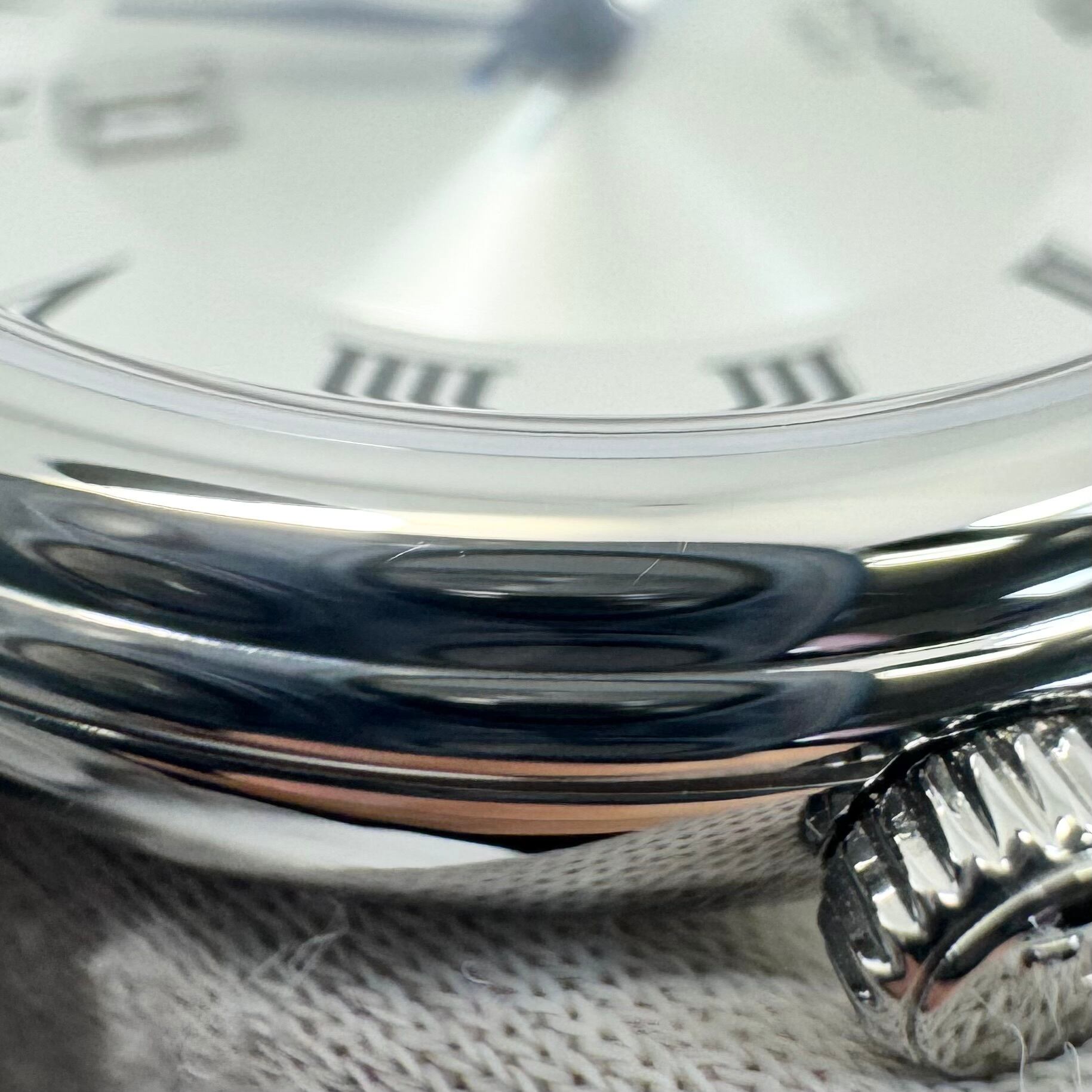 柔らかな曲線を描くケースに、美しいサンレイ仕上げのシルバーダイヤル、そしてローマンインデックスを組み合わせた上品なデザイン。どんなシーンにもマッチするタイムレスな美しさが魅力です。