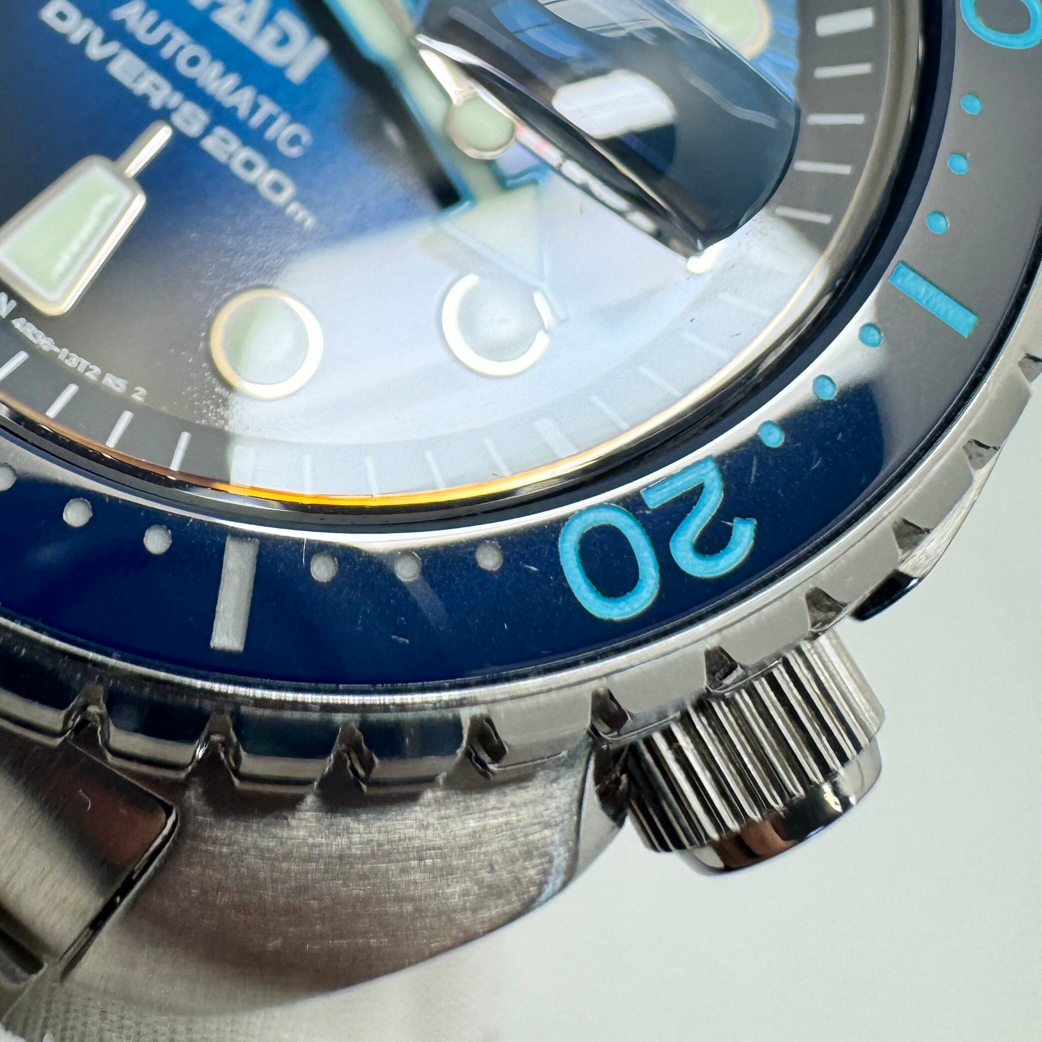 深い海を思わせるブルーグラデーションダイヤルと、PADIカラーを象徴するライトブルーの差し色。視認性・機能性・デザイン性を高次元で融合した、まさに“海のプロ”のためのダイバーズモデルです。