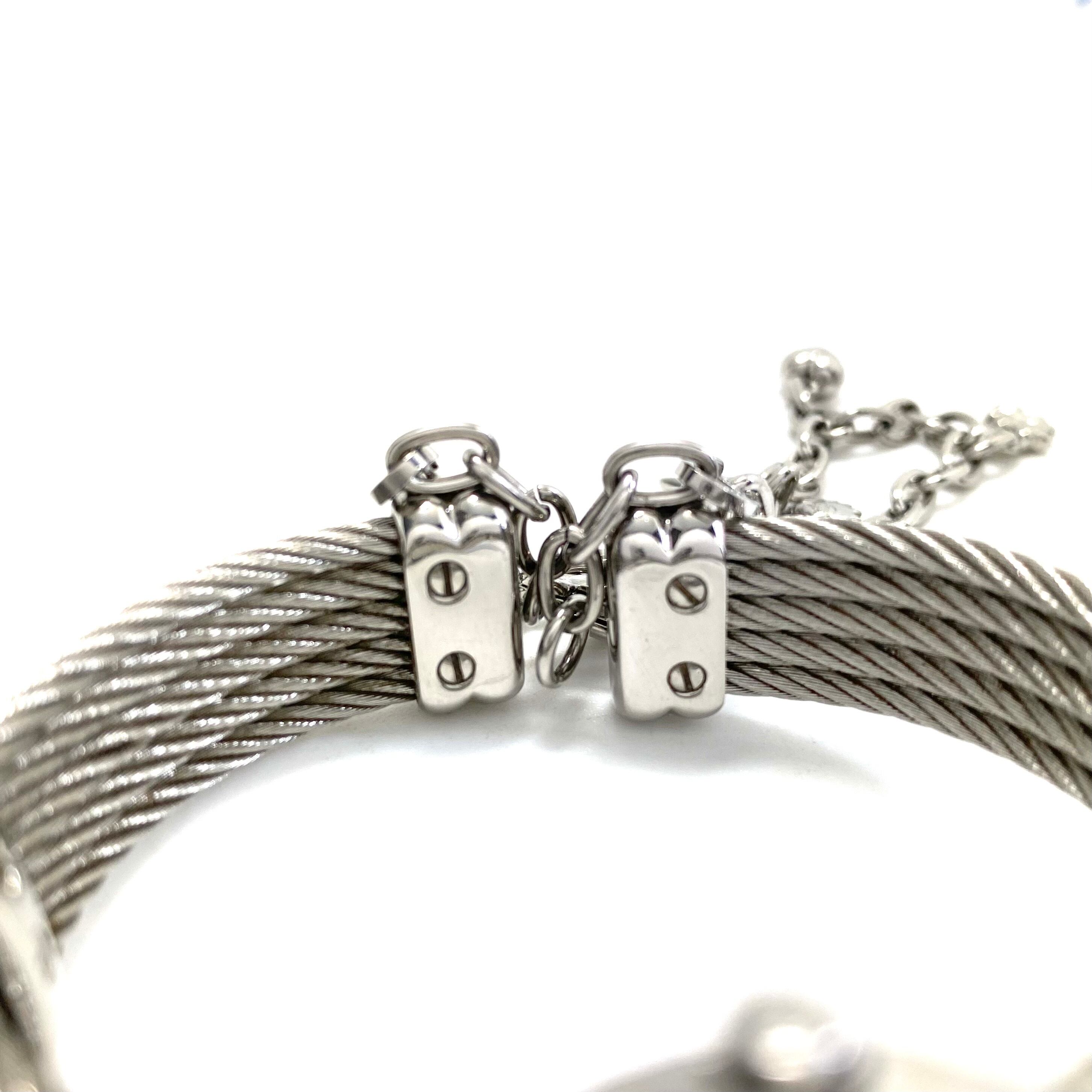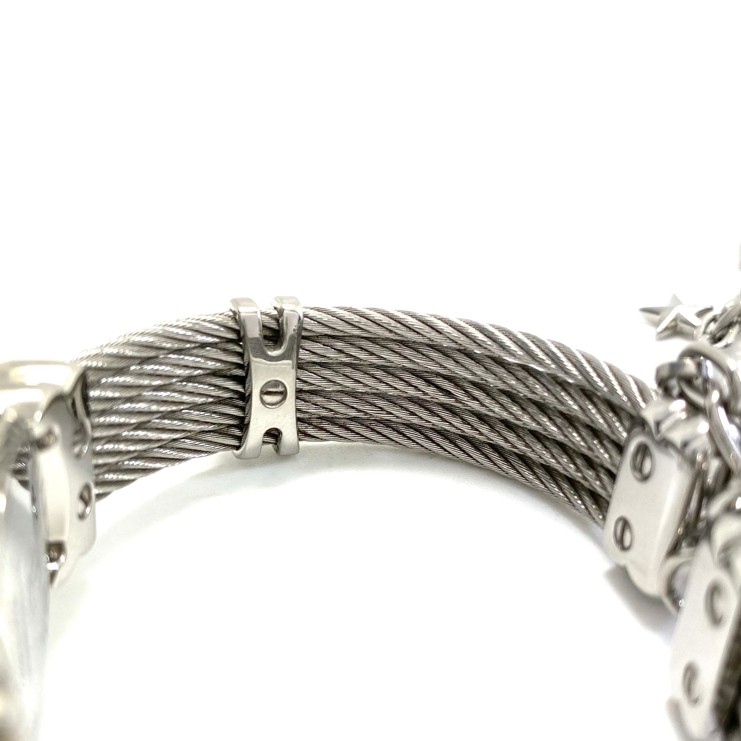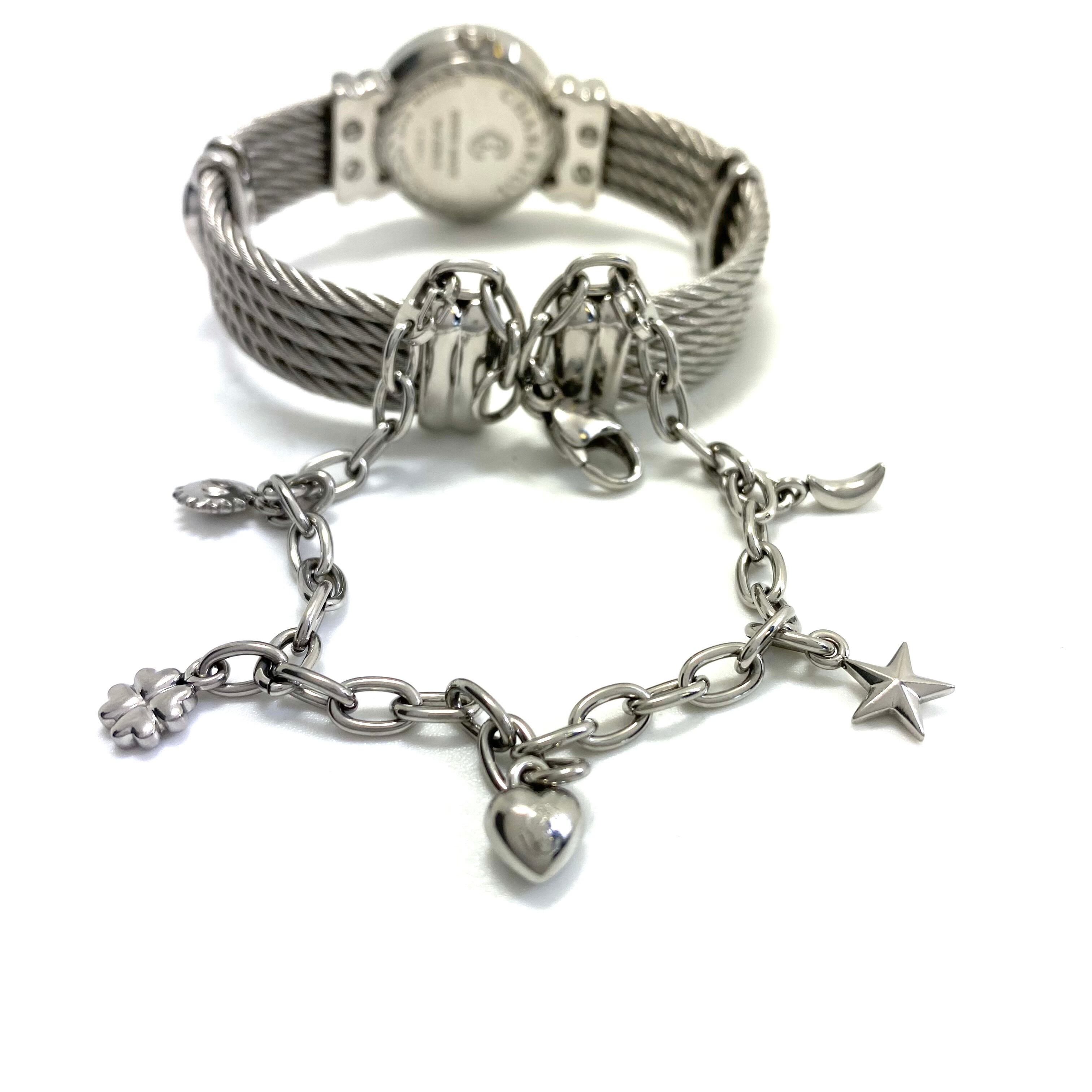 シャリオールならではのバングルブレスは、まるでブレスレットそのものを腕に纏うようなエレガントなデザイン。しなやかにフィットし、華奢な手首をより美しく見せてくれます。ベルトをつなぐチェーンにあしらわれたハートや星などのチャームがより一層女性らしさを引き立てます。