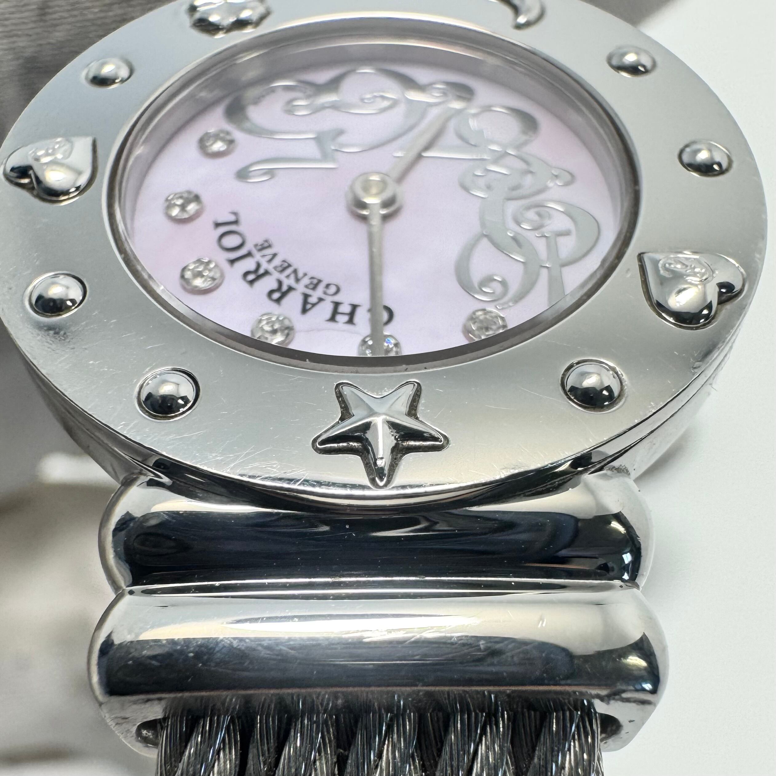 シャリオールの中でも圧倒的な人気を誇る「サントロペ」シリーズより、可憐な光を放つピンクシェル文字盤モデル 028/2(01983H)が入荷されました。