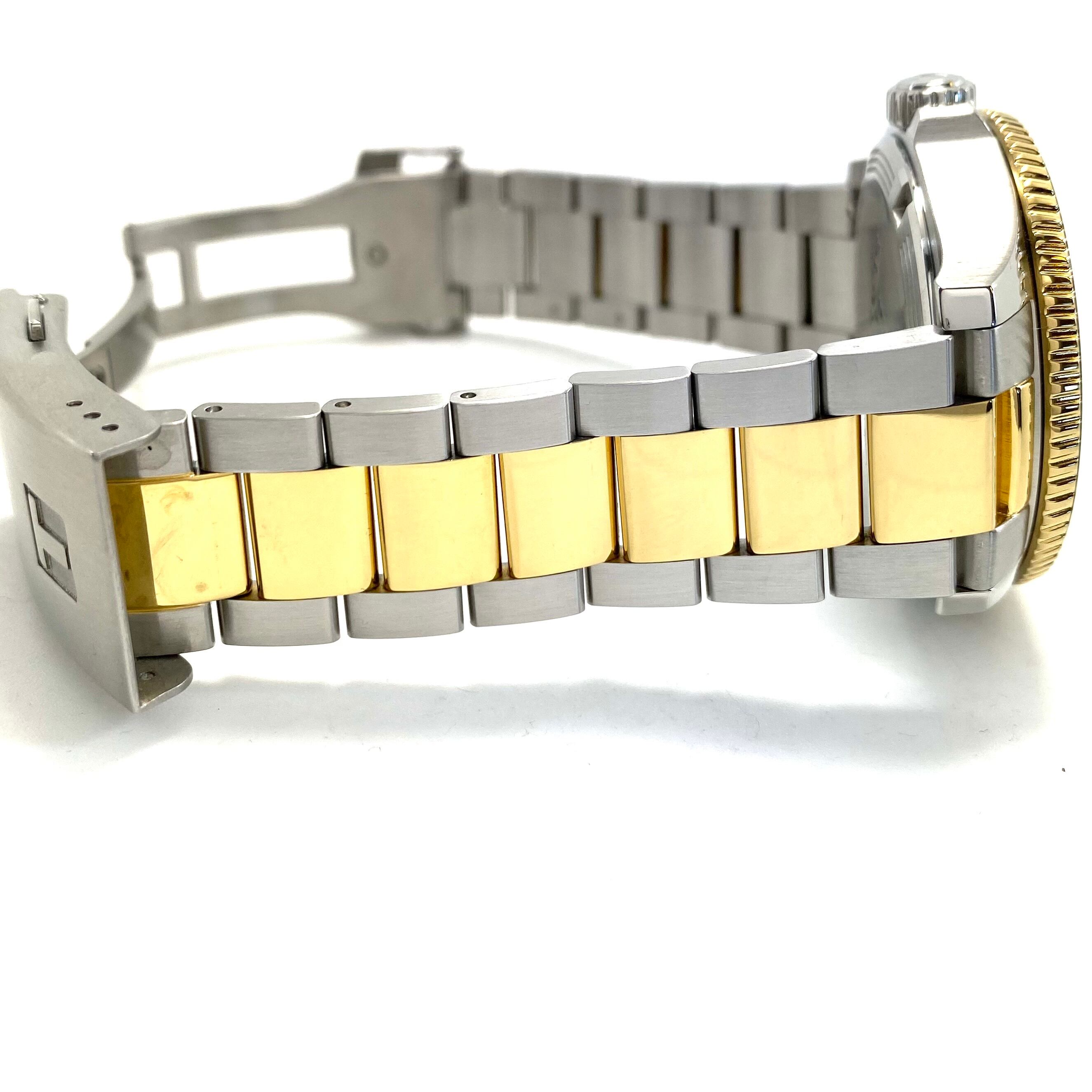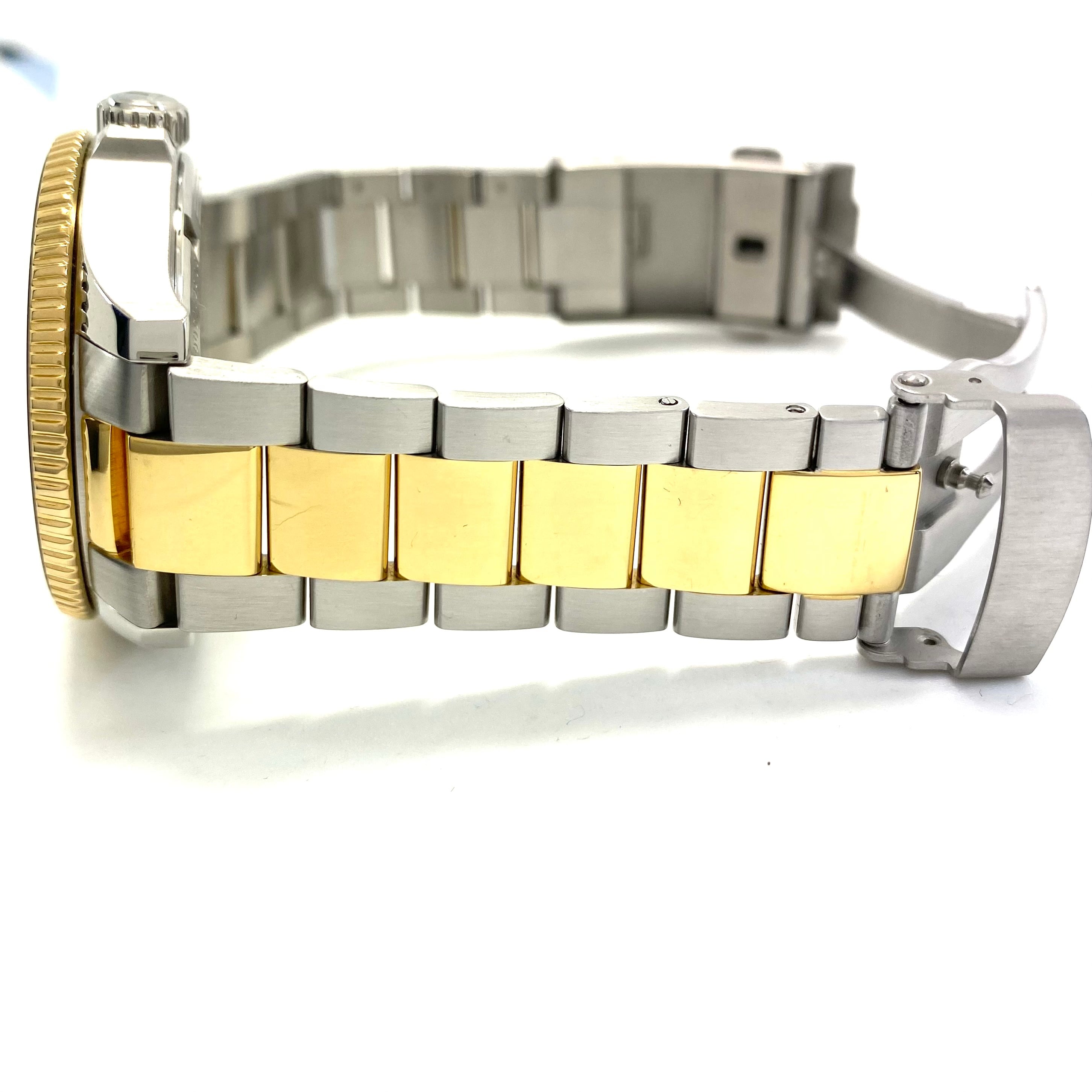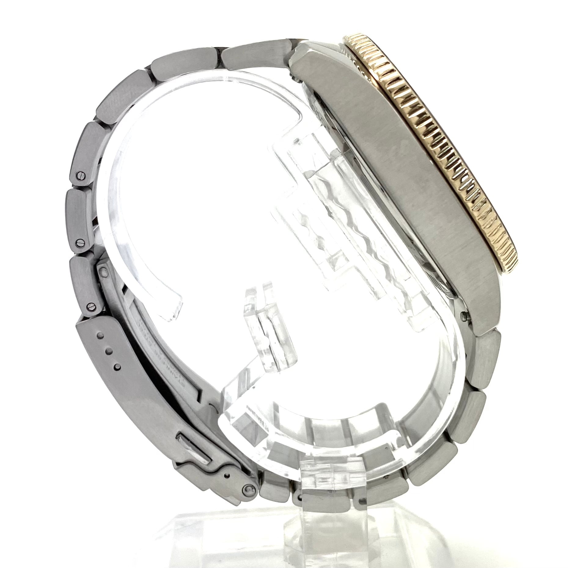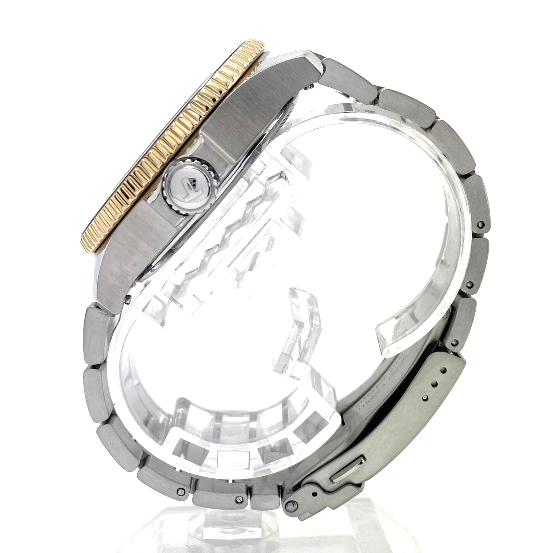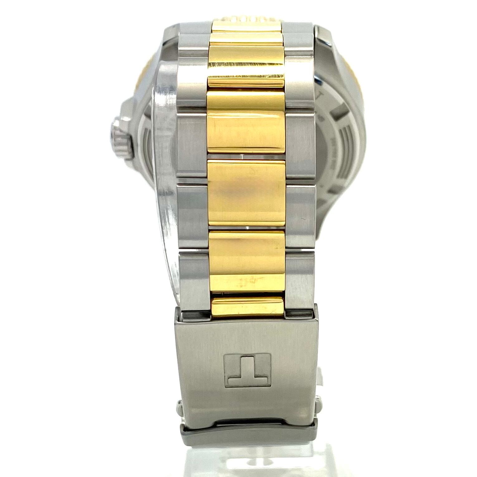 30気圧(300m)防水の本格ダイバーズ性能に加え、GMT針を搭載したマルチユース仕様。ブラック文字盤とイエローゴールドPVDのツートンカラーが、スポーティーでありながら高級感のある存在感を手元に与えます。