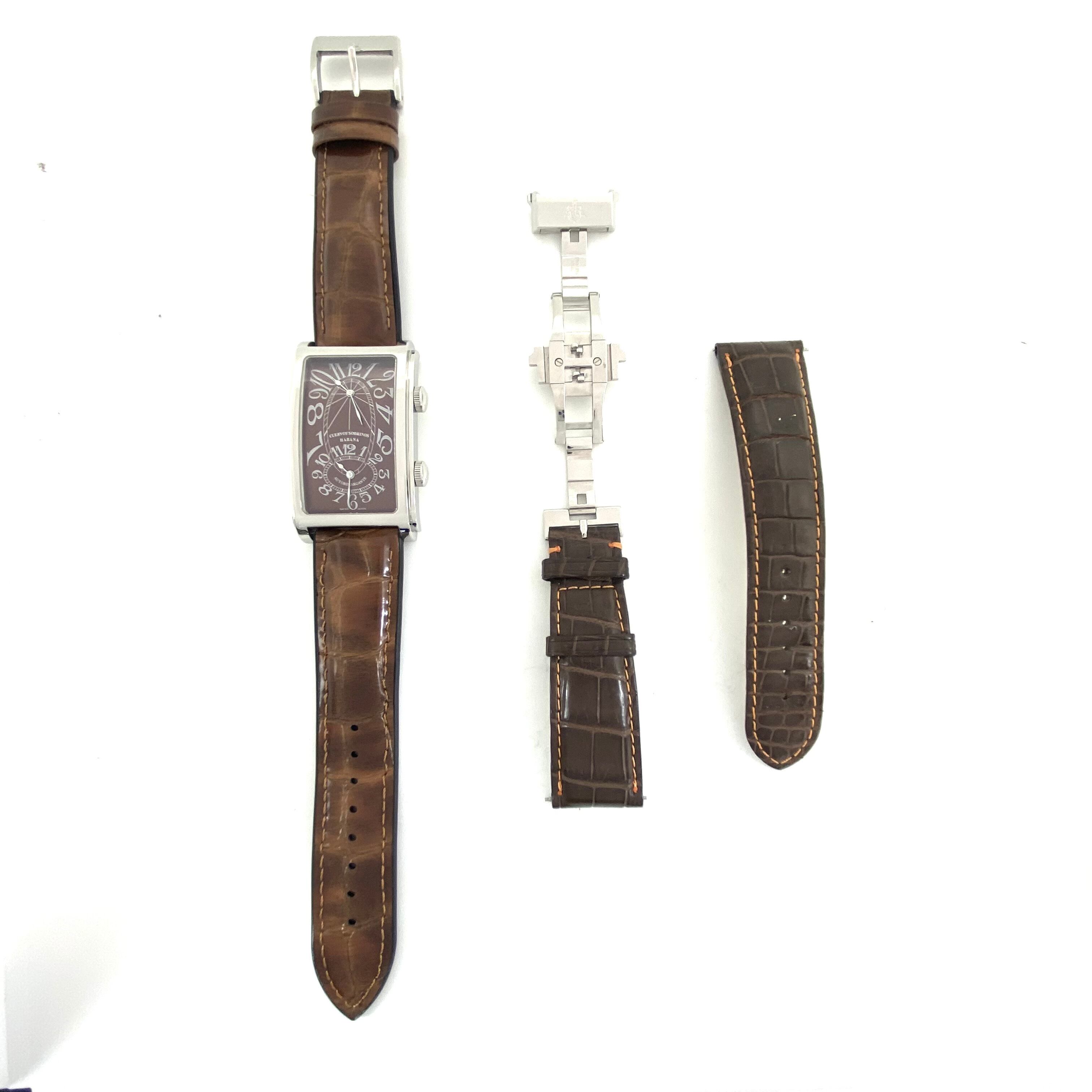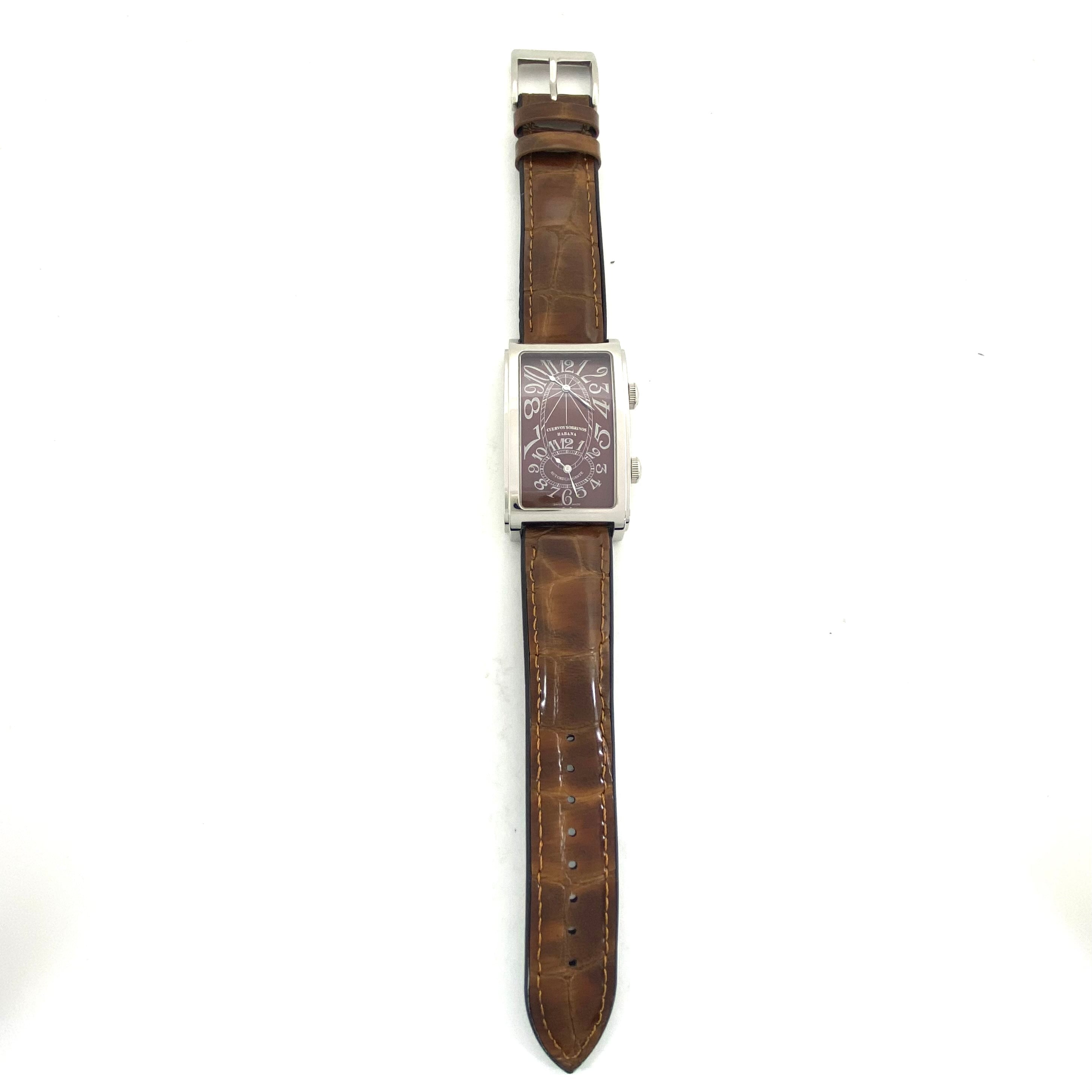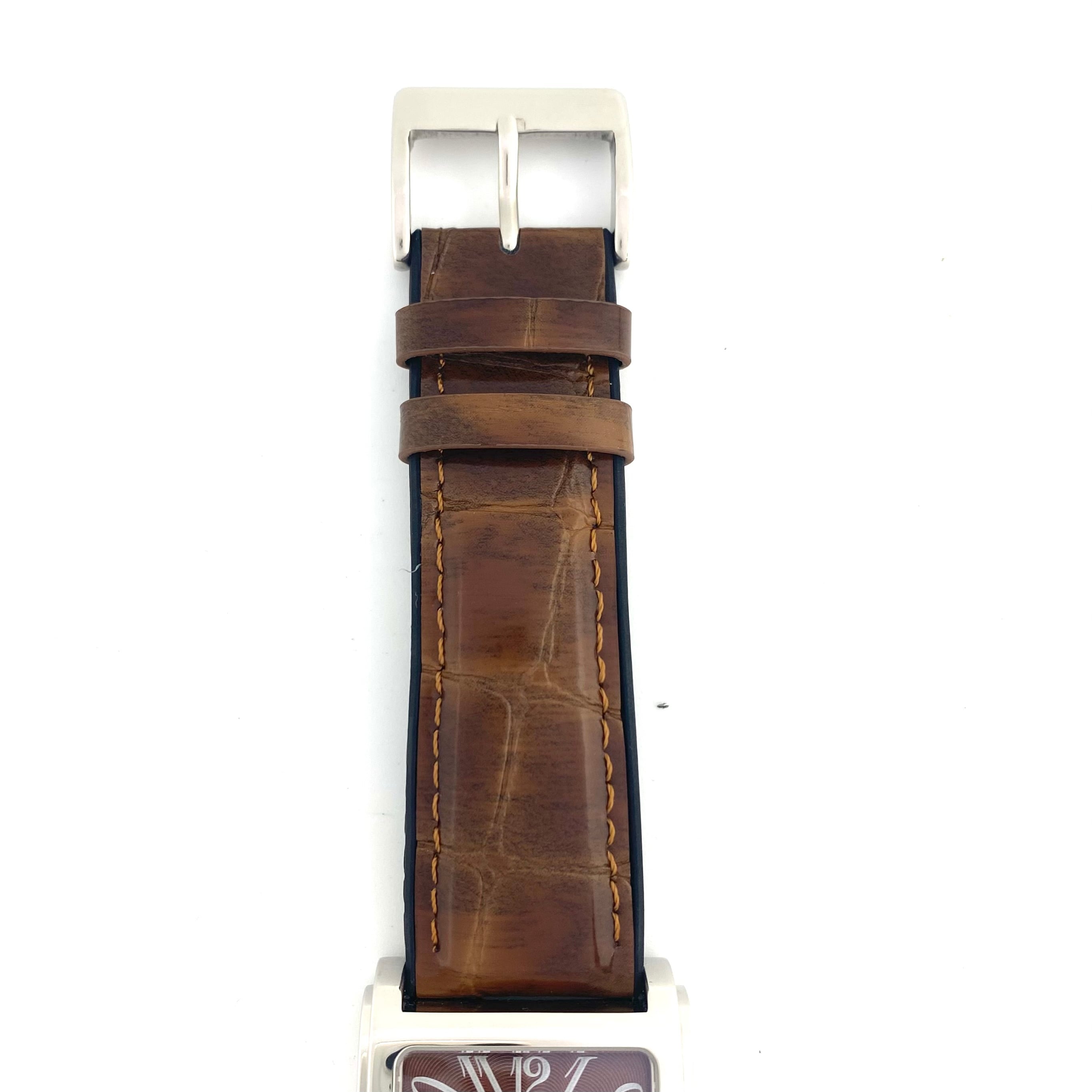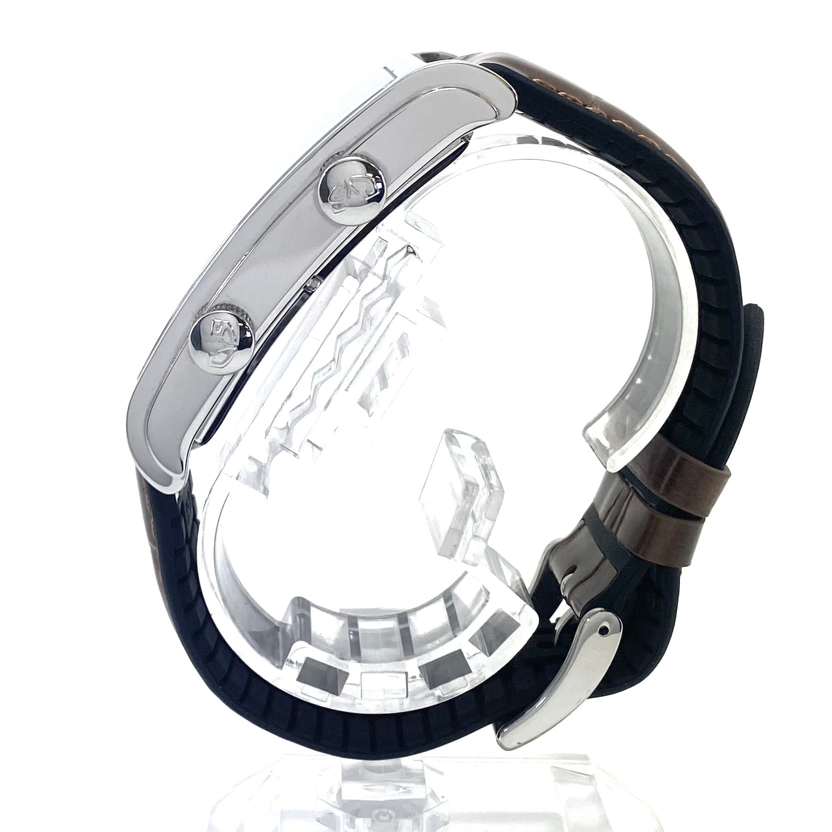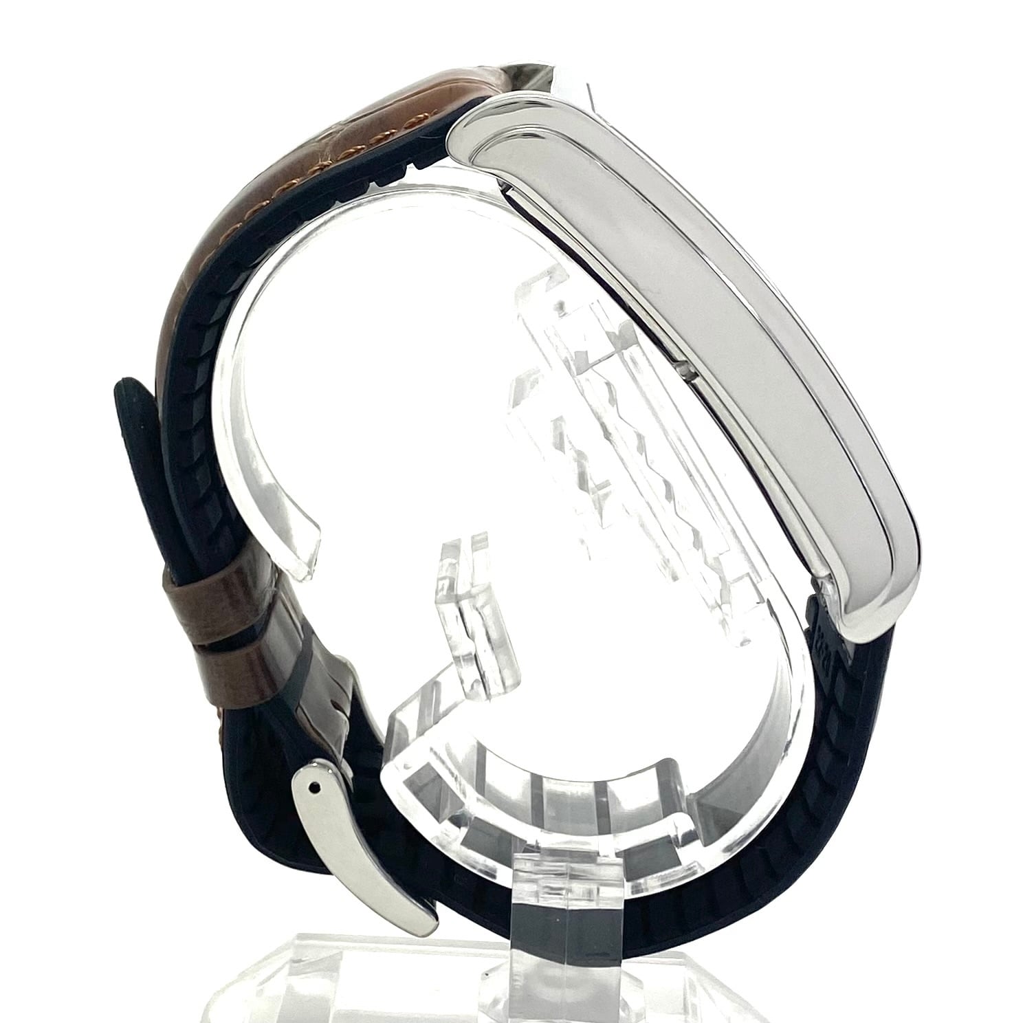 クラシカルかつ色気のあるブラウン文字盤に、カーブを描くレクタンギュラーケースが非常に印象的。第二時間帯を表示できるデュアルタイム機構を備え、実用性とデザイン性を高次元で両立しています。