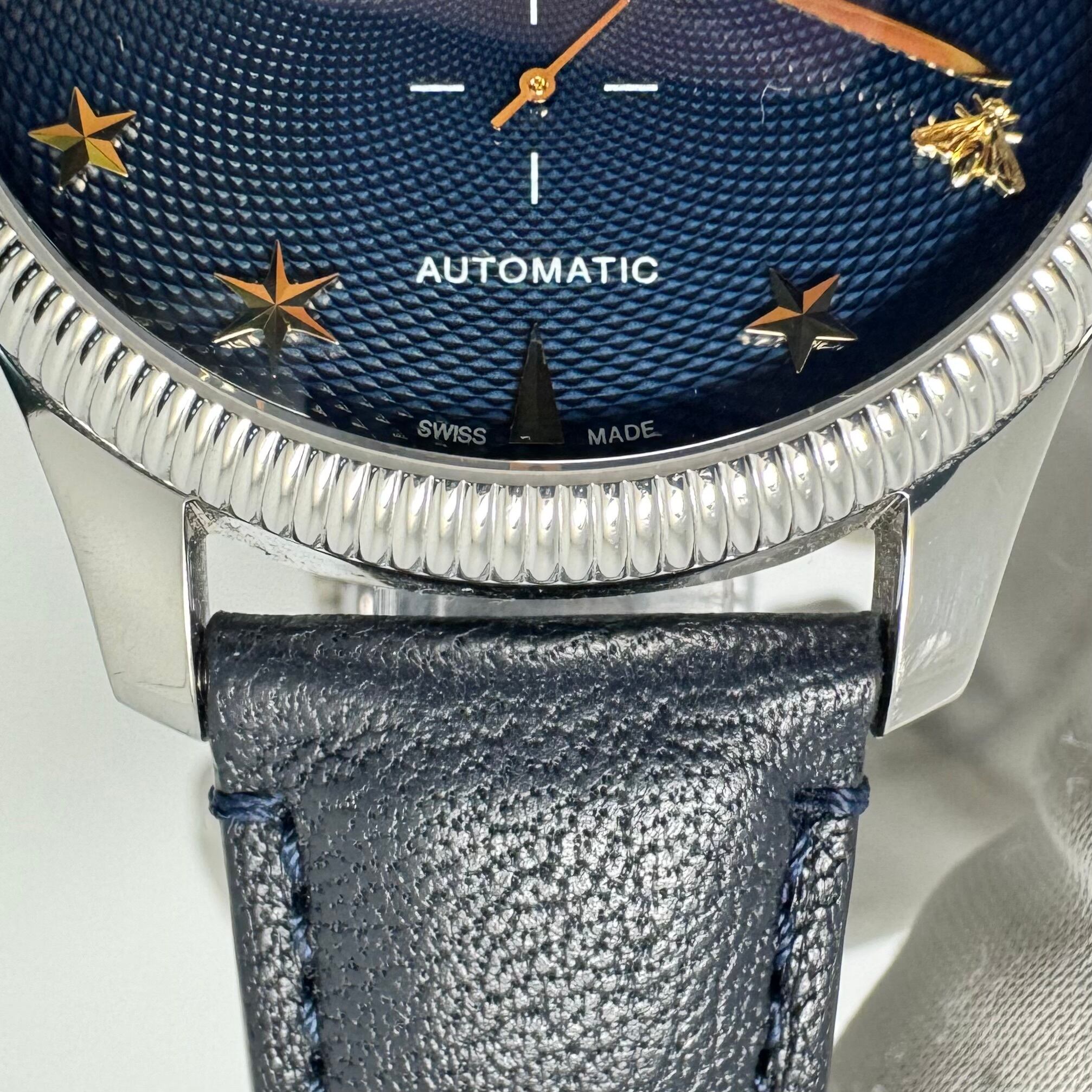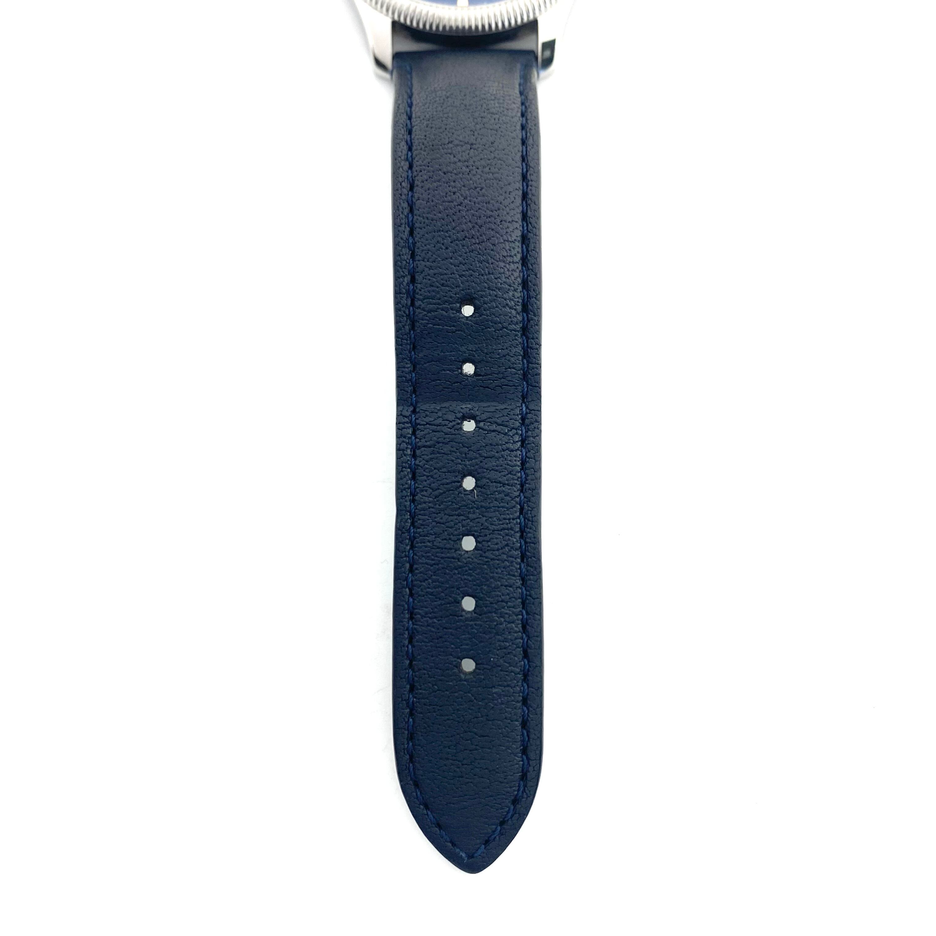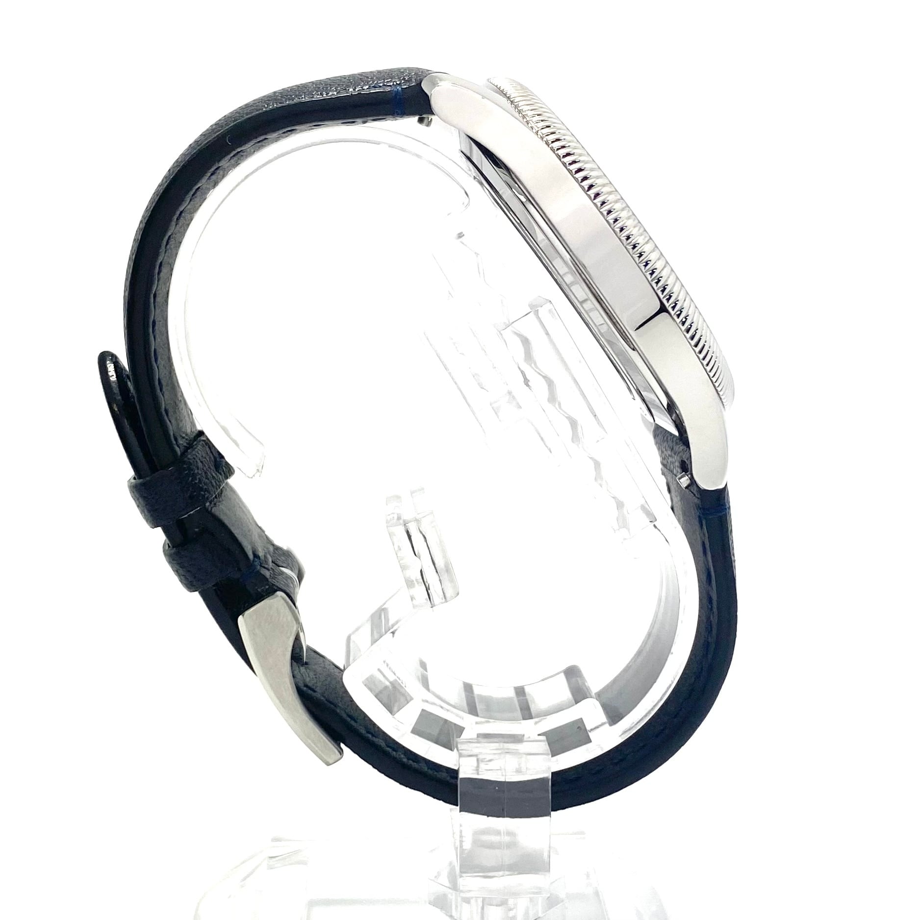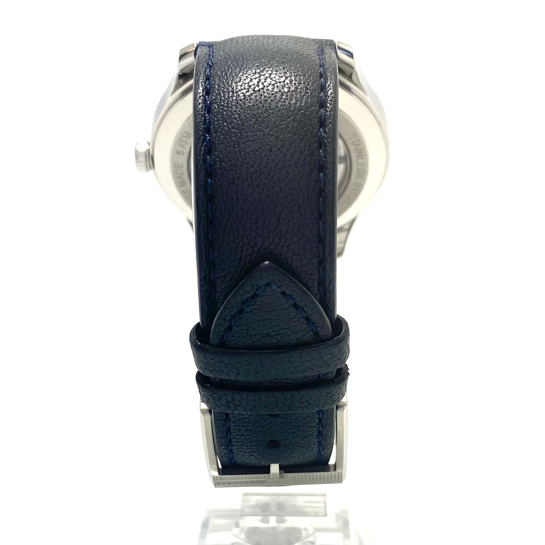 深みのあるネイビーダイヤルにゴールドトーンの針・インデックスを組み合わせた、上品かつ洗練されたデザインが魅力。