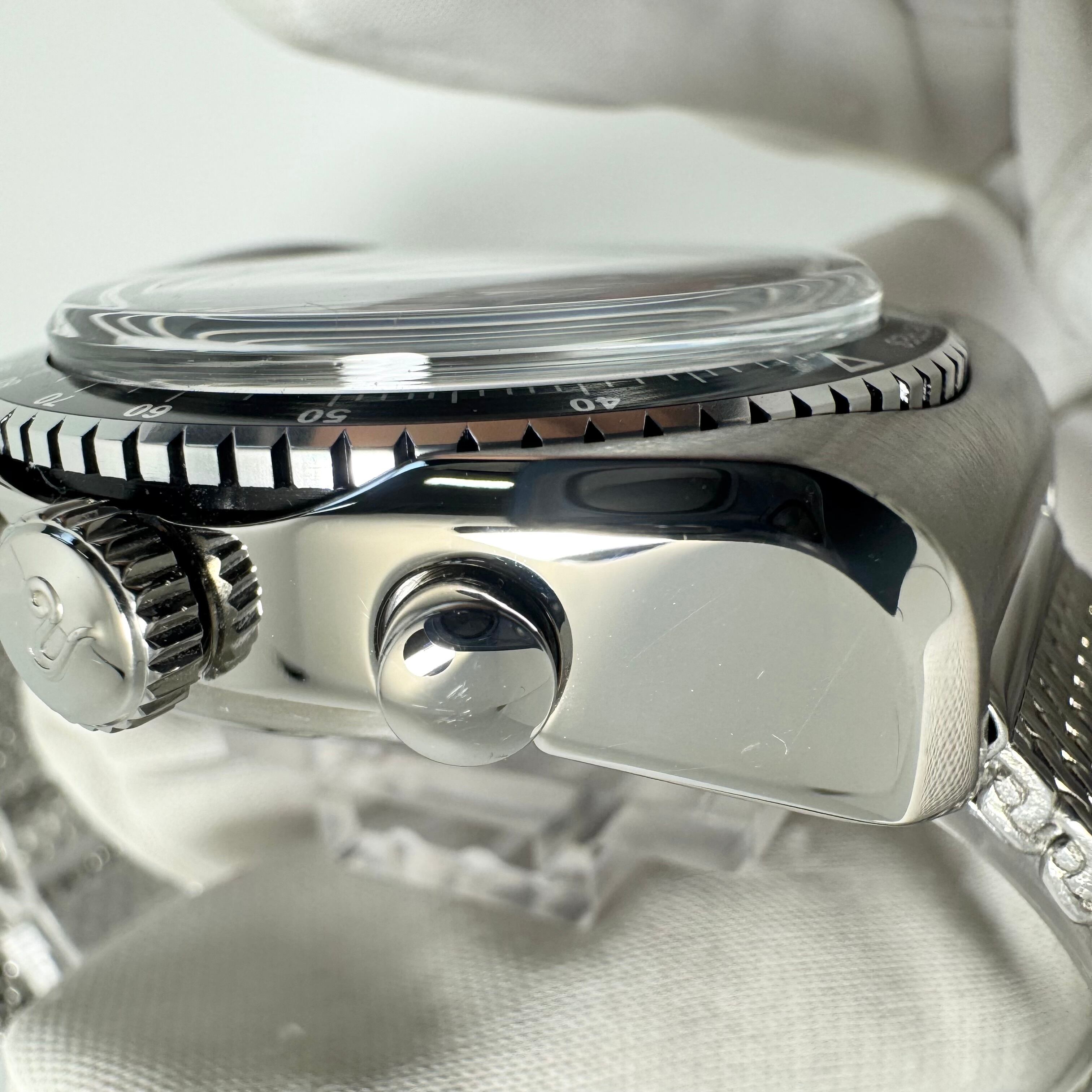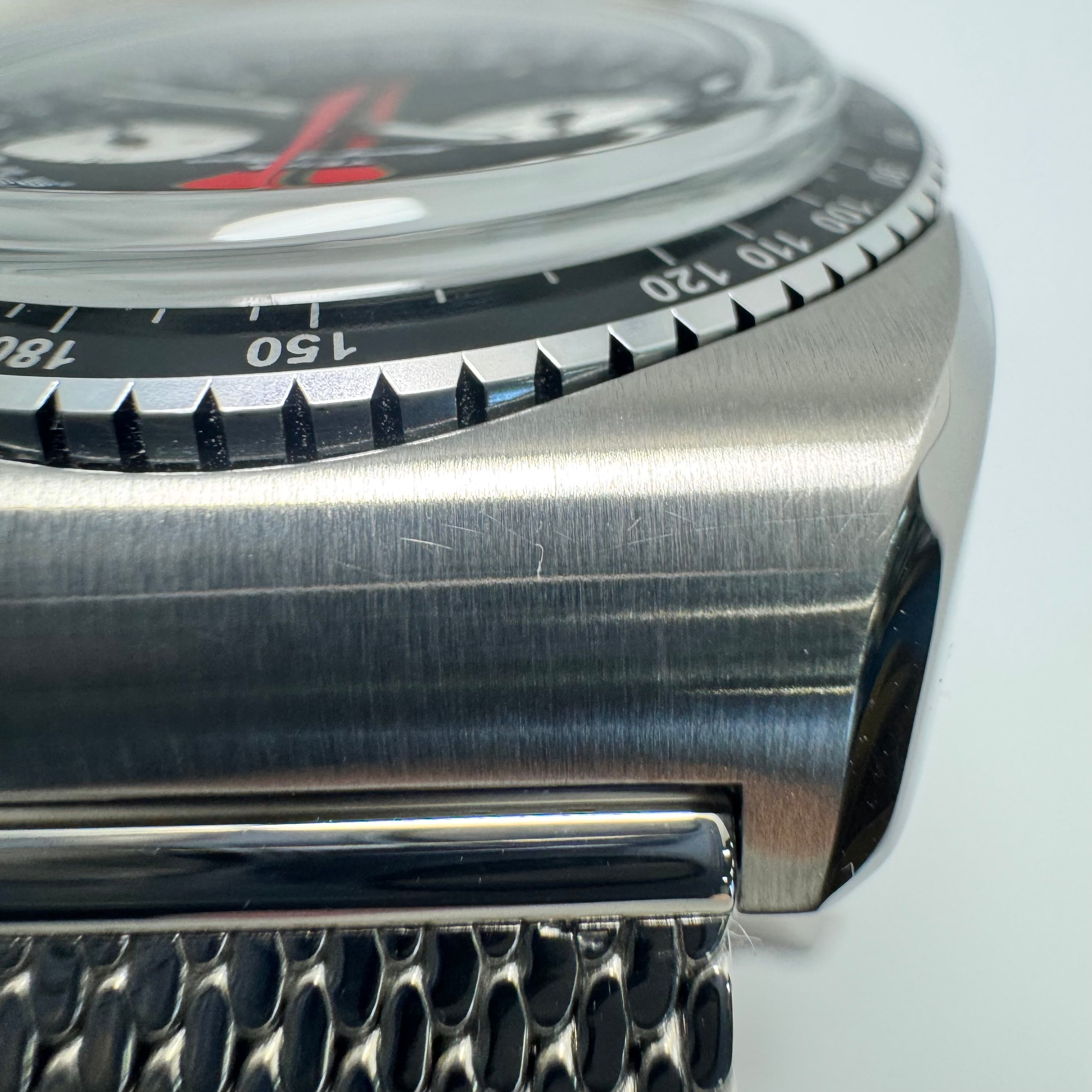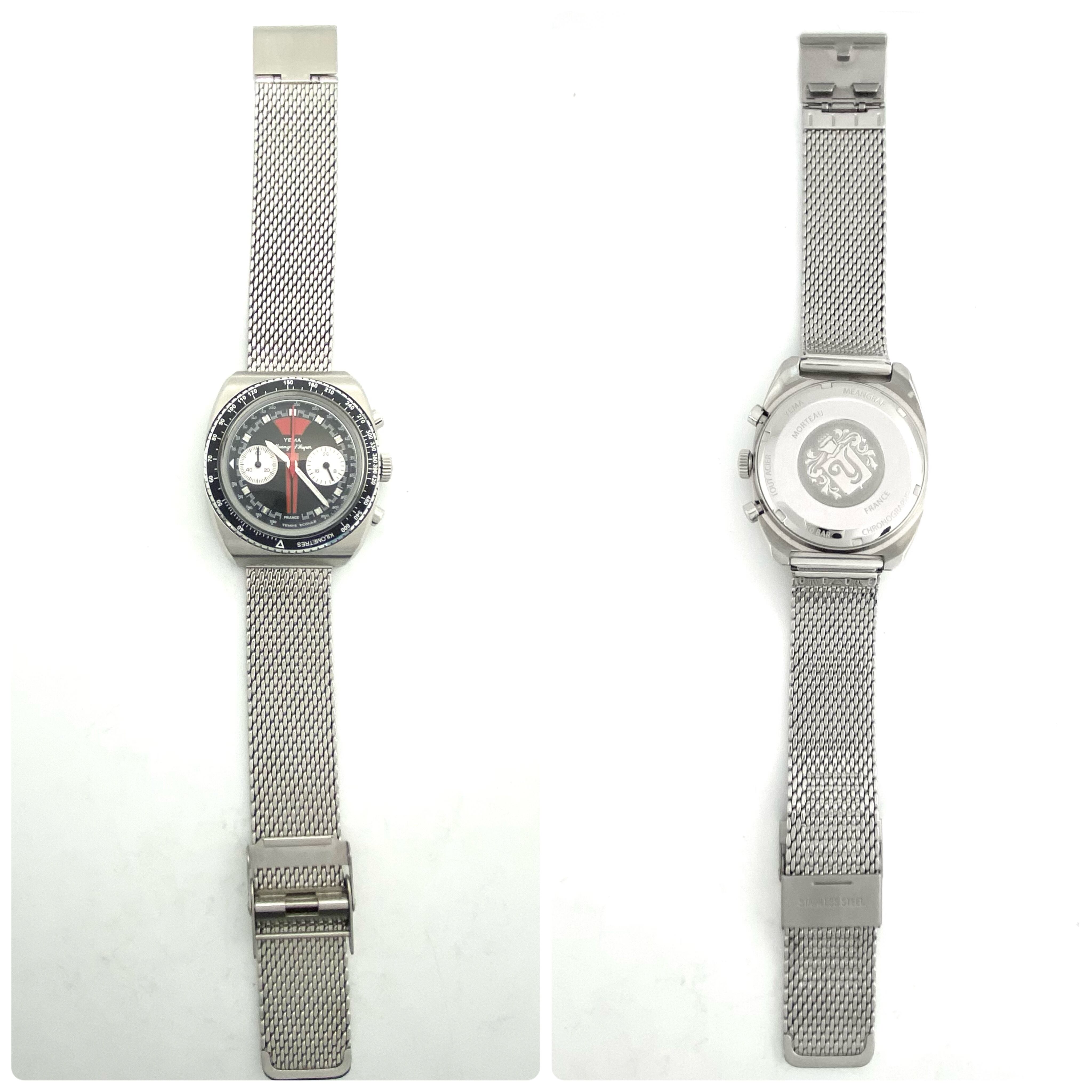 1950〜70年代のレーシングクロノグラフを彷彿とさせるレトロなデザインに、ブラックダイヤルとクロノグラフ配置が映える一本。