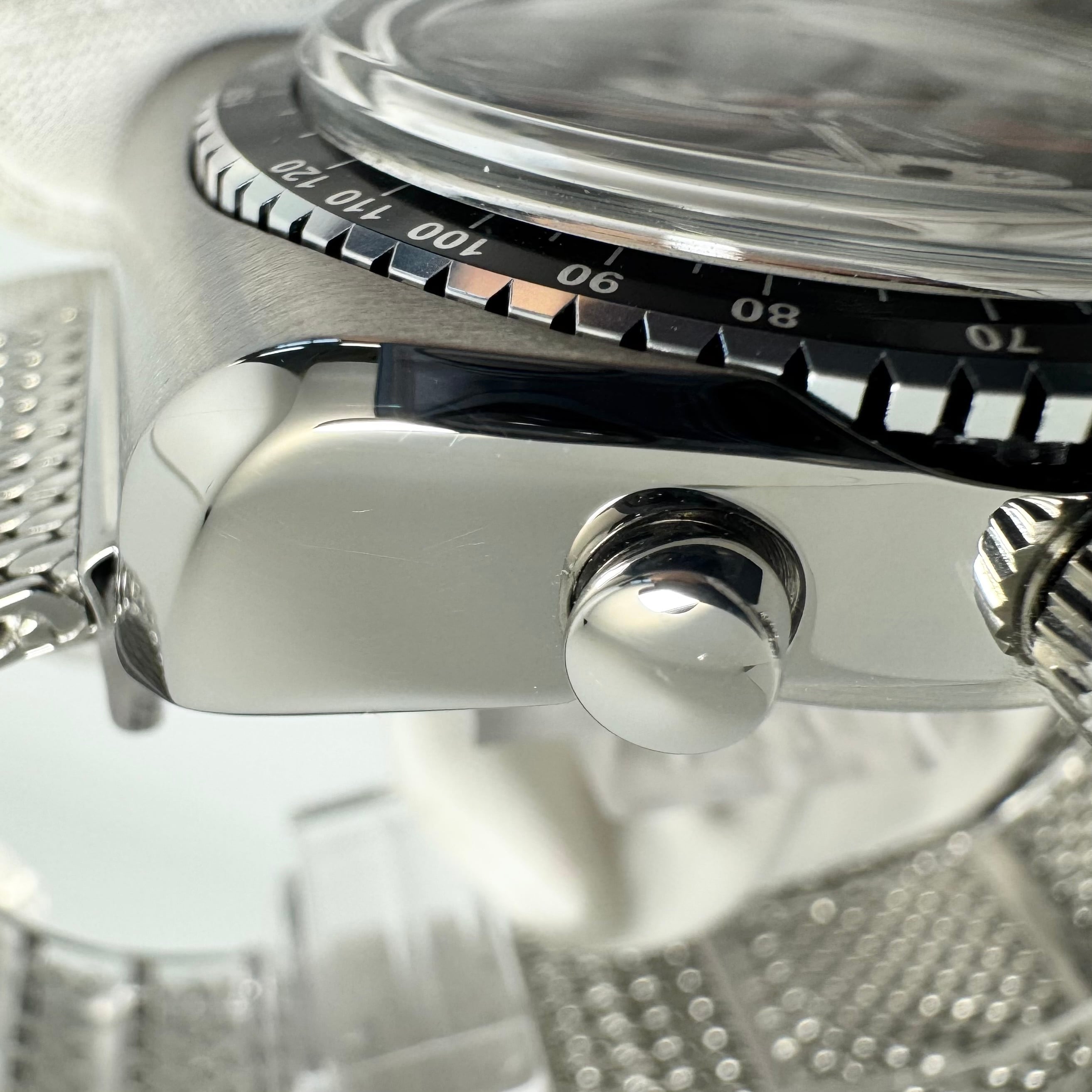 ムーブメントには セイコー製 VK64 メカクォーツ を搭載。クォーツならではの高精度と、クロノグラフ作動時は機械式のような滑らかな針の動きを楽しめます。電池式のため扱いやすく、日常使いにも安心です。