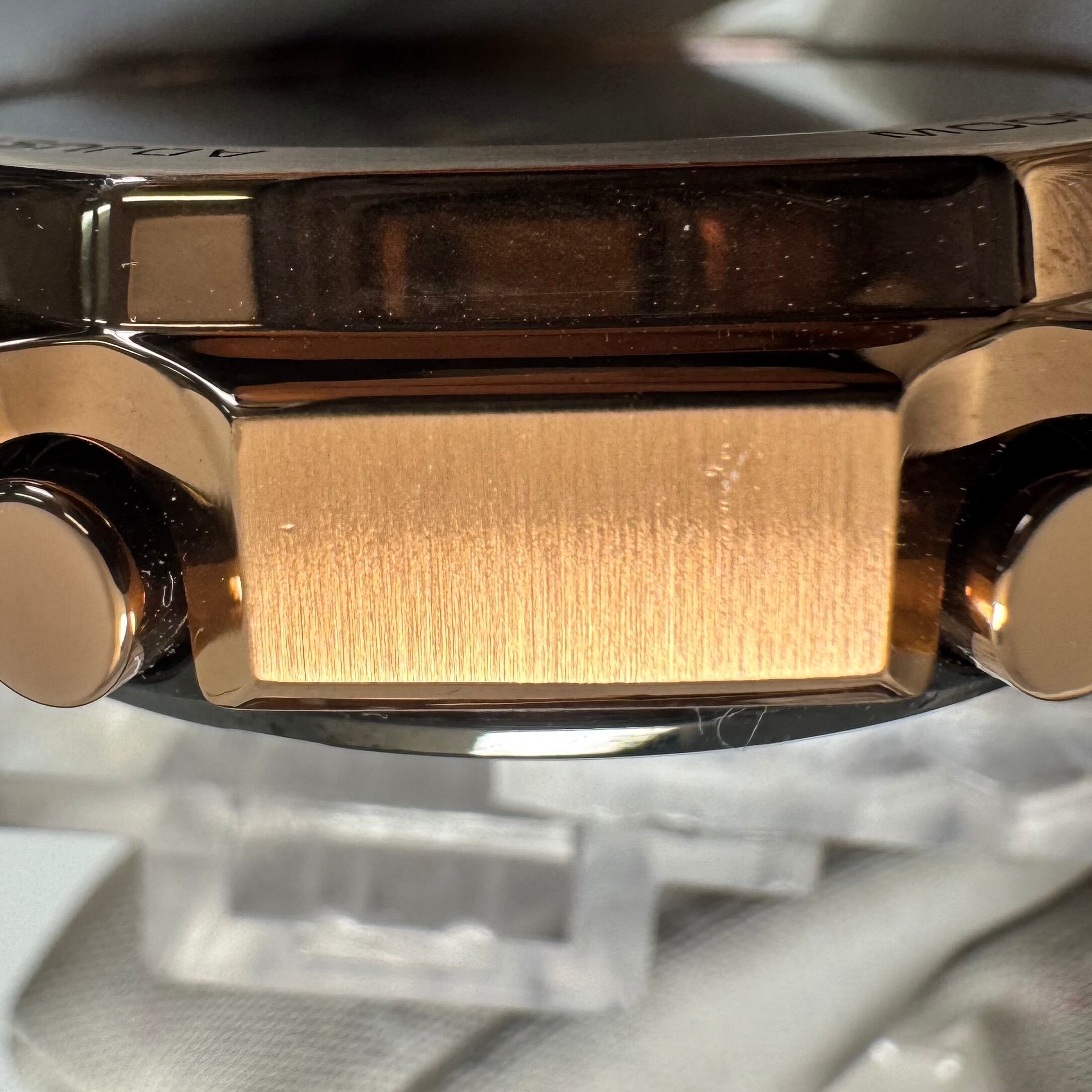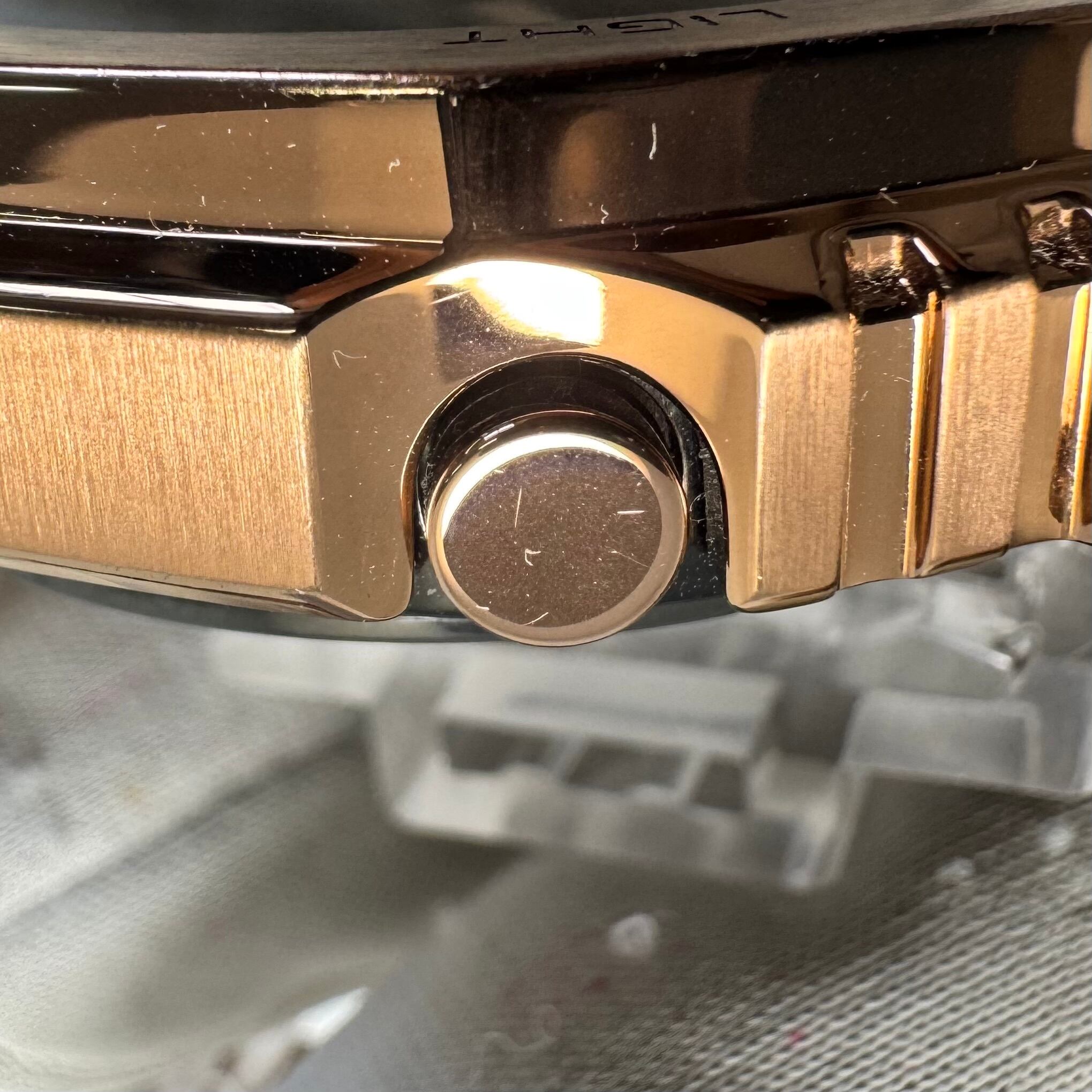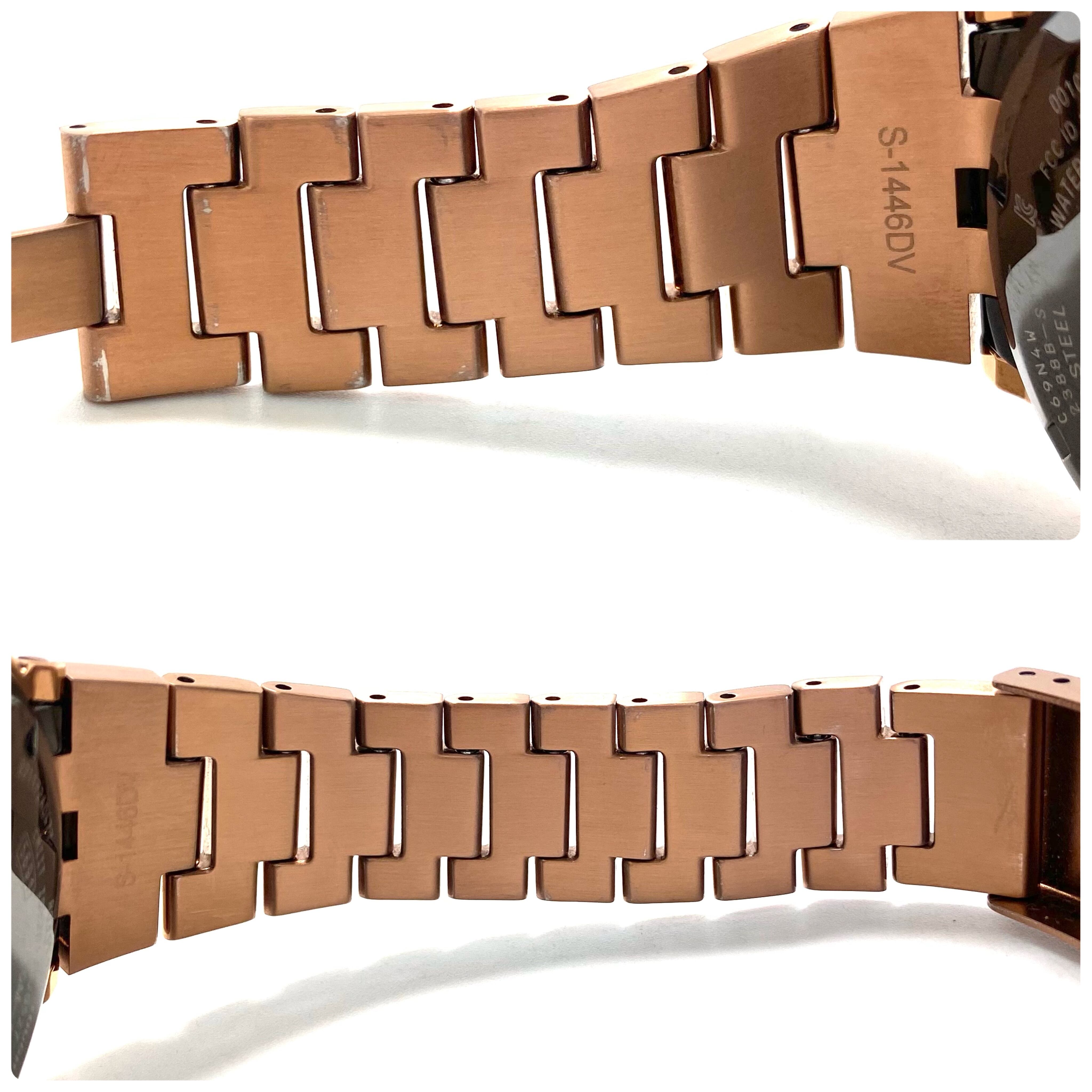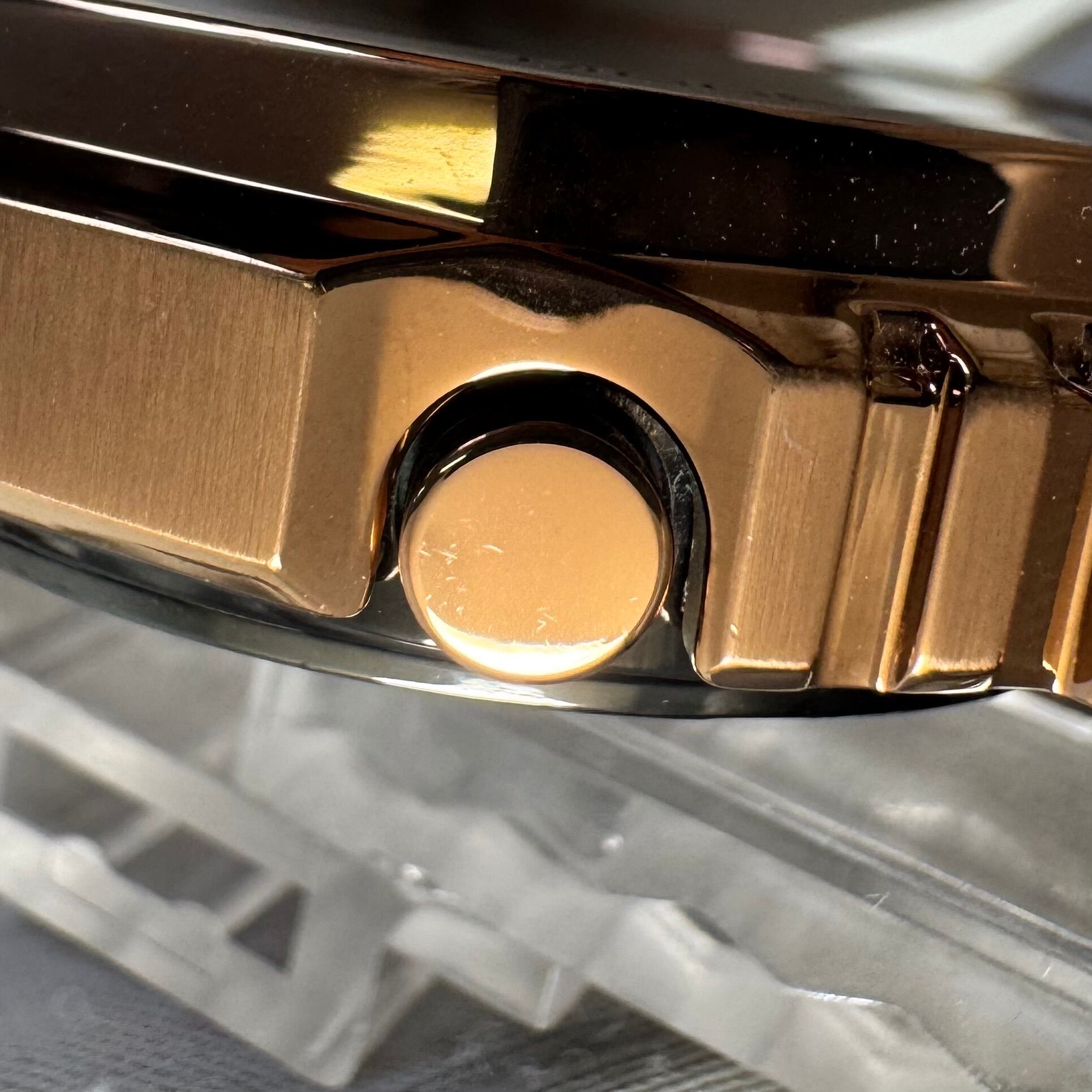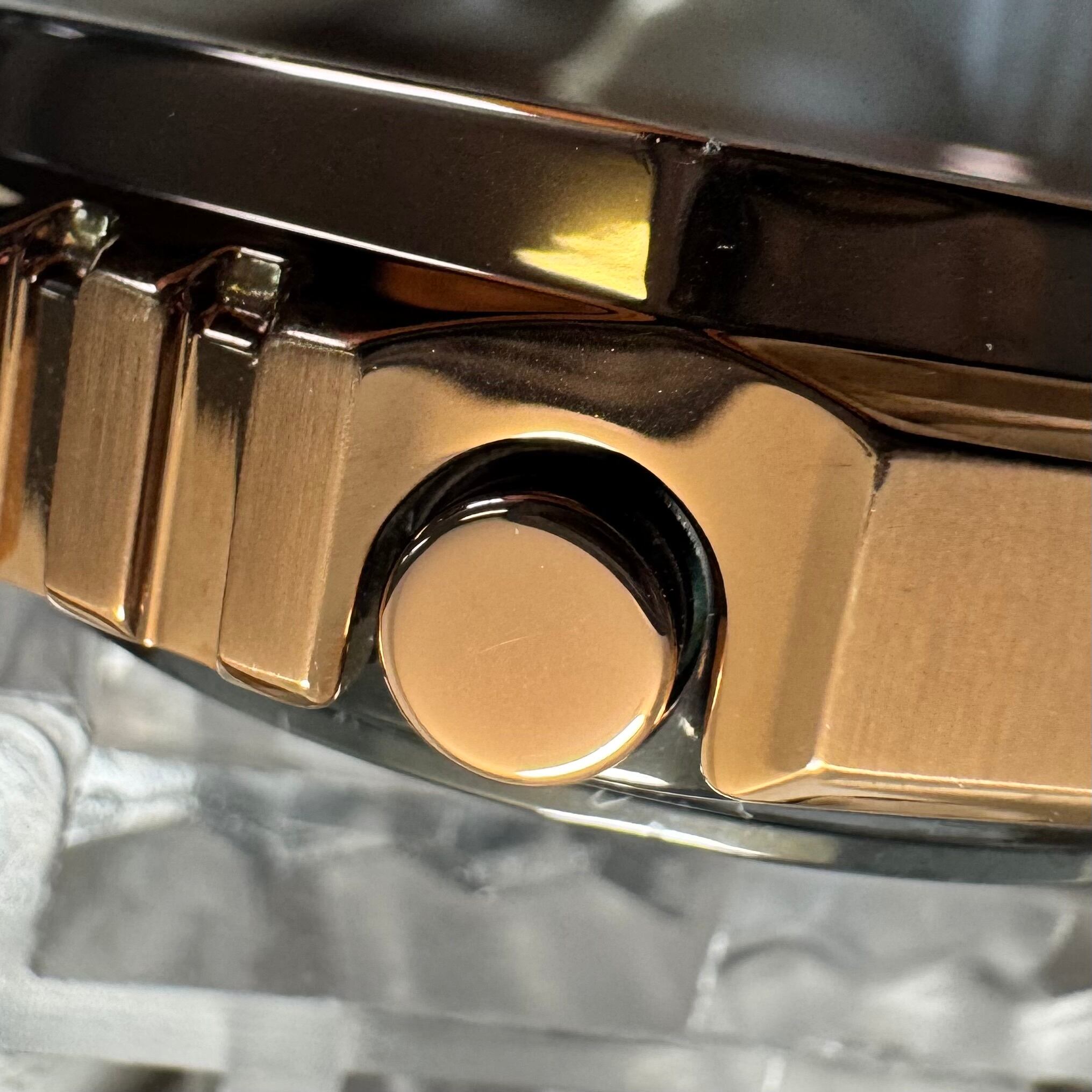 八角形ベゼルのアイコニックなデザインに、ローズゴールドIP仕上げのステンレス外装を組み合わせ、タフさと高級感を高次元で両立。