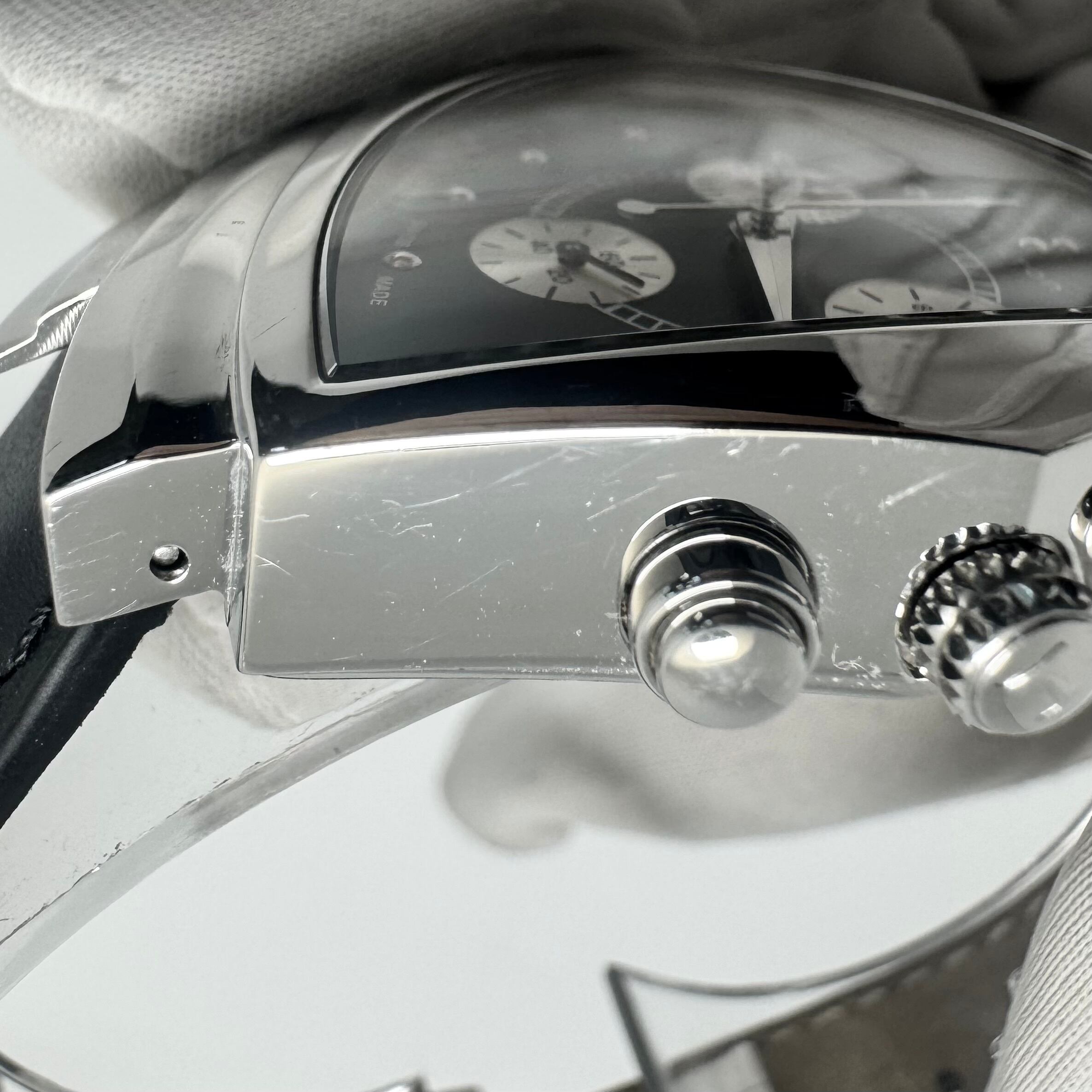 ブラック文字盤にクロノグラフを組み合わせた、スポーティかつモダンな表情が魅力。ステンレススチールケースとブラックレザーベルトの組み合わせにより、個性的でありながらも上質感があり、オン・オフ問わず着用可能となっています。