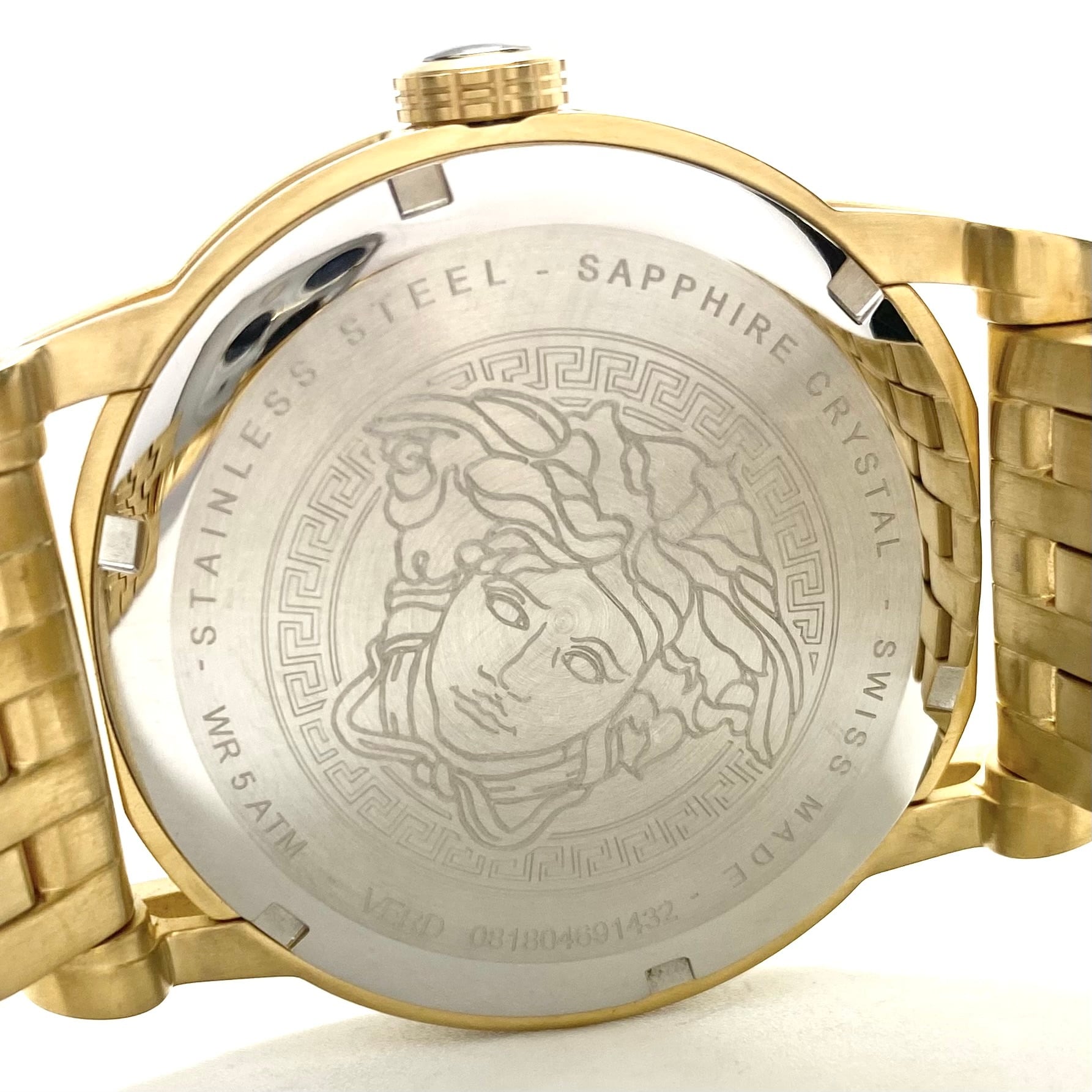 文字盤中央には、ヴェルサーチを象徴する立体的なメデューサモチーフを大胆に配置。一目でそれと分かるデザインは、腕元に強烈なインパクトとラグジュアリー感を与えます。