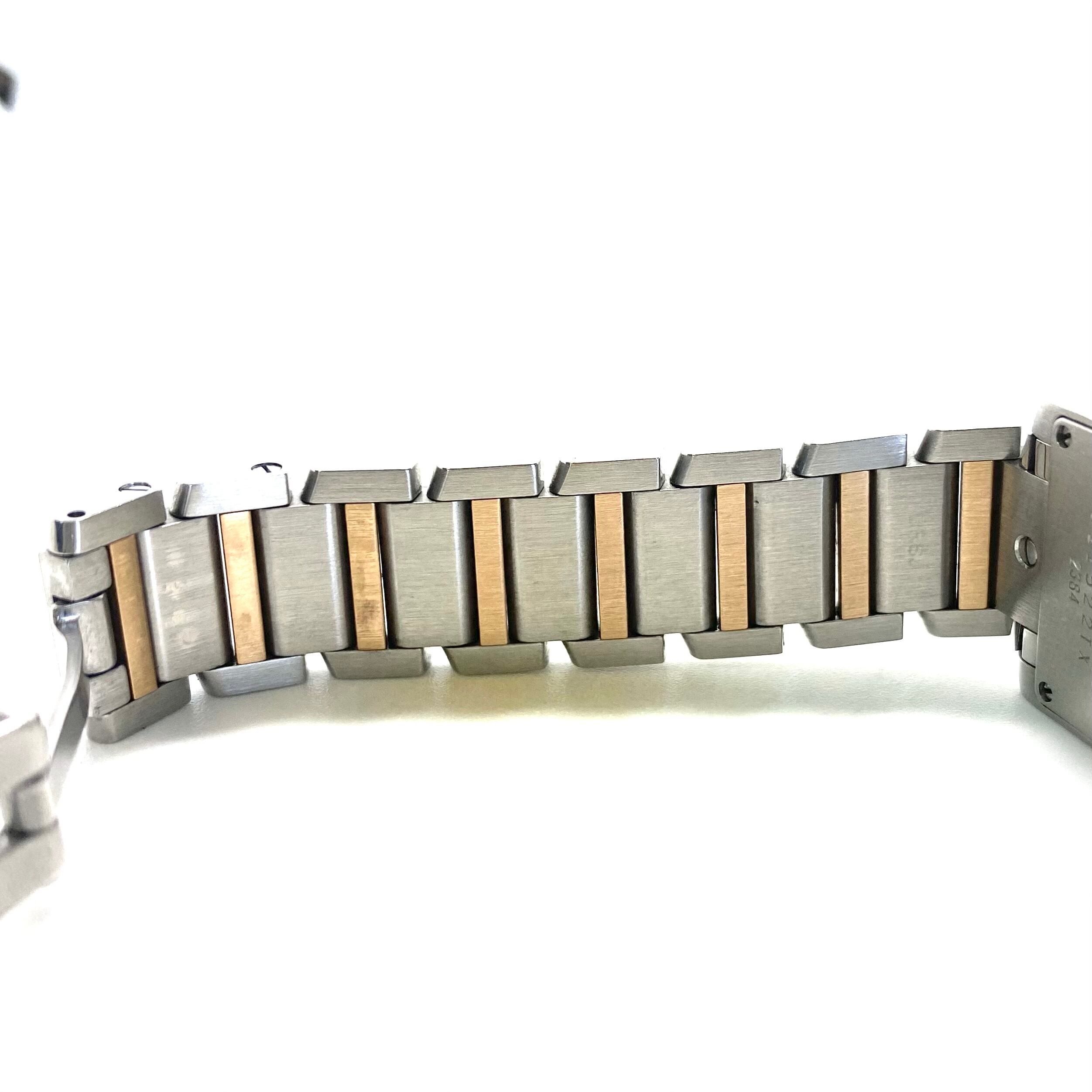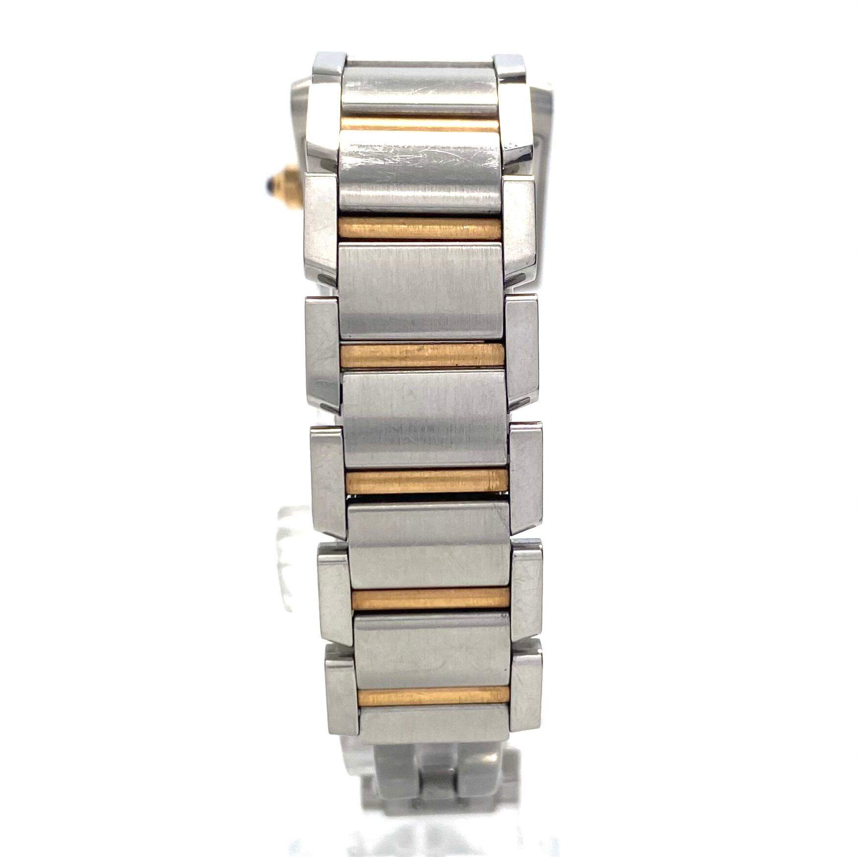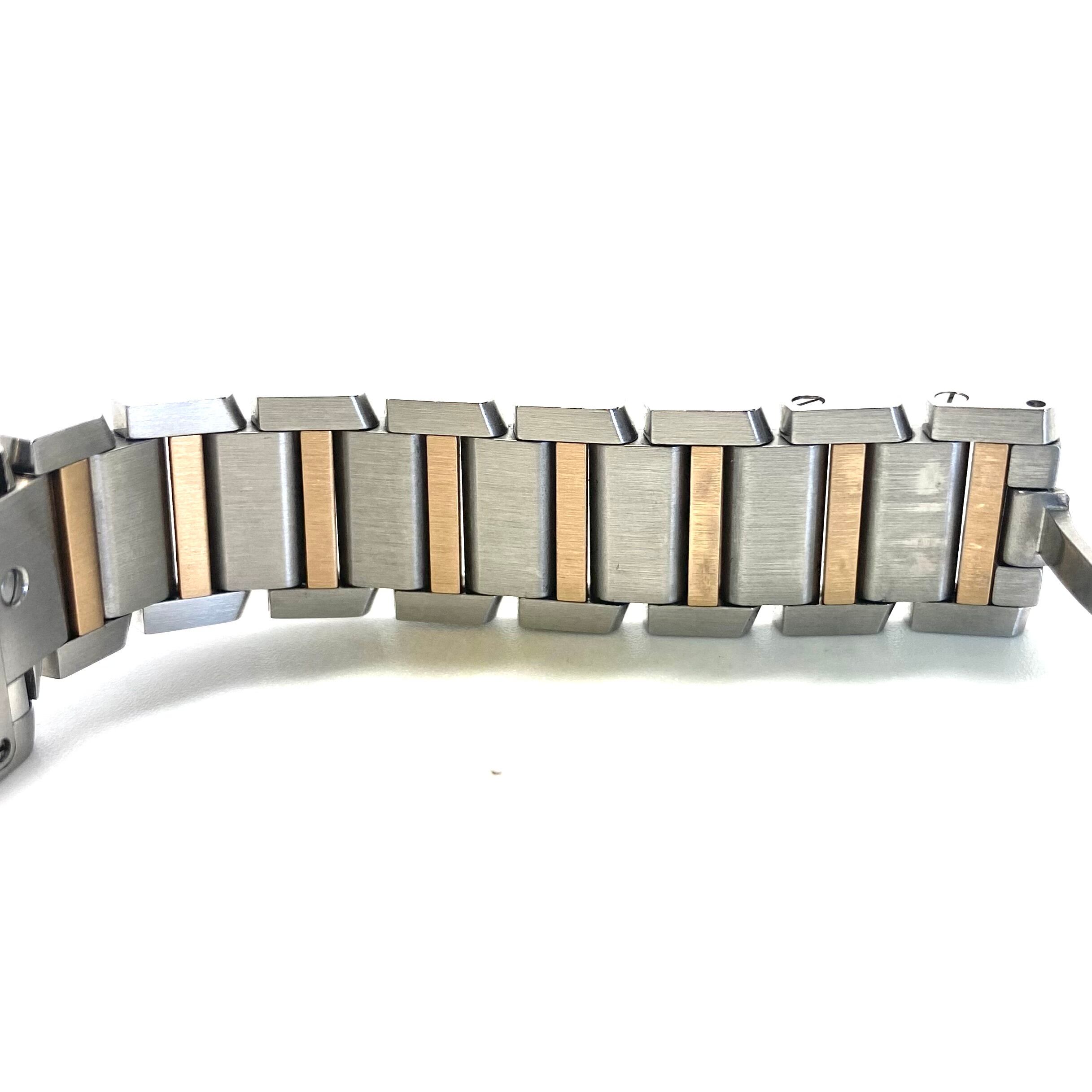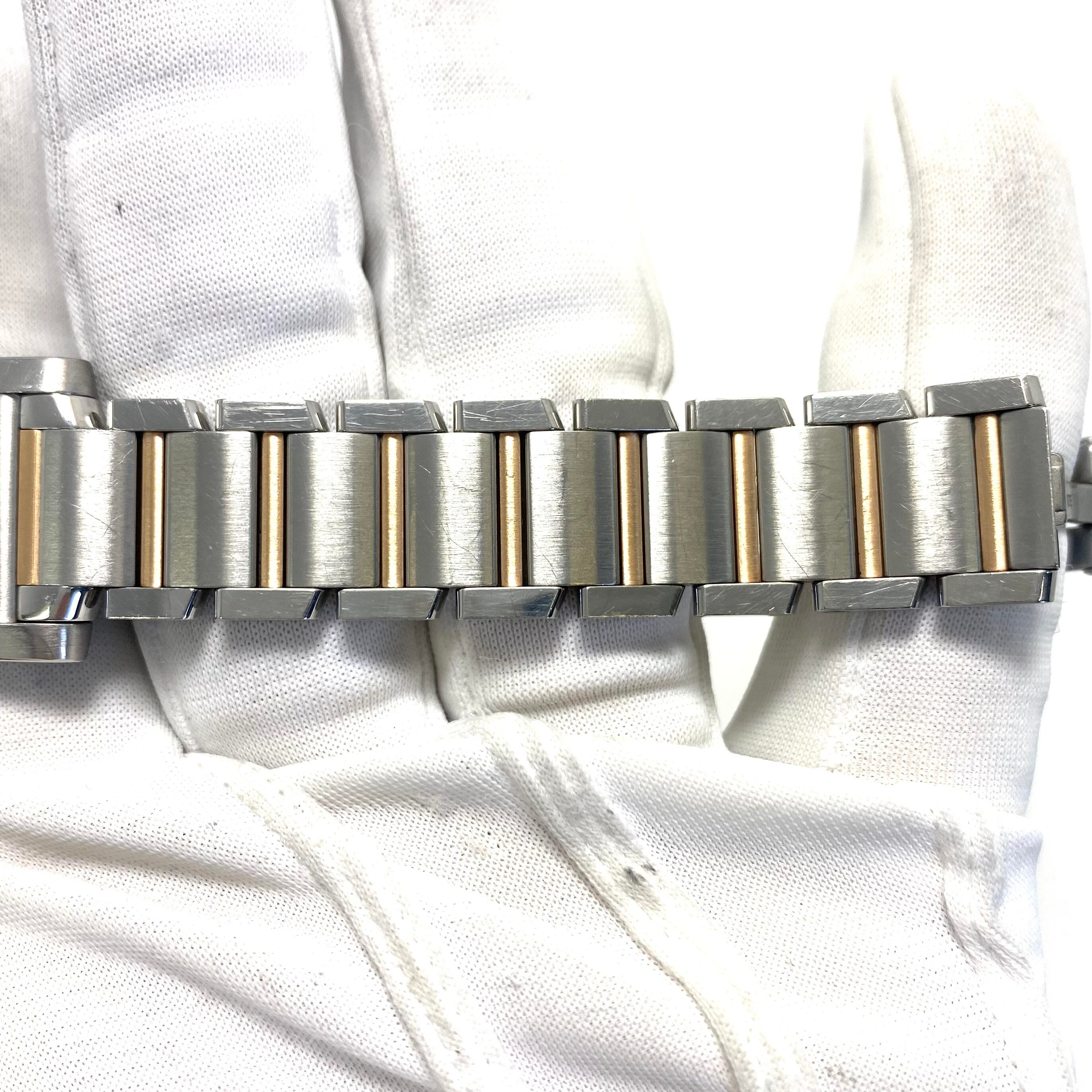 戦車の履帯から着想を得たケースデザインと、ブレスレット一体型のフォルムが特徴のタンク フランセーズ。ステンレススチールとピンクゴールドを組み合わせた、華やかさと上品さを兼ね備えたモデルです。