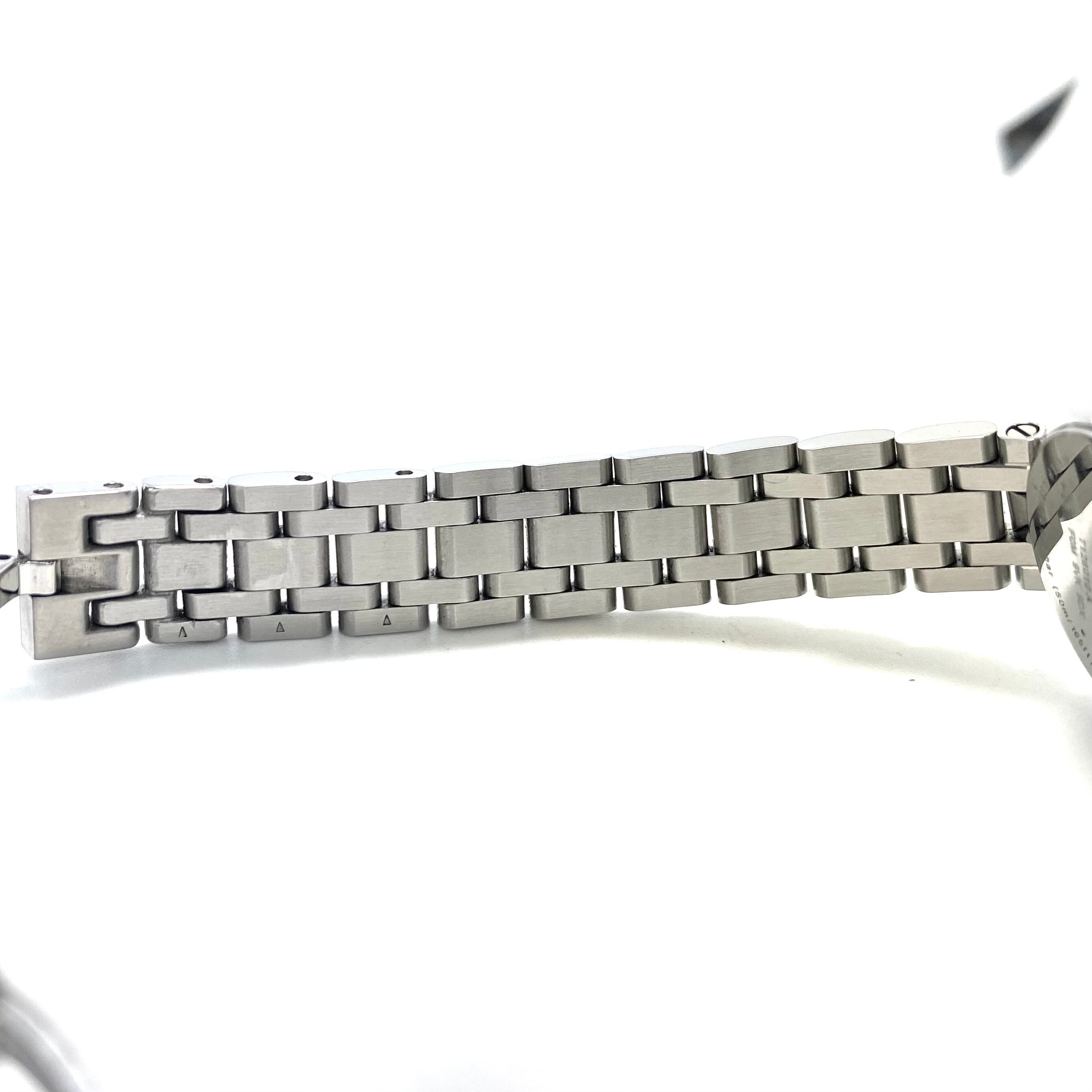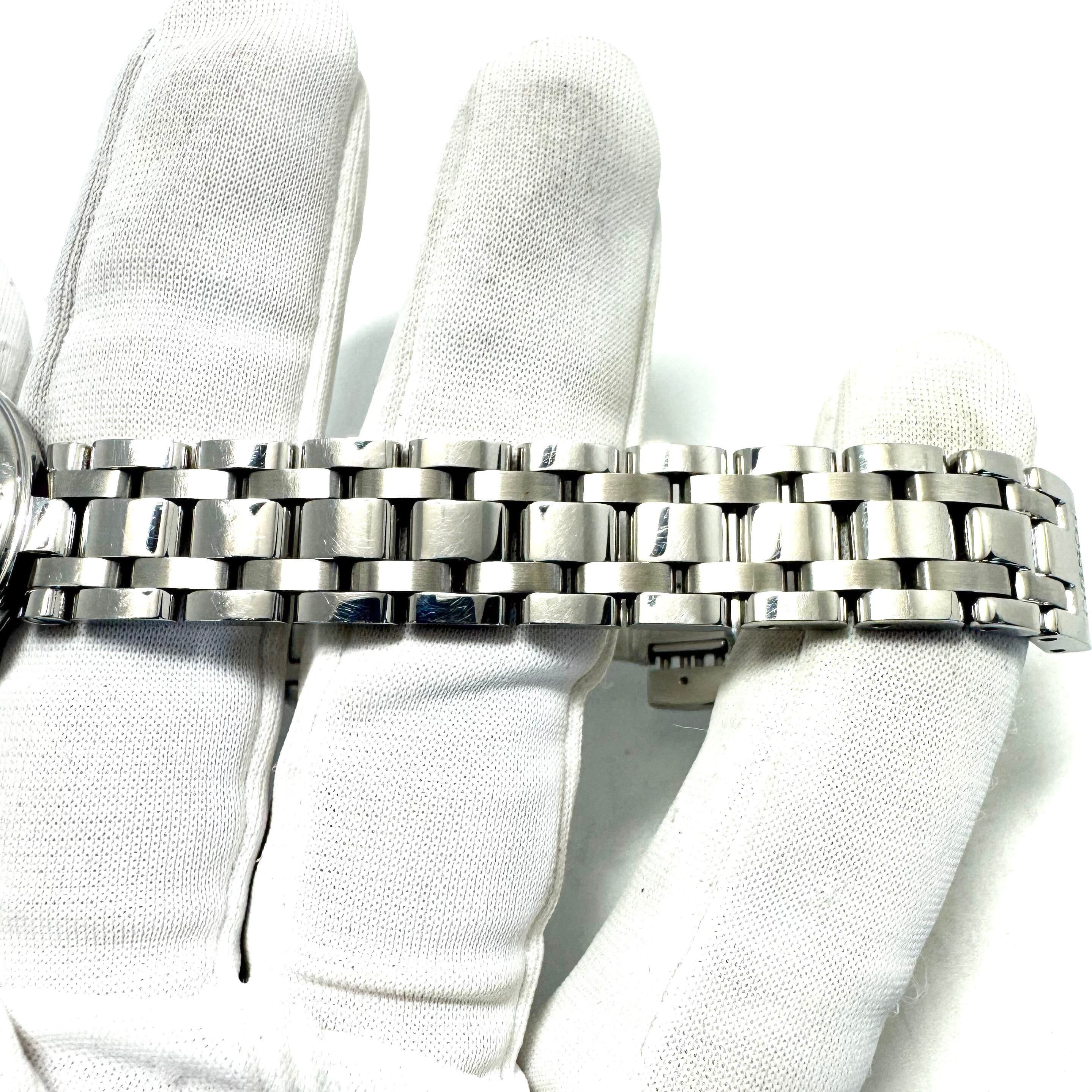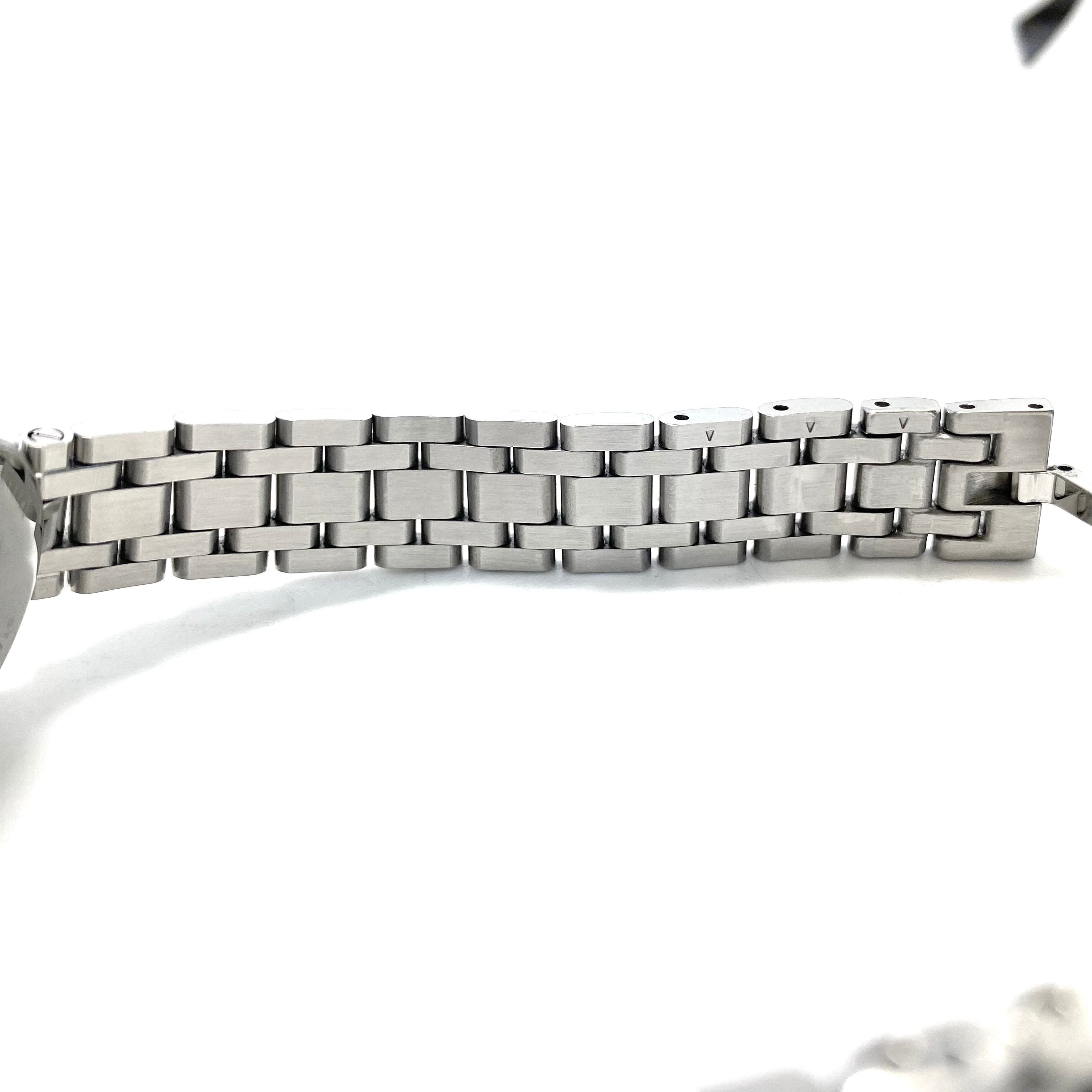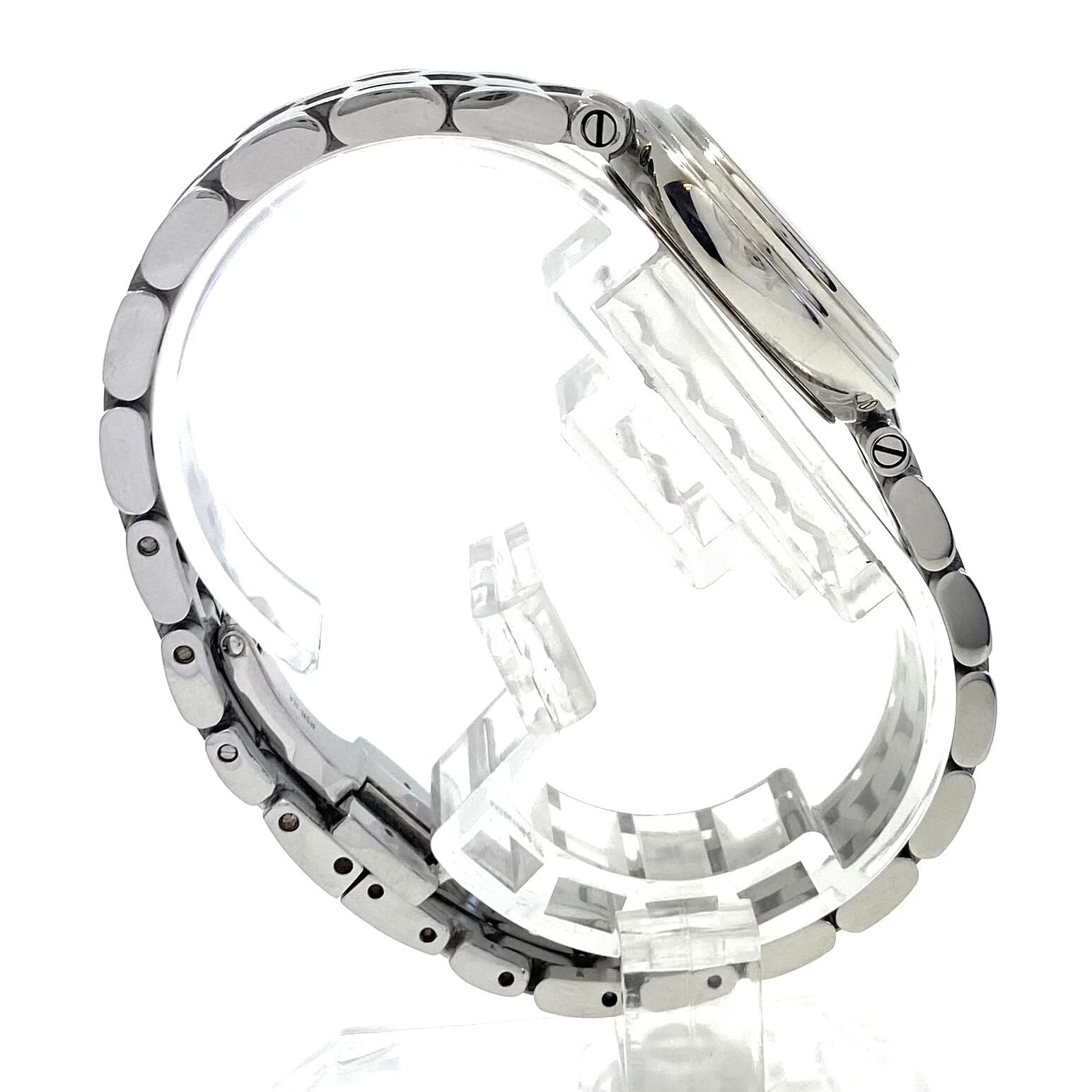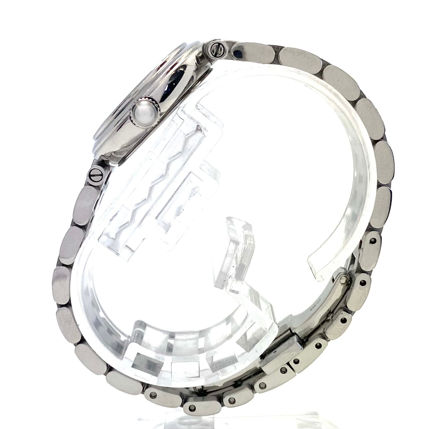 ムーブメントは信頼性の高いスイス製クォーツを搭載。扱いやすく、普段使いにも適したモデルです。ケース・ブレスレットにはステンレススチールを採用し、シンプルながら洗練されたデザインに仕上げられています。