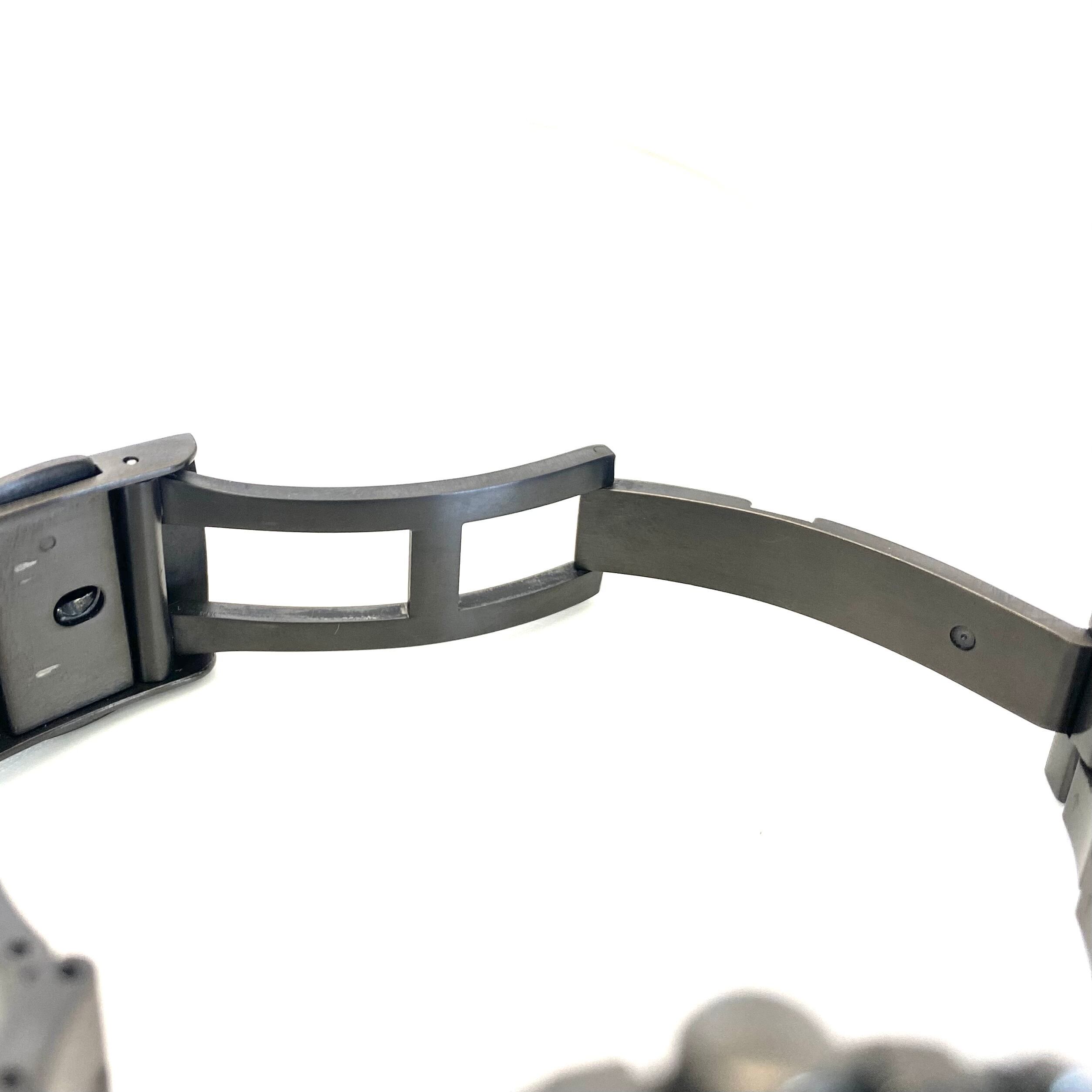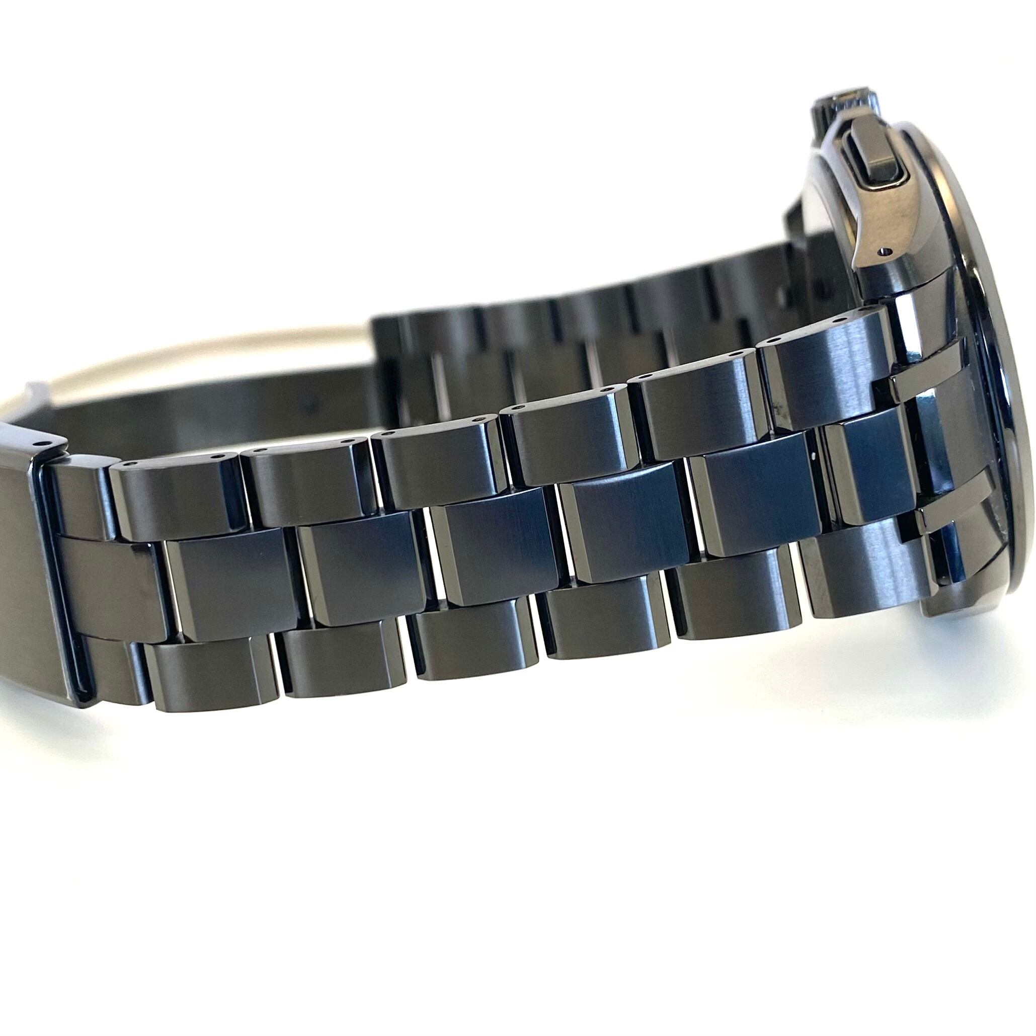 サファイアガラスにはクラリティ・コーティングが施され、視認性も良好。ブラックチタンならではの都会的で引き締まったデザインは、ビジネスからプライベートまで幅広く活躍します。