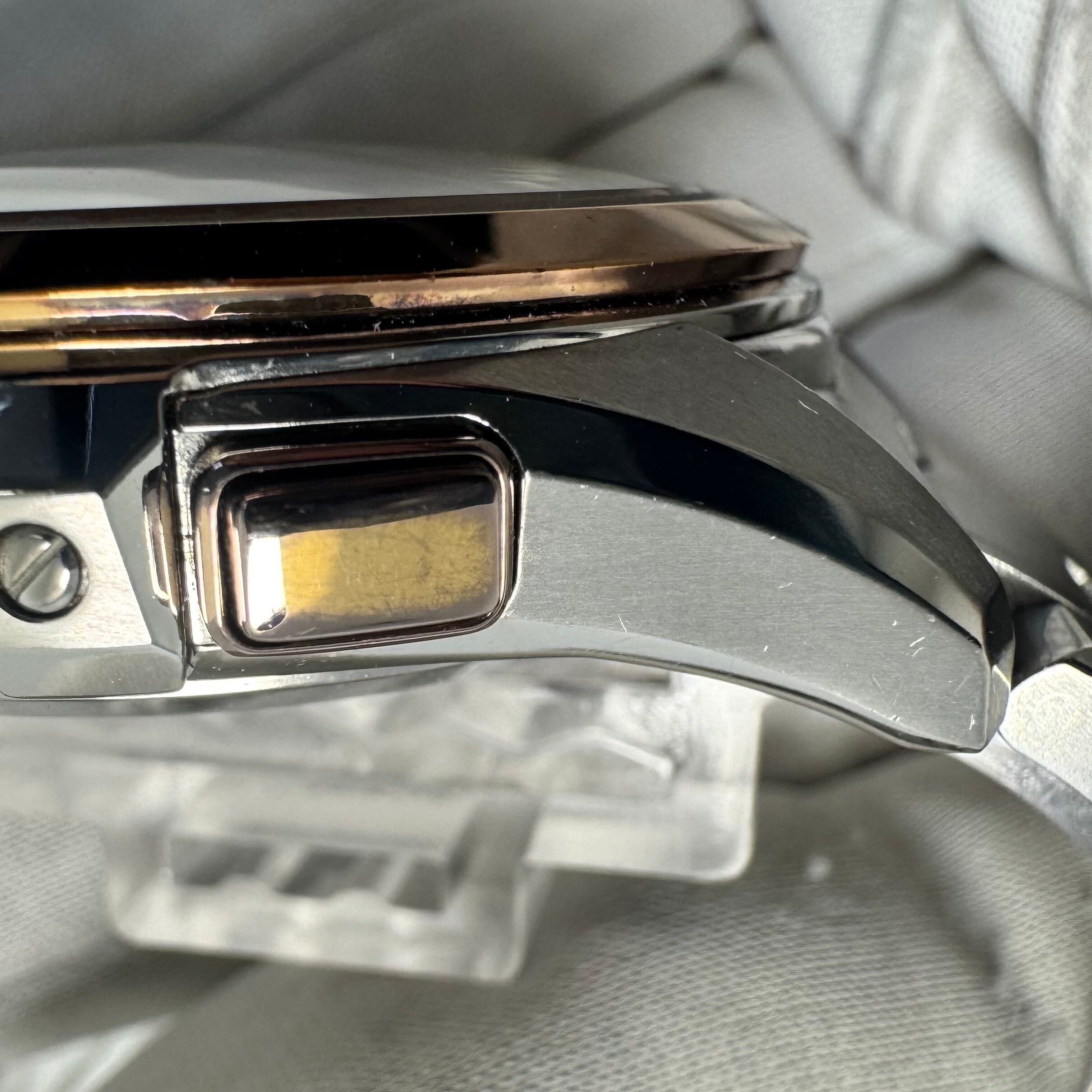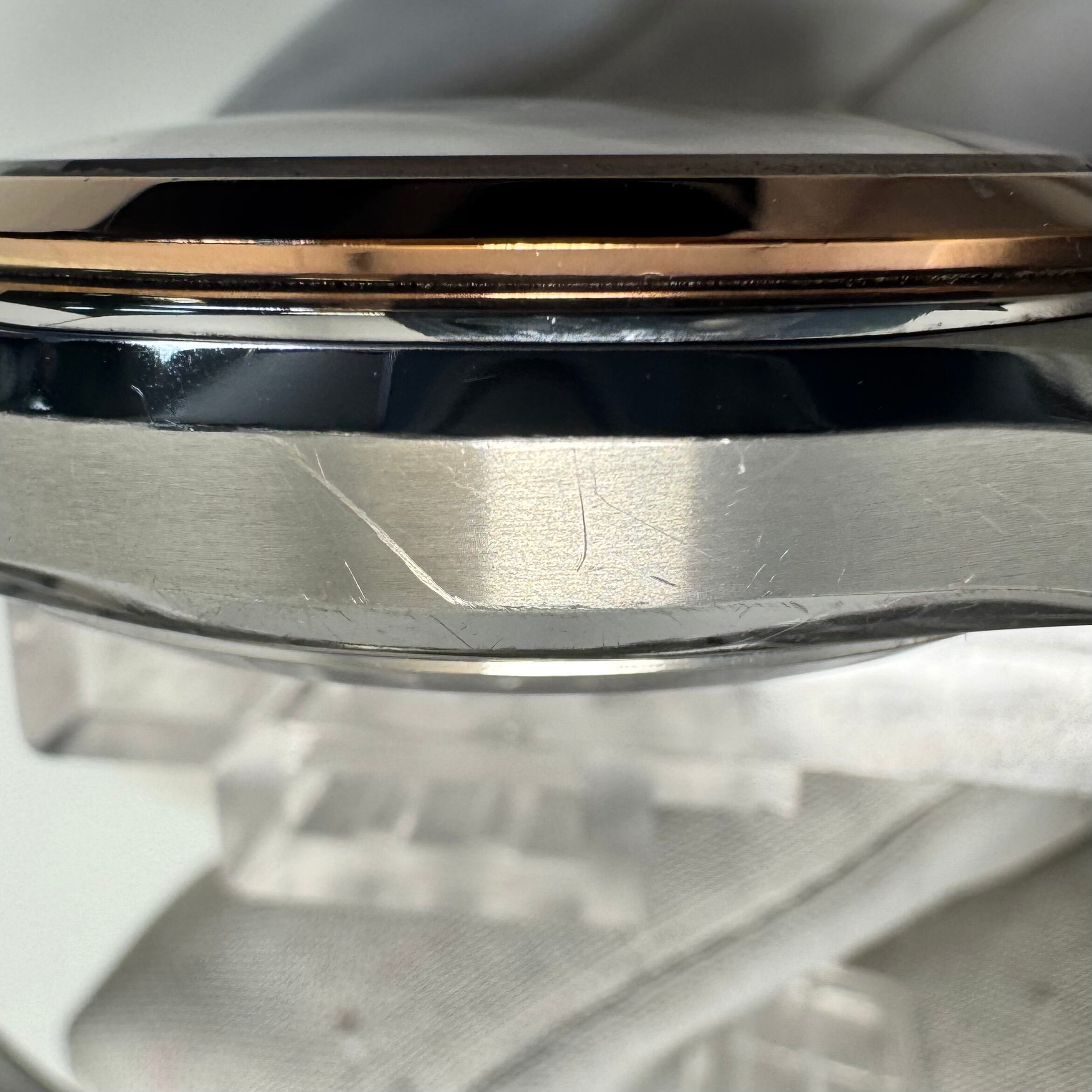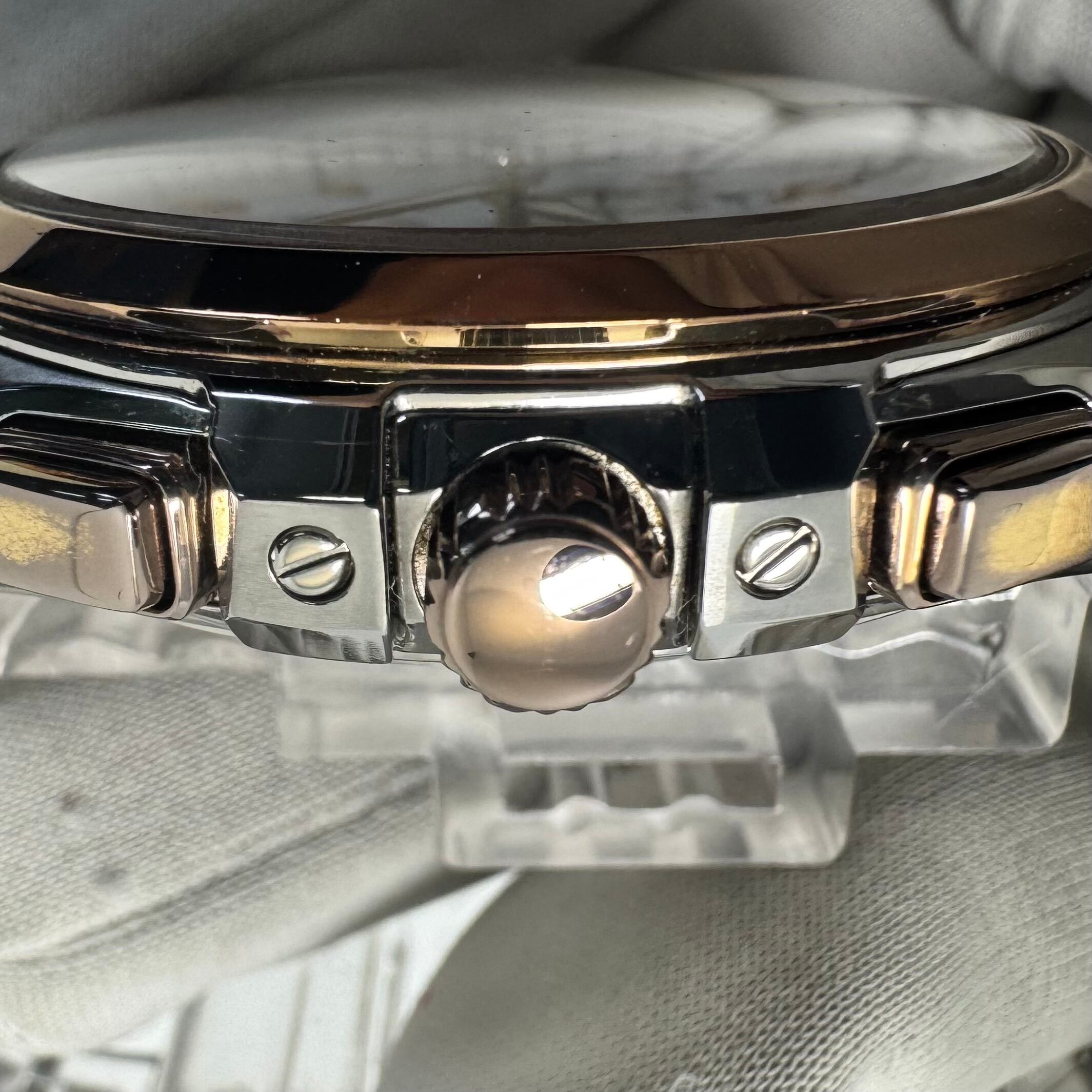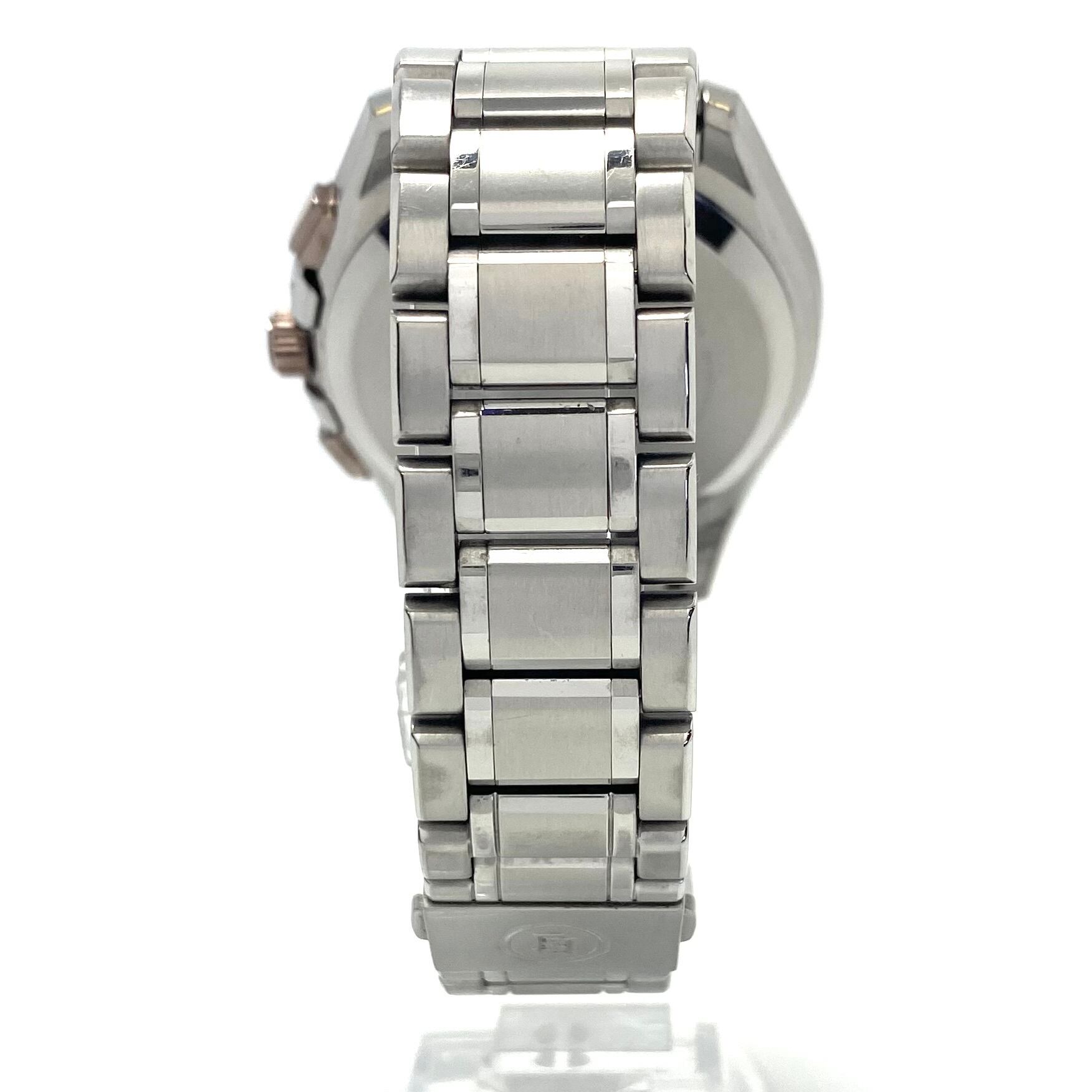 フェイス:ガラス面に若干のスレがあります。ベゼル及びケース、裏蓋に若干のスレや傷があります。クロノグラフボタンに色むらがあります。
