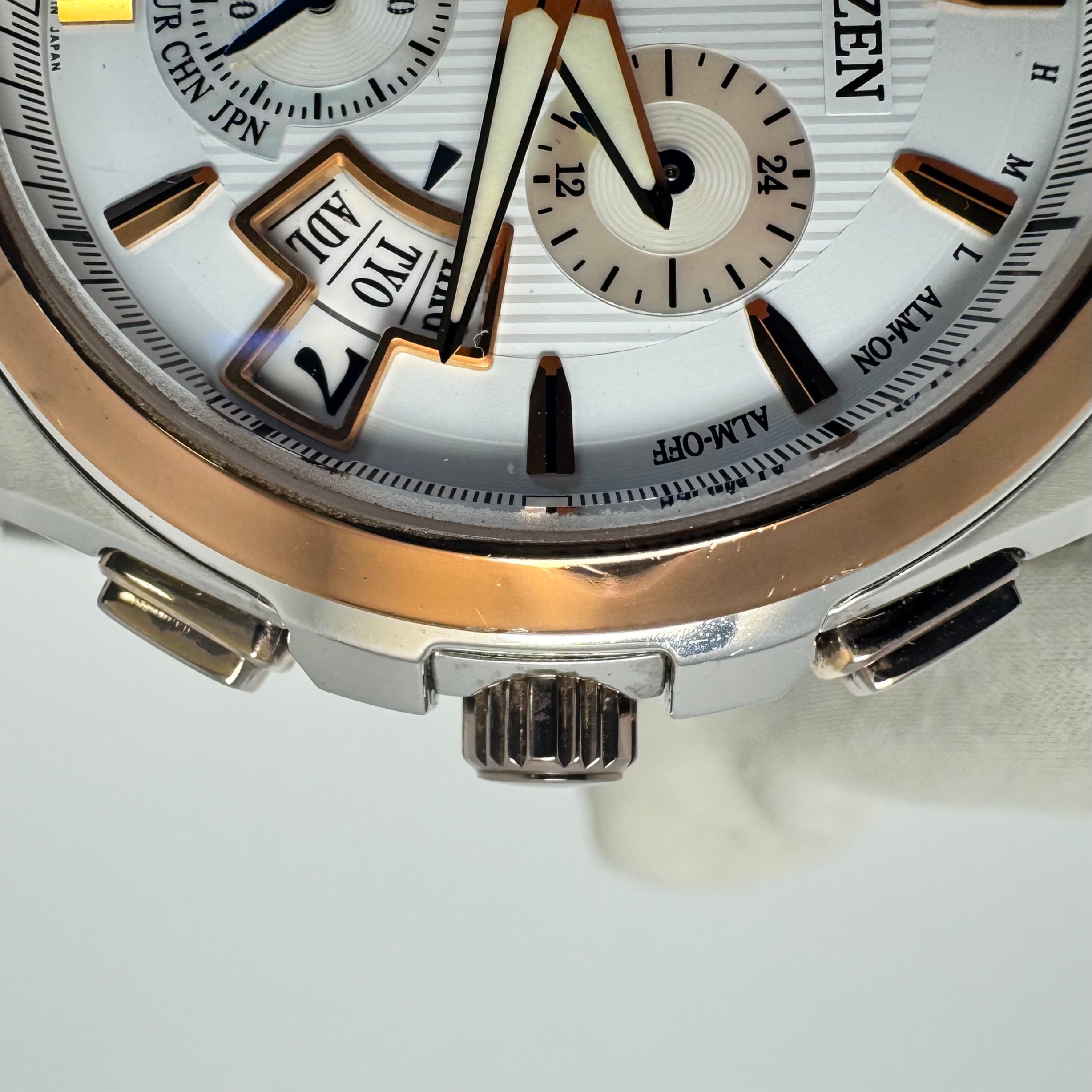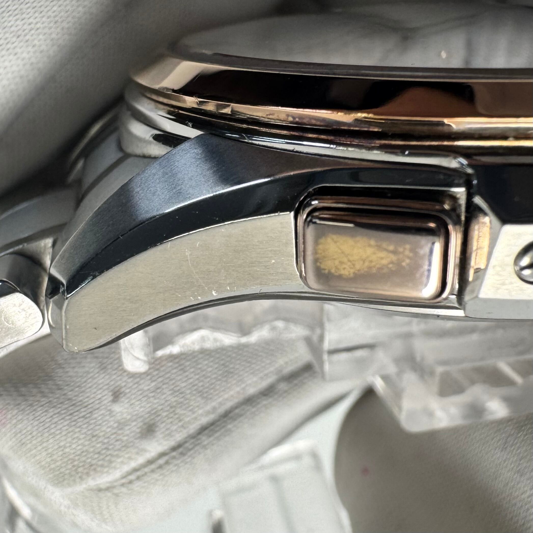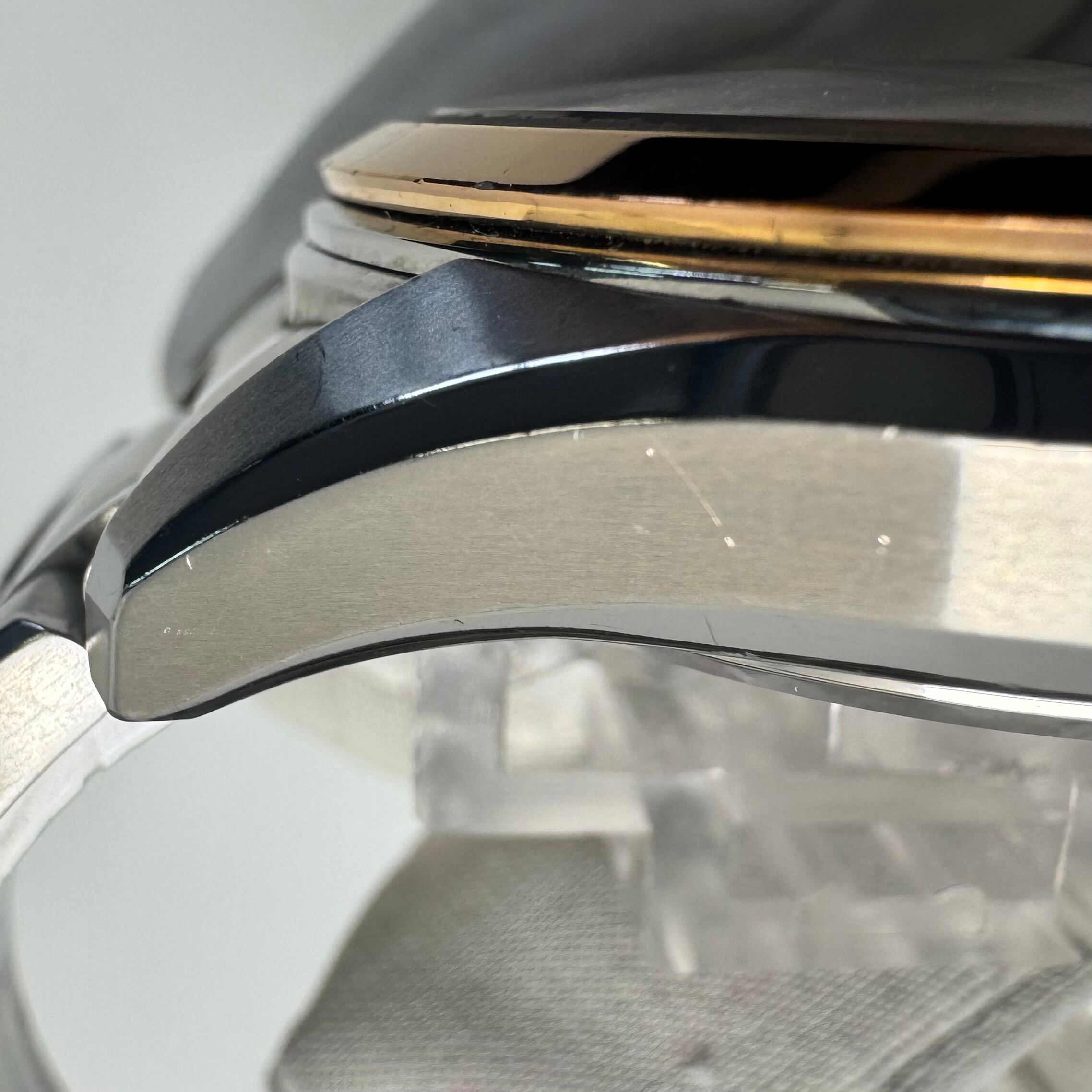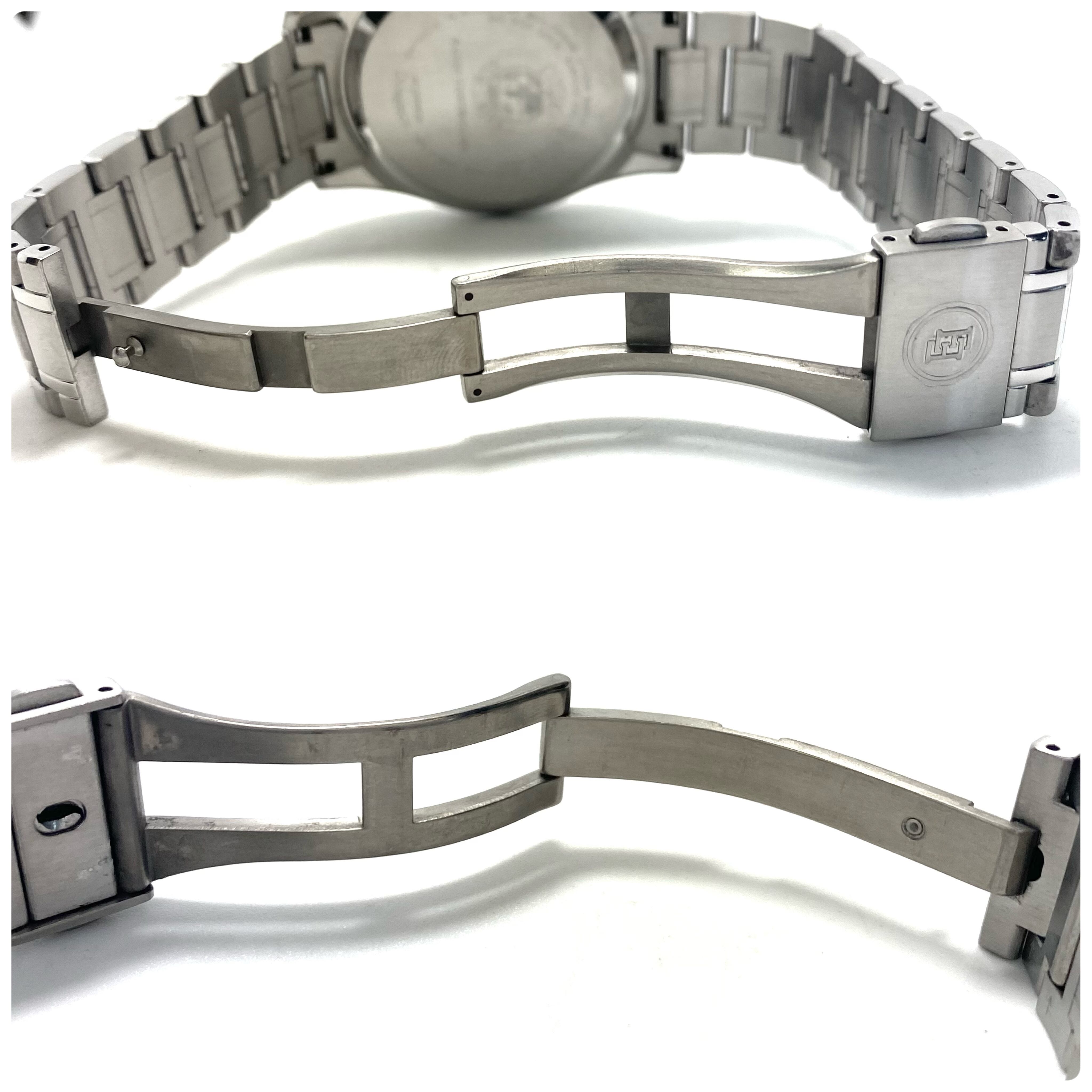 フェイス:ガラス面に若干のスレがあります。ベゼル及びケース、裏蓋に若干のスレや傷があります。クロノグラフボタンに色むらがあります。