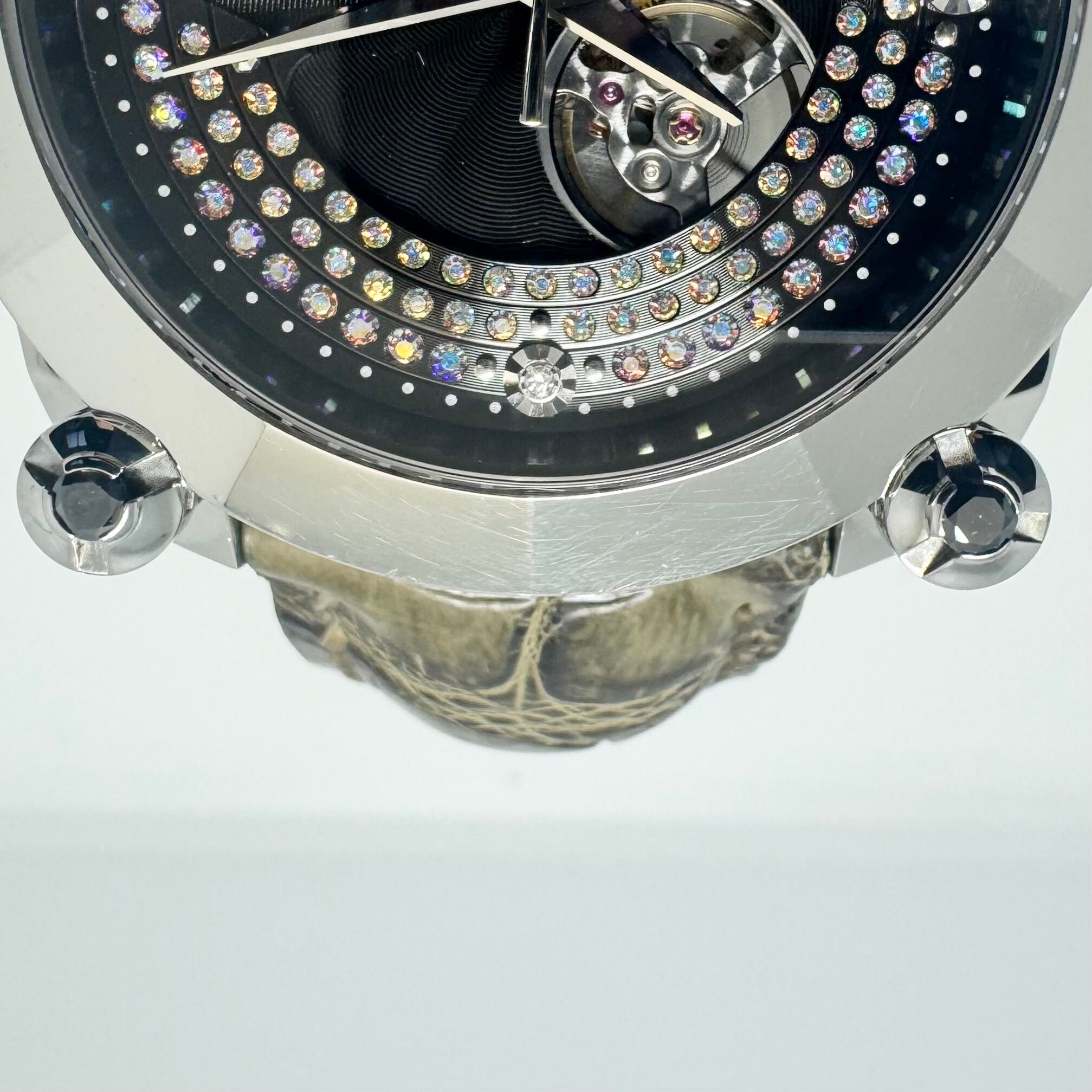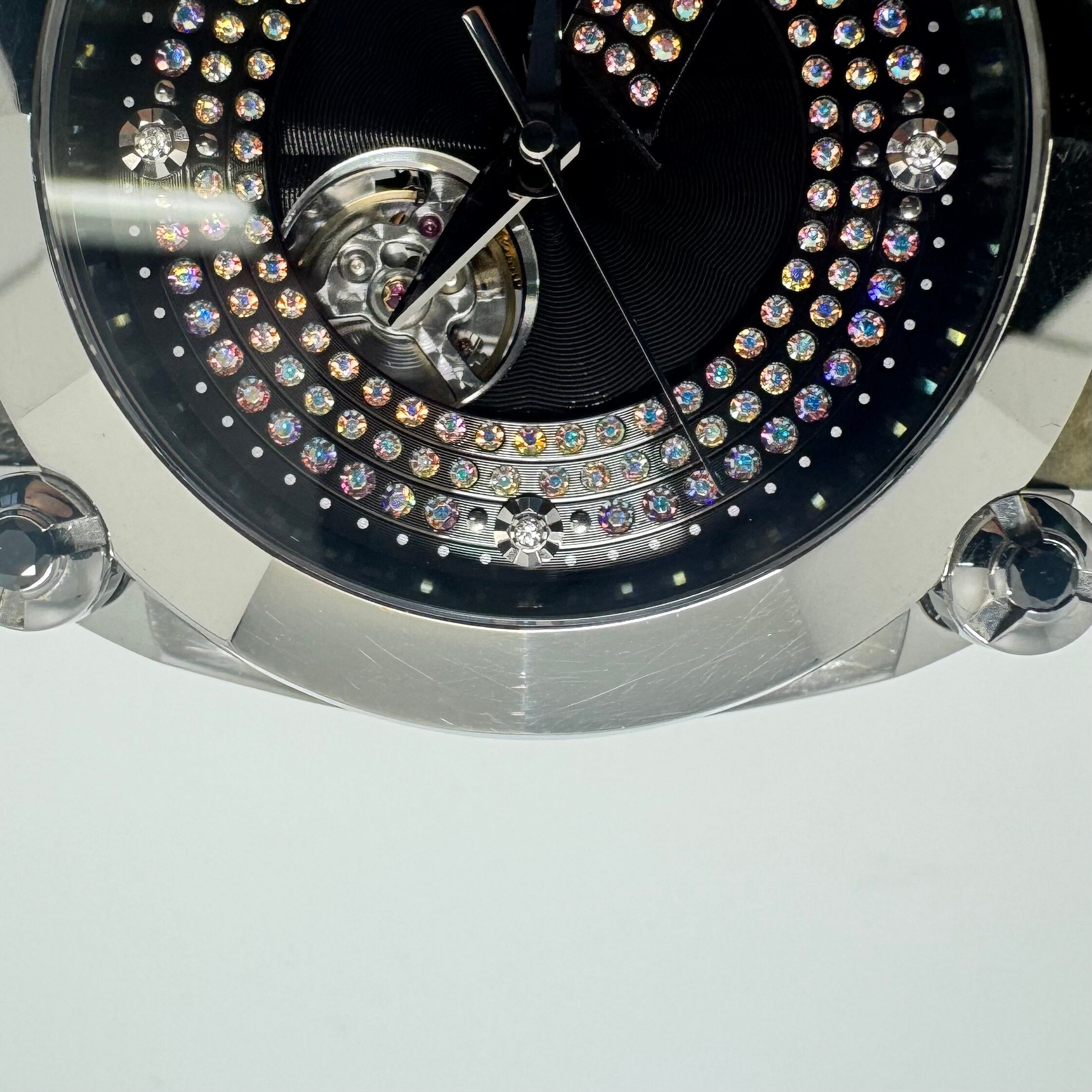 大胆でラグジュアリーなデザインが特徴の本モデルは、ブラック文字盤にダイヤモンド、円柱にルビーがあしらわれ、ガランテならではのアート性と存在感を存分に堪能できる仕上がり。裏蓋はシースルーバック仕様となっており、高級機械式ムーブメント Cal.8L38 の精緻な動きを鑑賞できます。