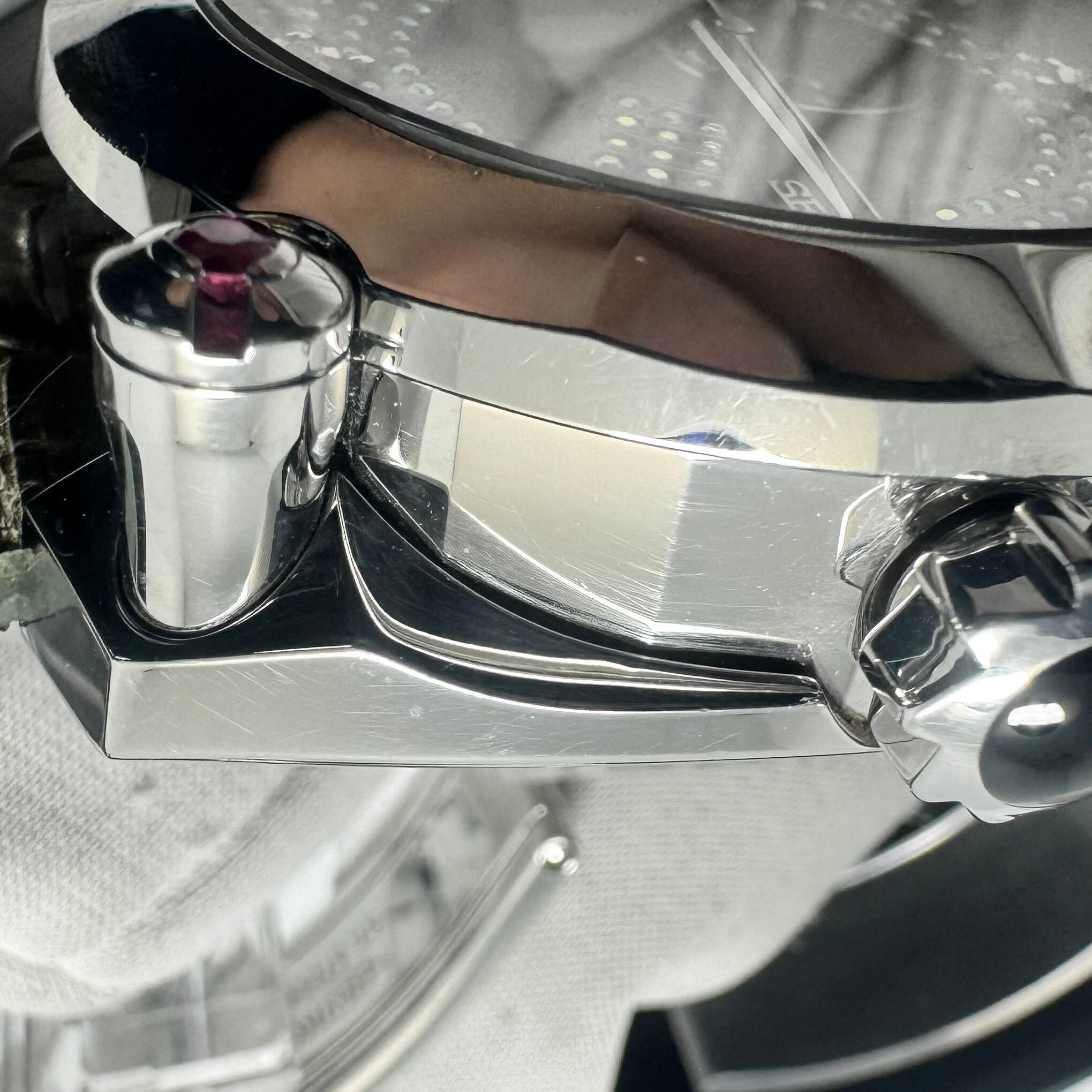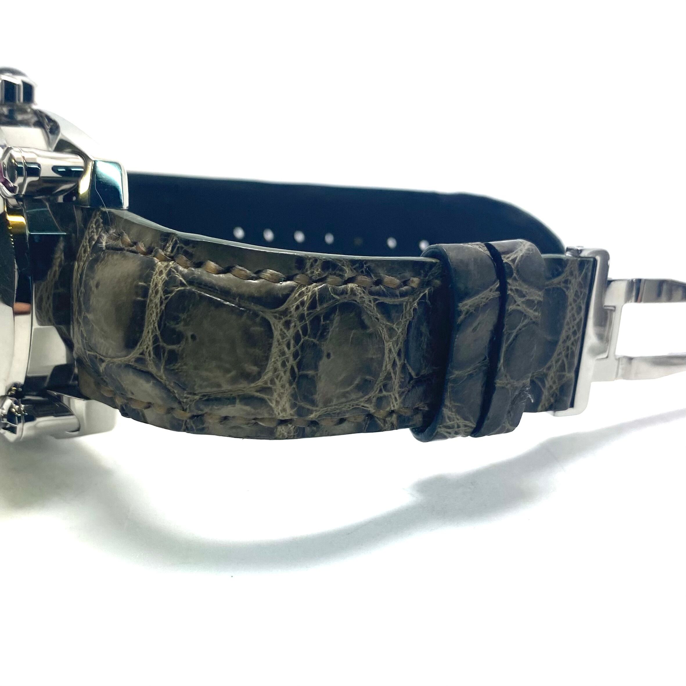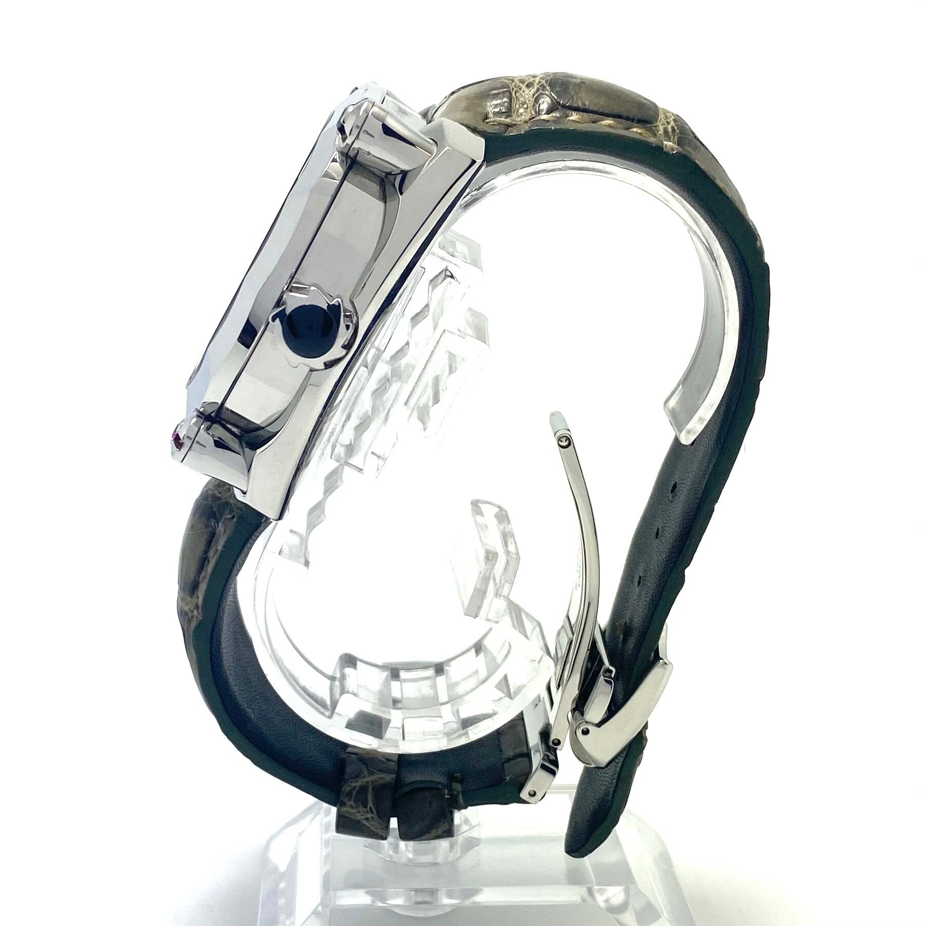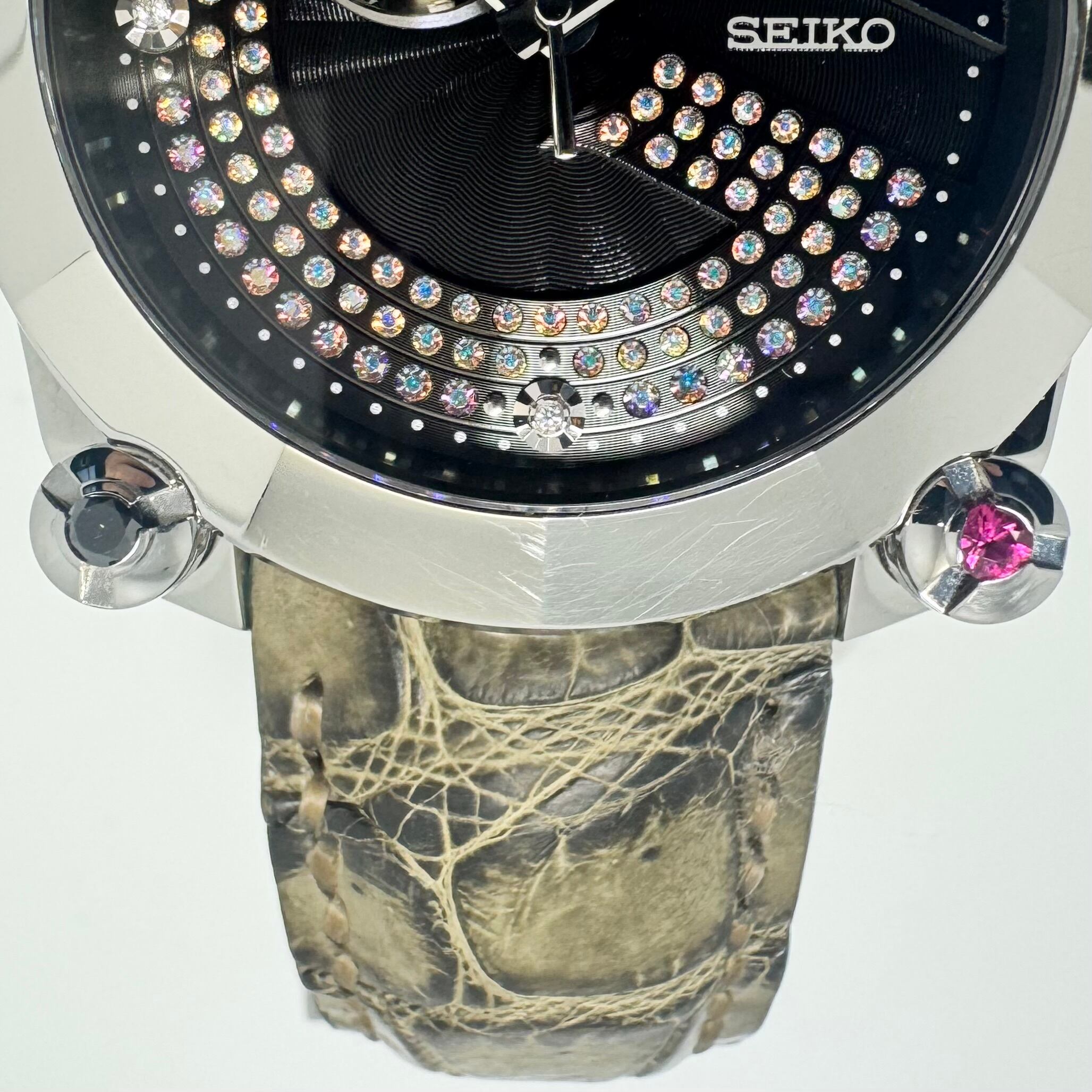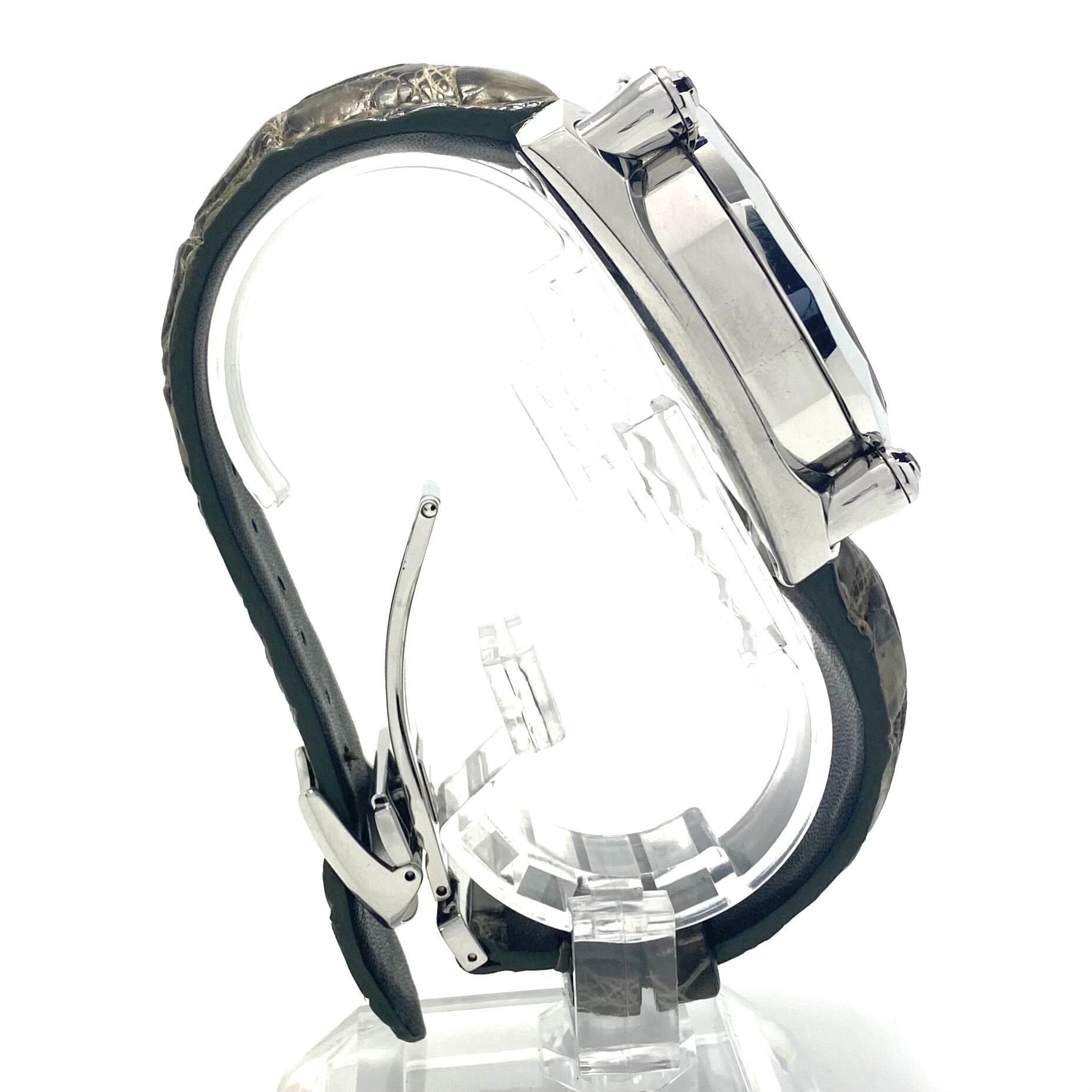 ムーブメントにはセイコー上位機にのみ採用される自動巻きを搭載し、20気圧防水を備えるなど、見た目だけでなく実用性も十分。革ベルトとの組み合わせにより、ラグジュアリーかつ力強い印象を腕元に与えます。