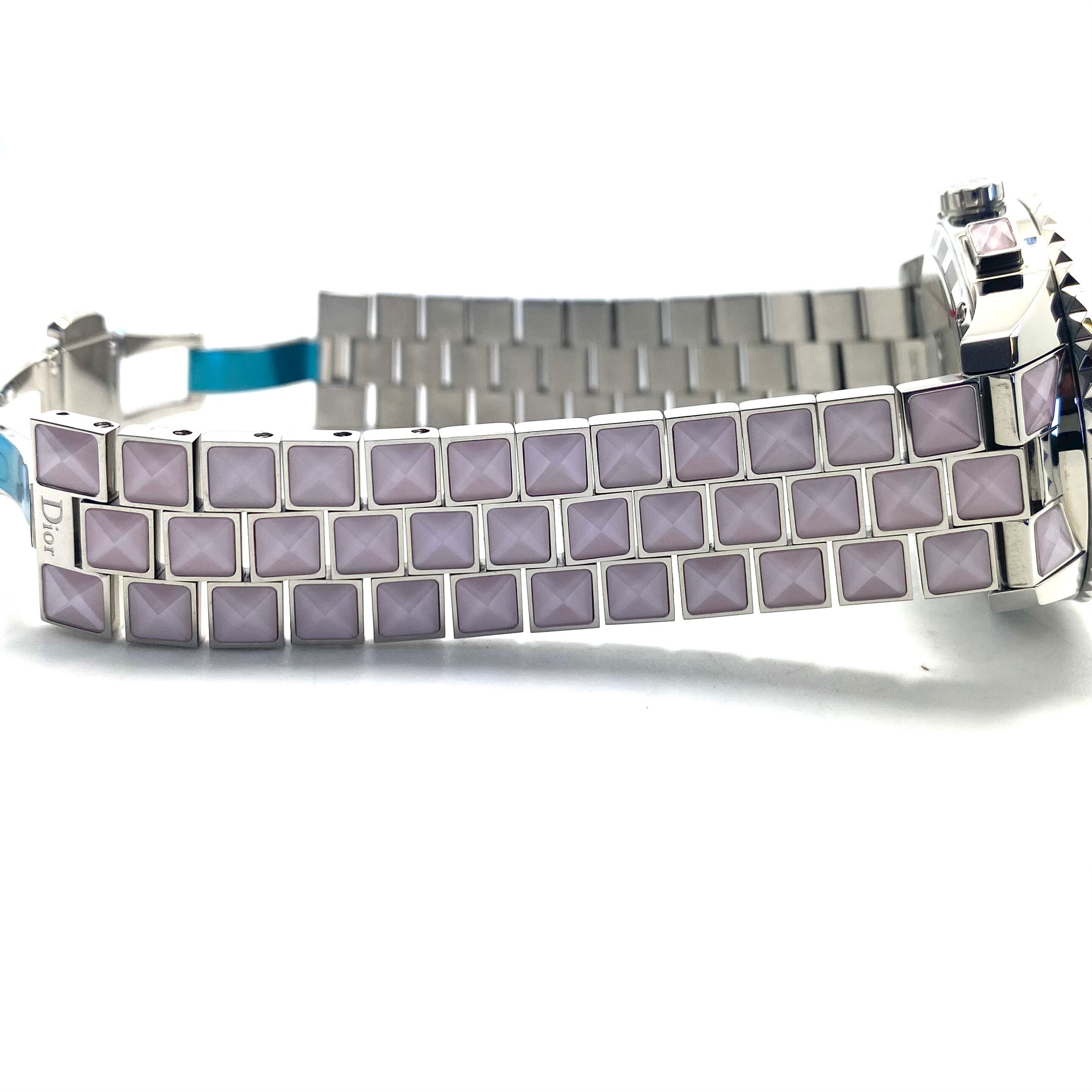 洗練されたシルバーカラー文字盤とダイヤモンド装飾が施されたベゼル、ブレスレットに配置されたピラミッド型のサファイアクリスタルが、ディオールらしいエレガントな外観を演出します。