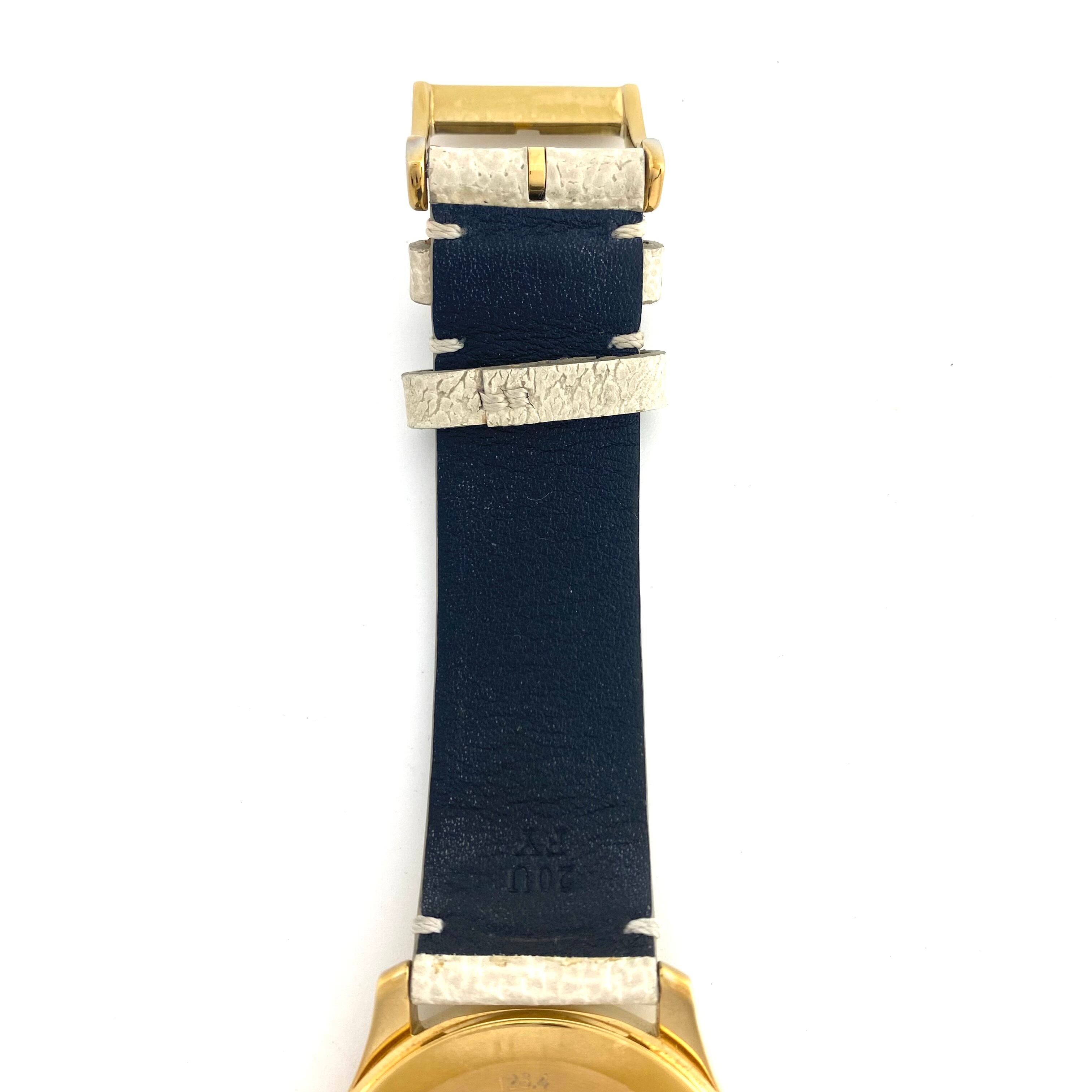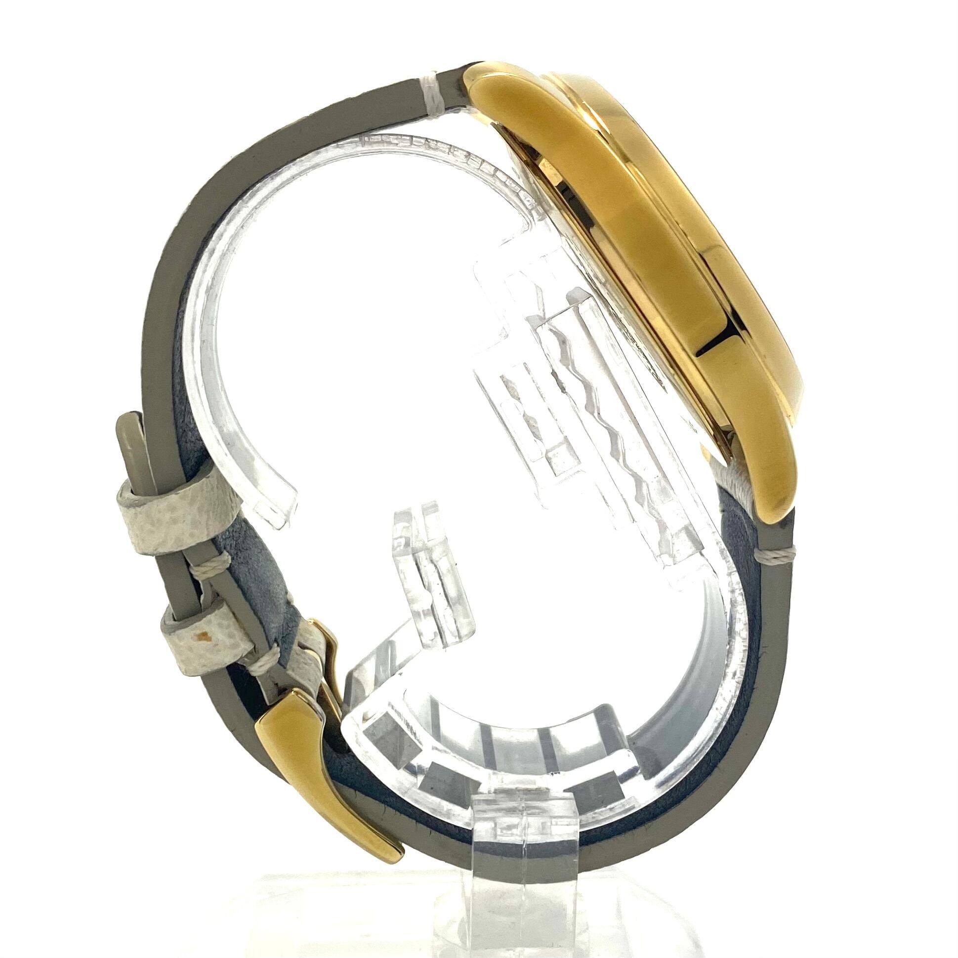 ホワイト文字盤に繊細に描かれた蝶のデザインが、上品さと遊び心を併せ持つ一本です。イエローゴールドカラーのケースが華やかさを演出しつつ、ホワイトのレザーベルトとの組み合わせにより、全体として非常に洗練された印象に仕上がっています。