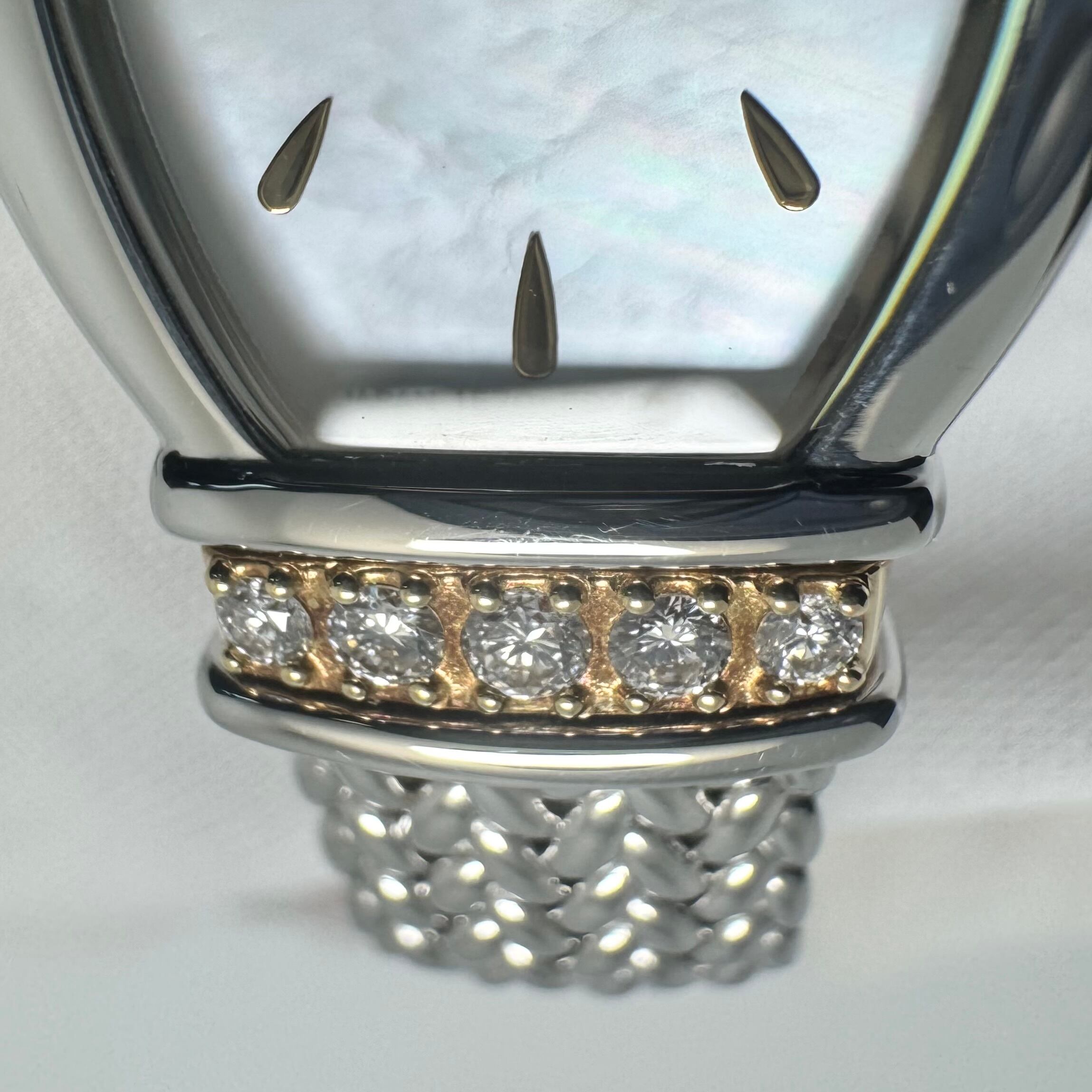 ラグ部分にステンレススチールと18KT(K18)ゴールドを採用し、ダイヤモンドをセッティングしたラグジュアリーな一本です。ホワイトシェル文字盤は光の角度によって表情を変え、柔らかな輝きが女性らしい気品を一層引き立てます。