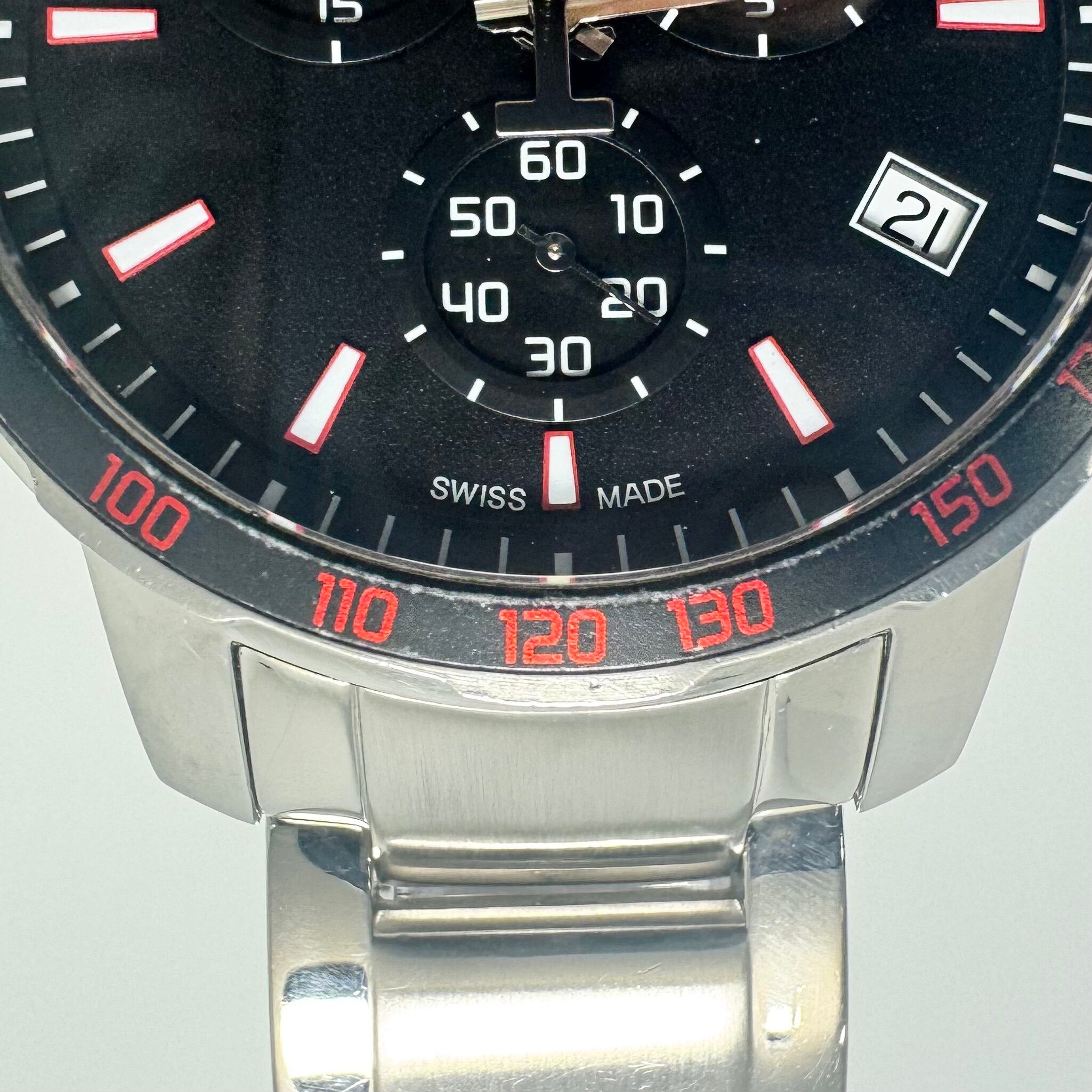 クロノグラフ機能とデイト表示を備え、ムーブメントには信頼性の高いスイス製クォーツを搭載。高い視認性と実用性を兼ね備え、オン・オフ問わず活躍します。