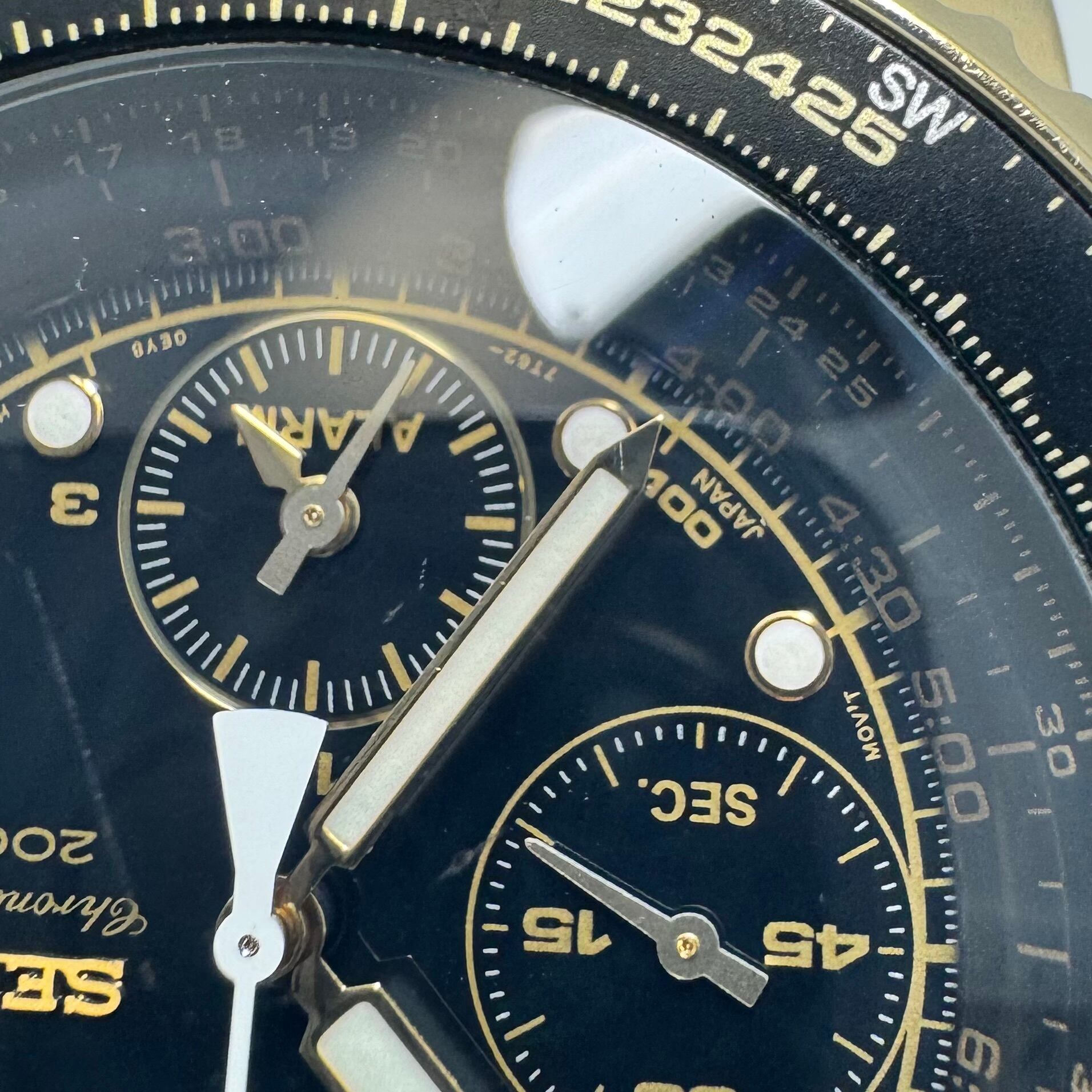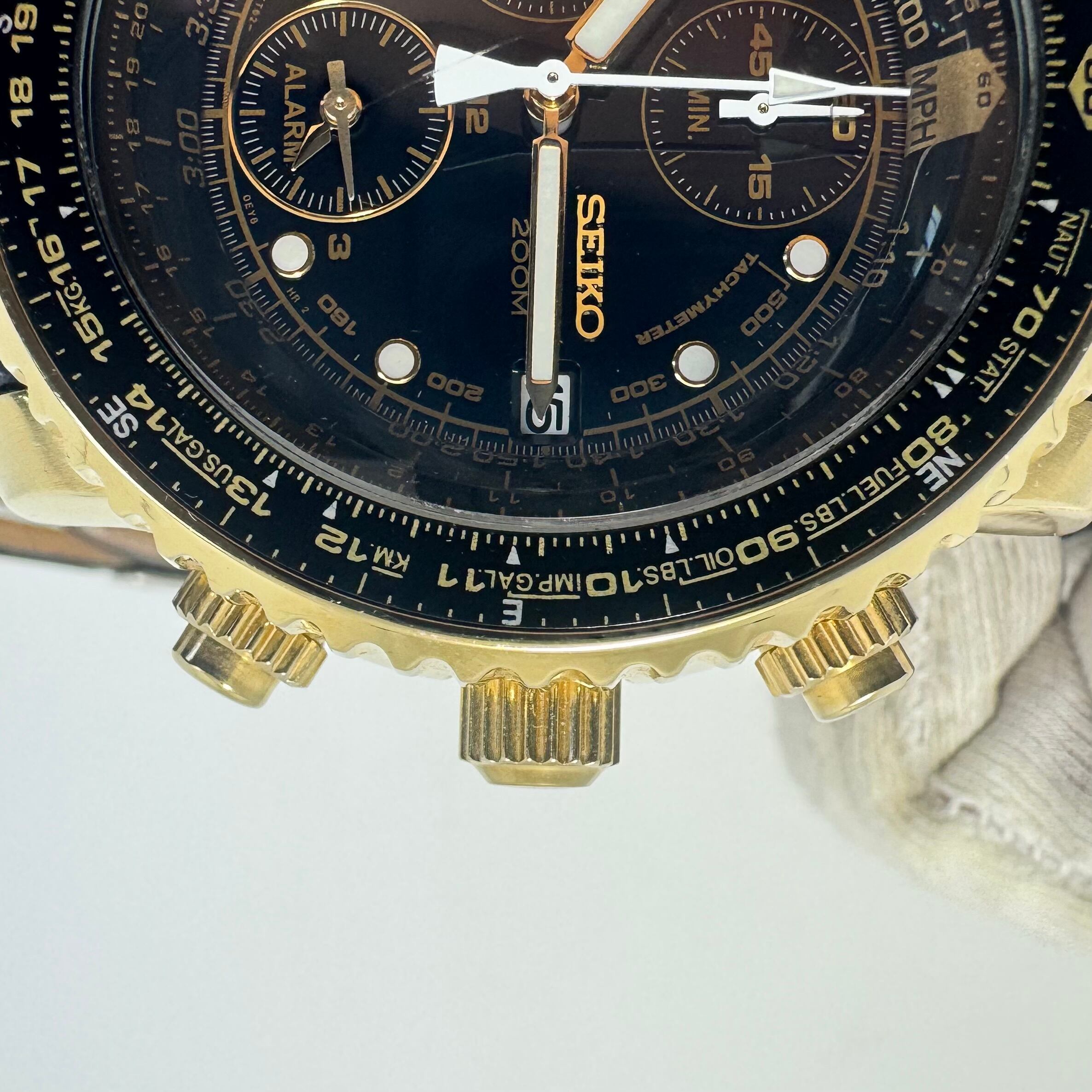 セイコー SEIKO パイロット・フライト・アラーム・クロノグラフ SNA414P1 7T62-0EB0 クォーツ タキメーター イエローゴールド 黒 デイト表示 20気圧防水 革ベルト 海外モデル