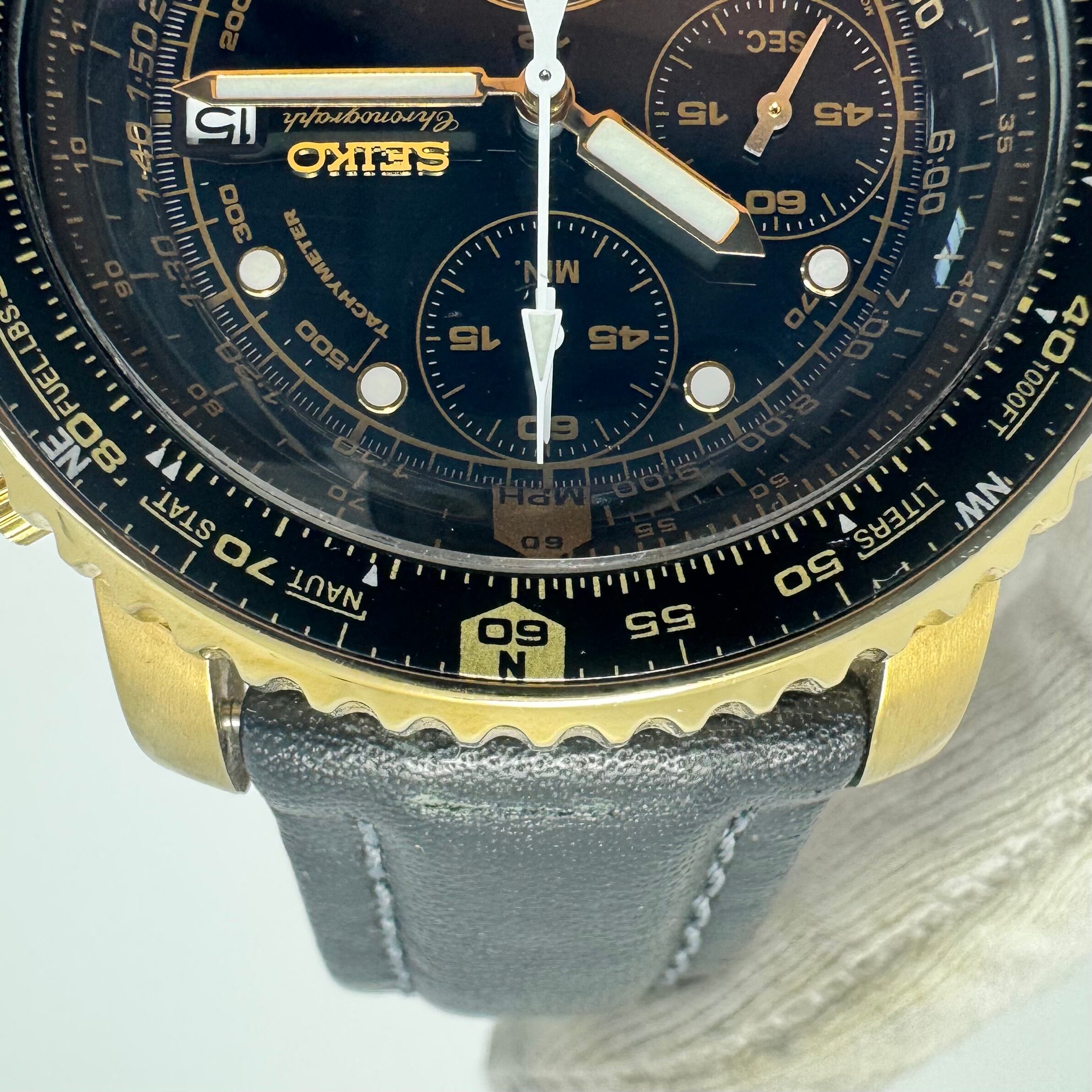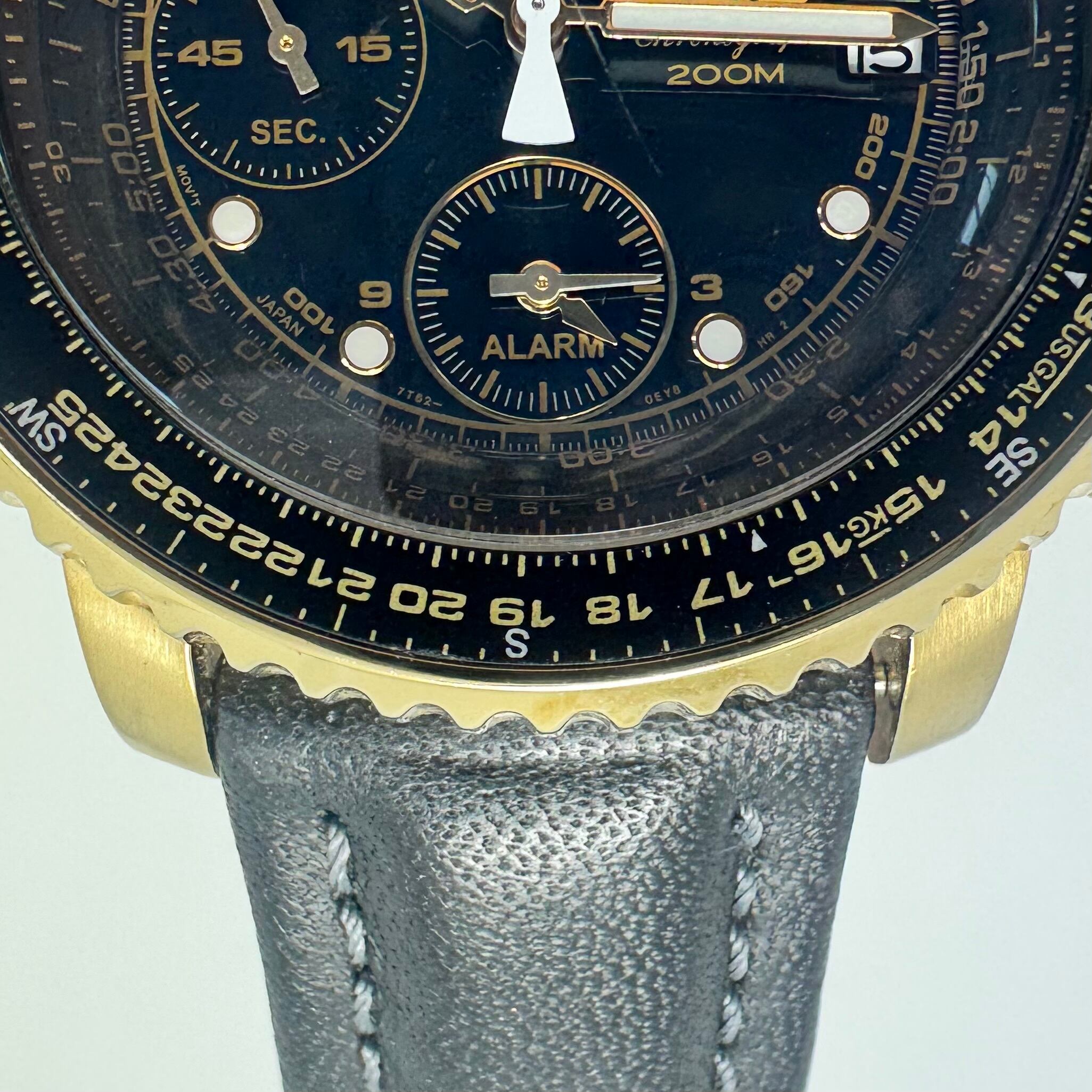 【希少】腕時計 メンズ セイコー SEIKO パイロット・フライト・アラーム・クロノグラフ SNA414P1 7T62-0EB0 クォーツ タキメーター イエローゴールド 黒 デイト表示 20気圧防水 革ベルト 海外モデル