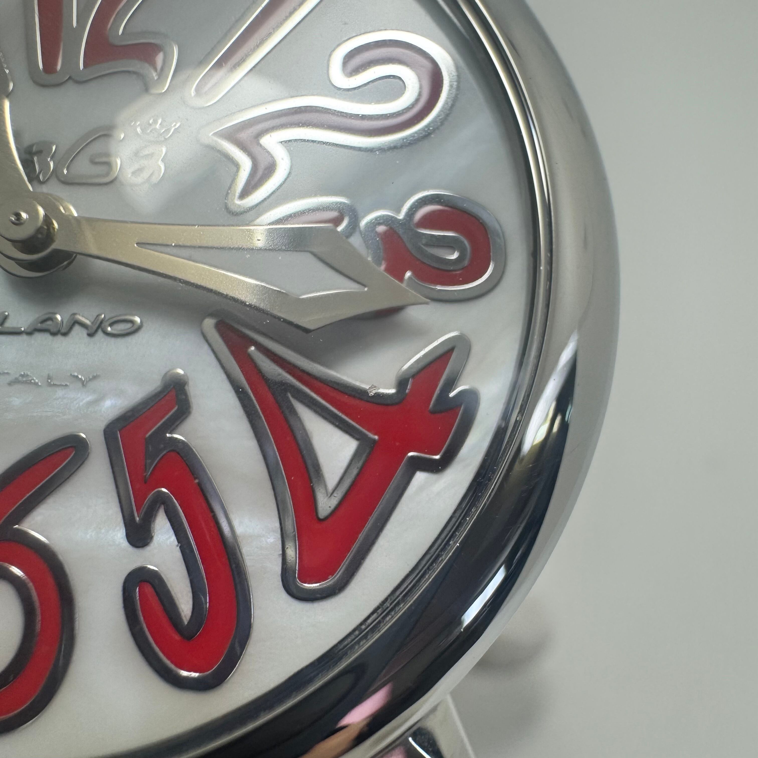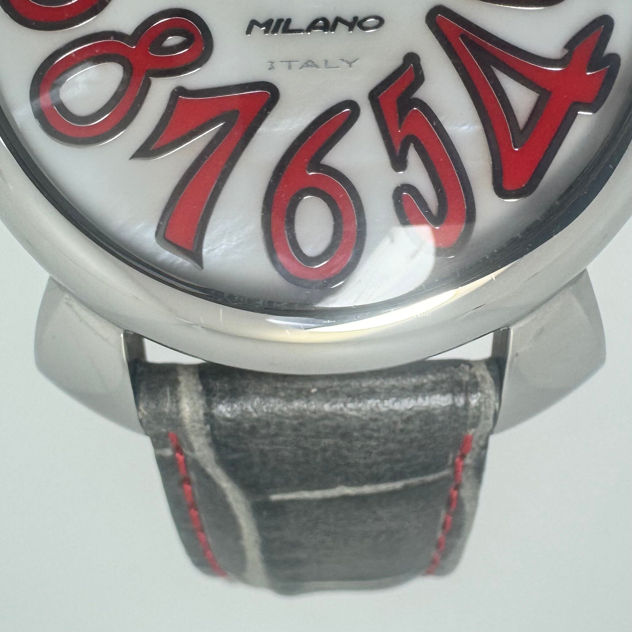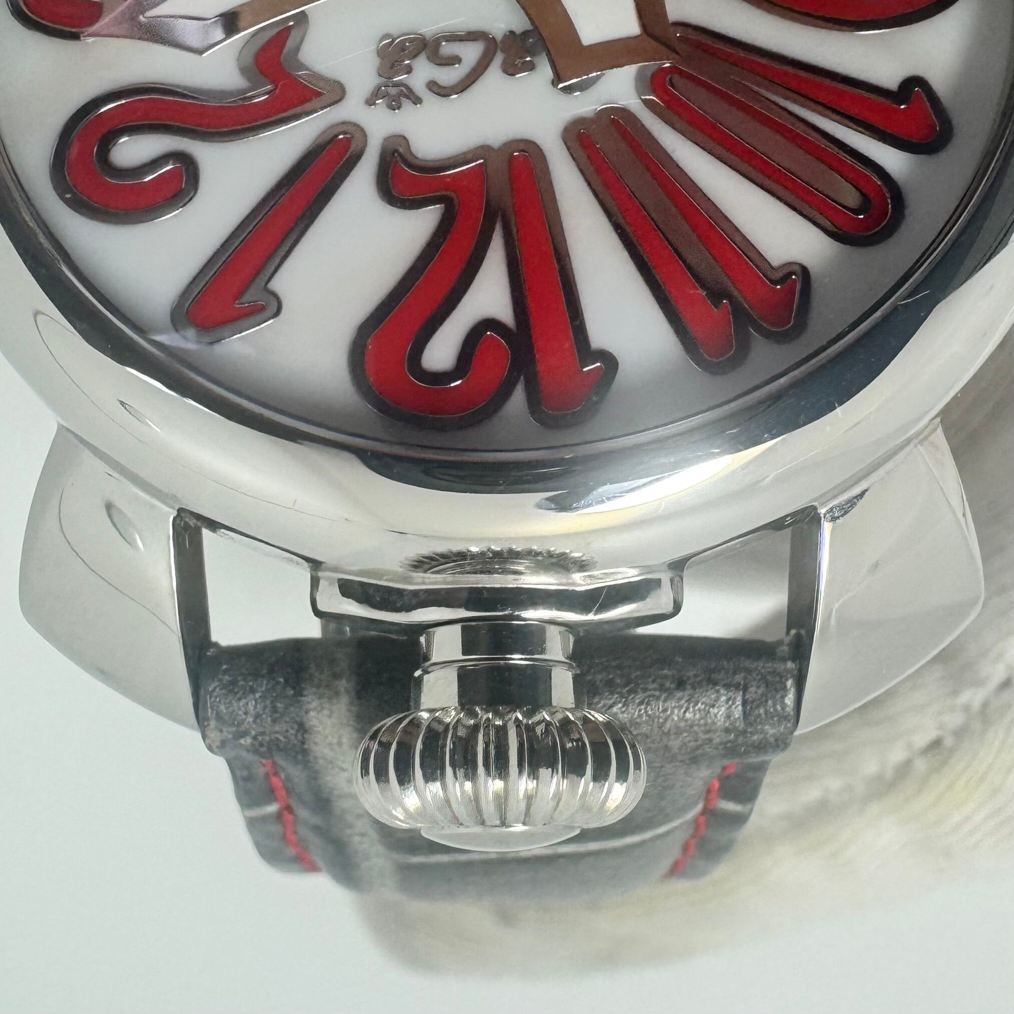 柔らかな光沢を放つマザーオブパール(ホワイト)文字盤に、GaGa MILANOらしい大胆なアラビア数字インデックスを組み合わせた、上品さと遊び心を兼ね備えた一本です。
