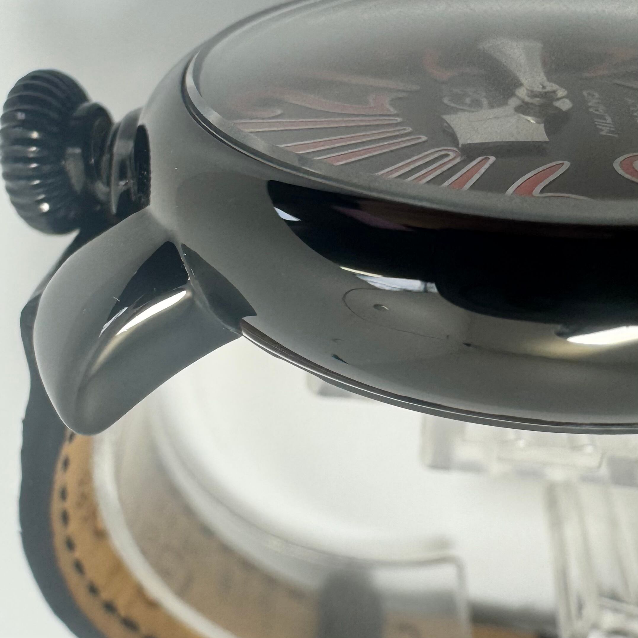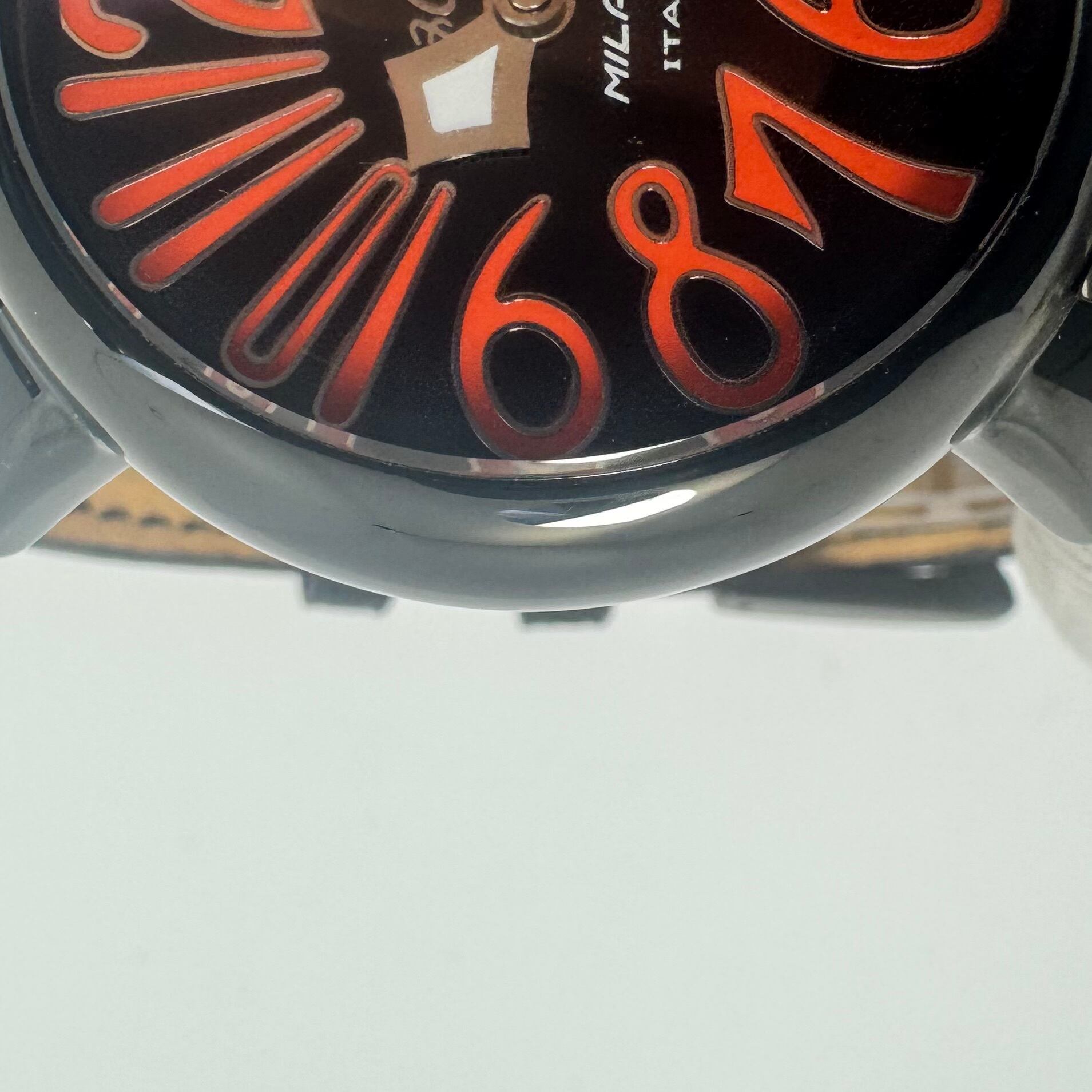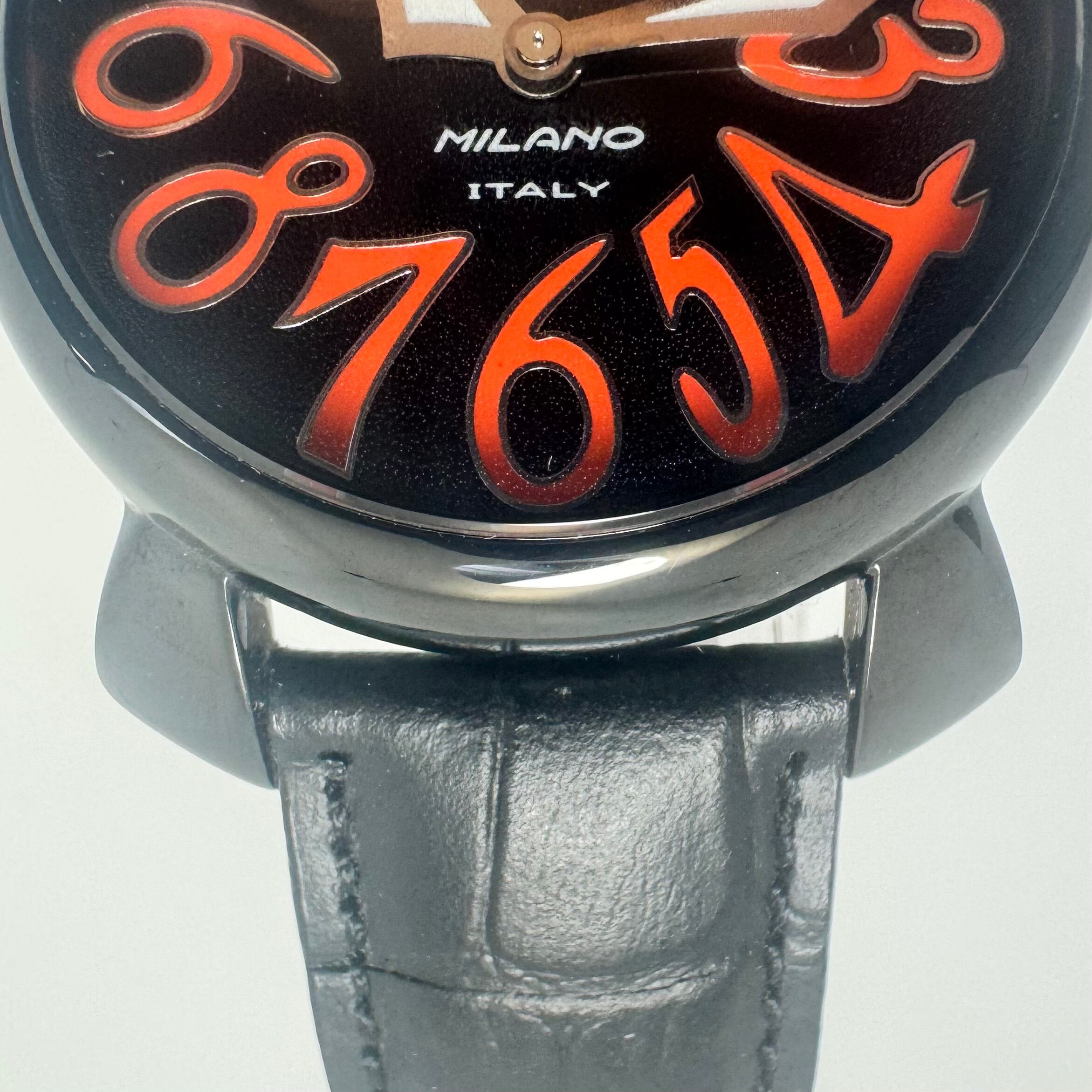 ブラック文字盤に、GaGa MILANOらしい大胆なアラビア数字インデックスを組み合わせた、遊び心ある一本です。