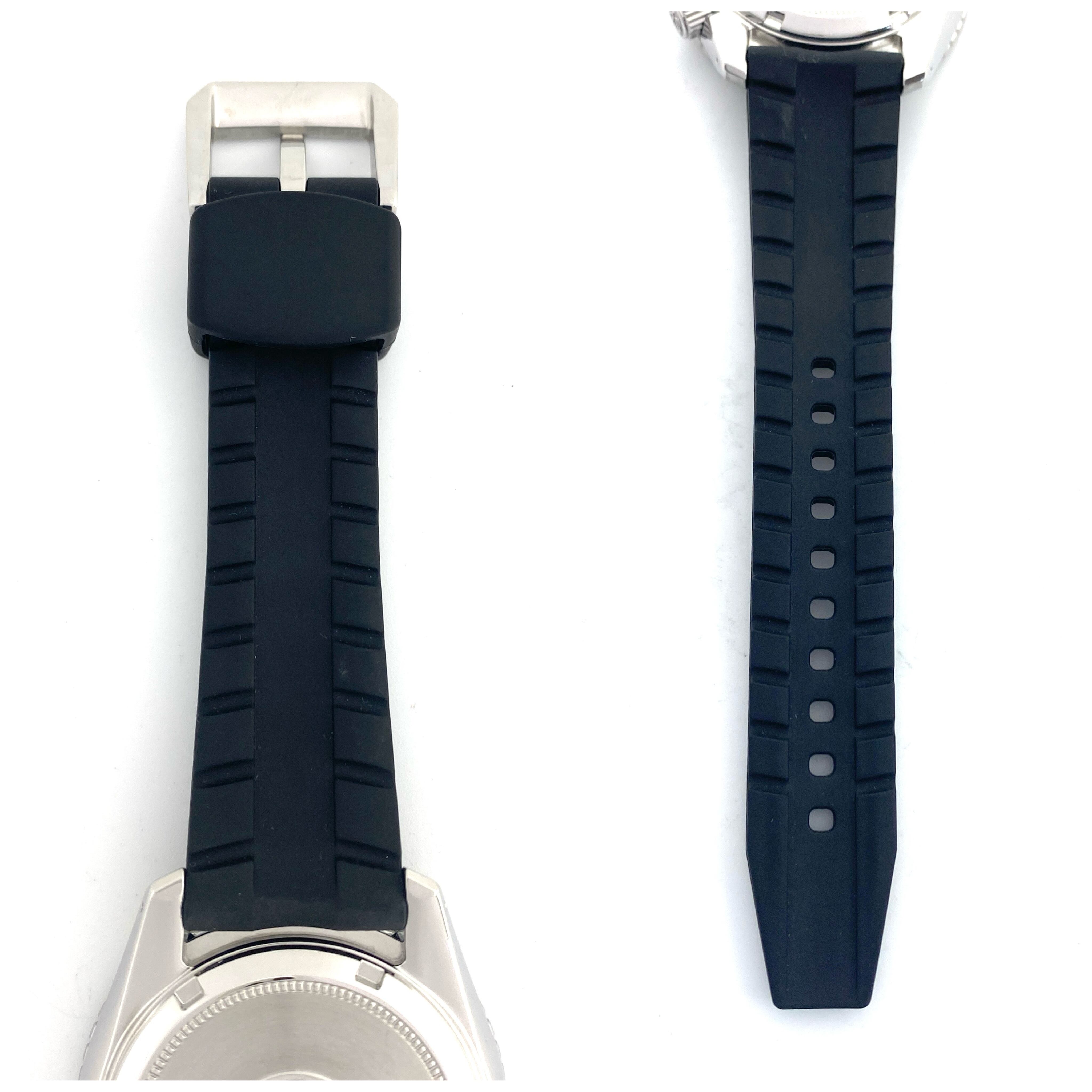 仕様:ステンレス、ねじ込み式リューズ、逆回転防止ベゼル、ラバーベルト