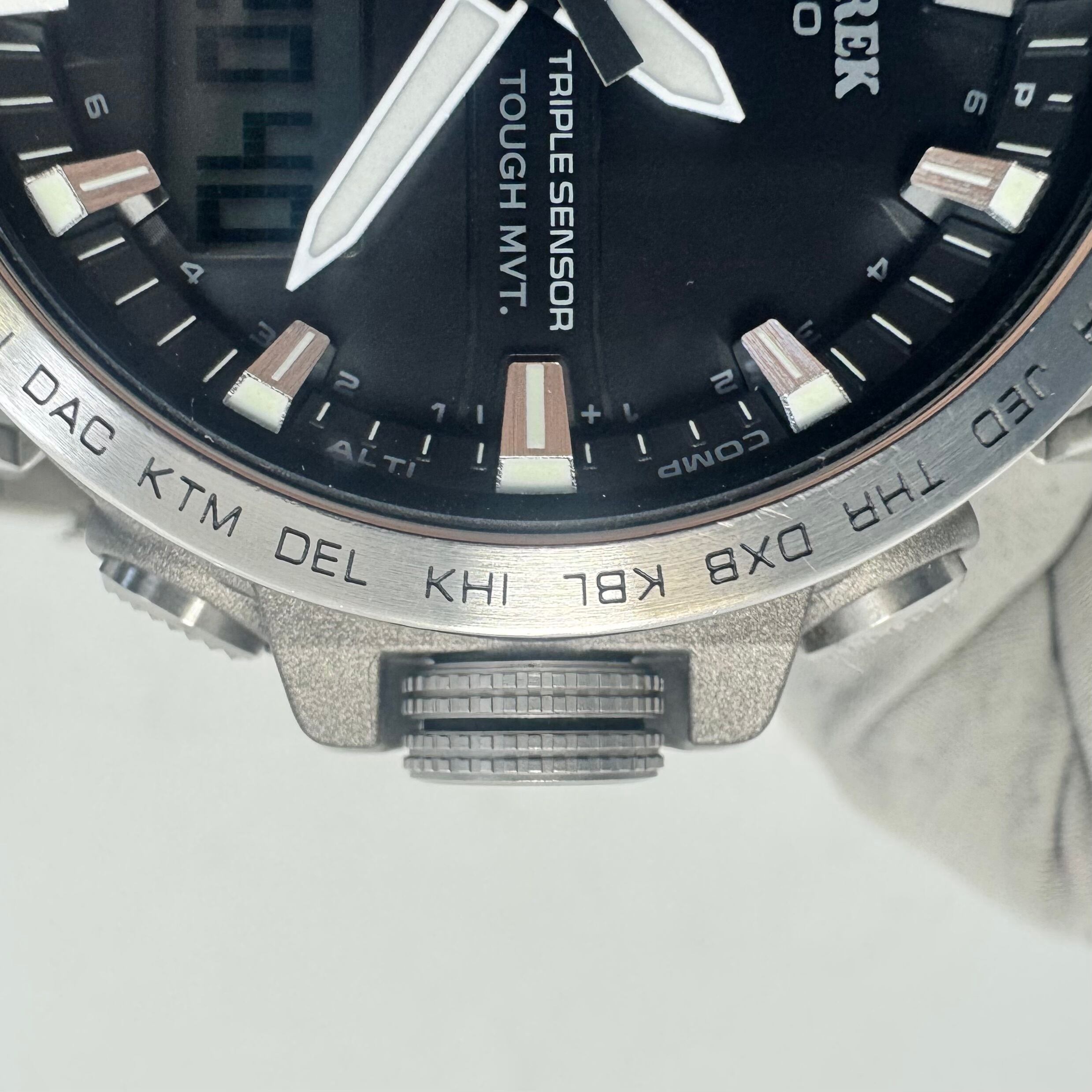 コンパクトで装着感の良いケース設計に、軽量で耐食性に優れたチタニウムバンドを採用した実用性の高いアウトドアウォッチです。方位・高度/気圧・温度を計測できるトリプルセンサー(Ver.3)を搭載しており、自然環境の変化をリアルタイムで把握できるため登山やトレッキングなどのアクティビティで高い実用性を発揮します。