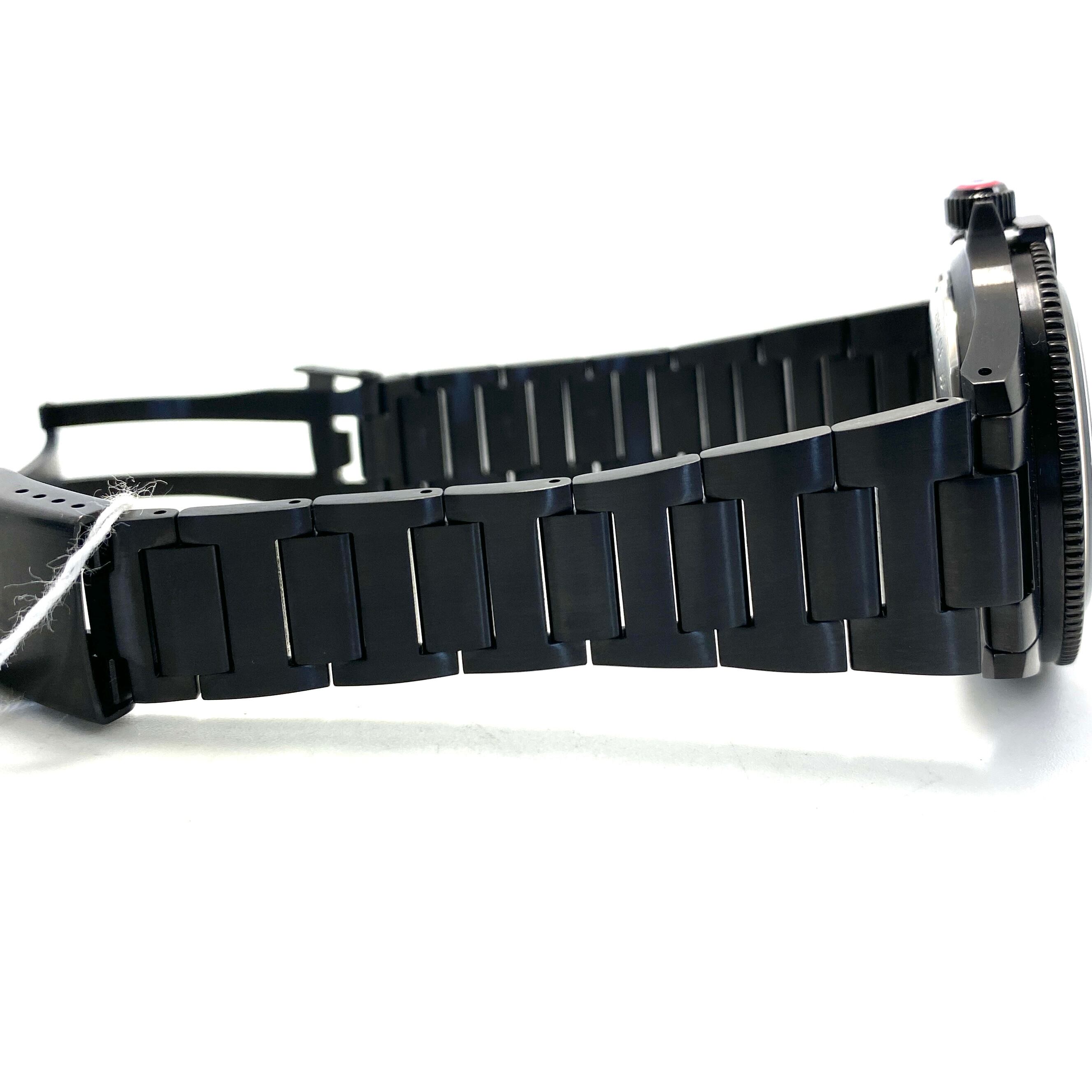 フランス空軍とのコラボレーションにより誕生した本モデルは、ミリタリーの背景を色濃く感じさせるデザインと高い実用性を兼ね備えた一本。ケースやブレスレットにはブラックPVDコーティングが施され、精悍で統一感のある外観が魅力。ダイヤルには空軍エンブレムが配され、限定モデルならではの特別感を演出しています。
