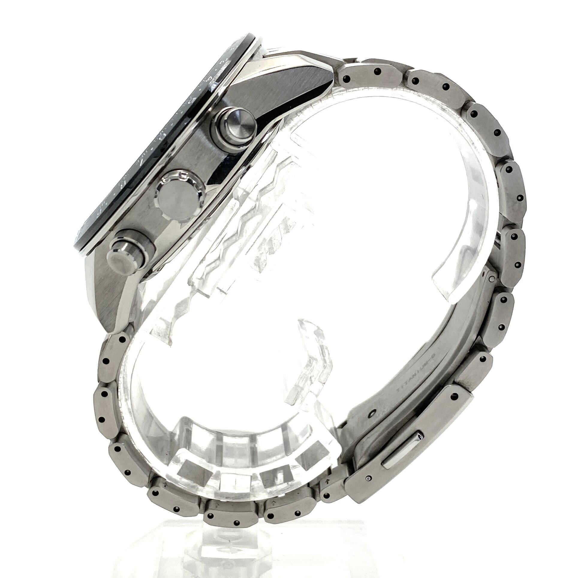ケースとブレスレットには軽量かつ耐久性に優れたチタニウム素材を採用し、長時間の着用でもストレスを感じにくい快適な装着感を実現。ブラックダイヤルにデイト表示を備えたシンプルで洗練されたデザインは、オン・オフ問わず使いやすい一本です。