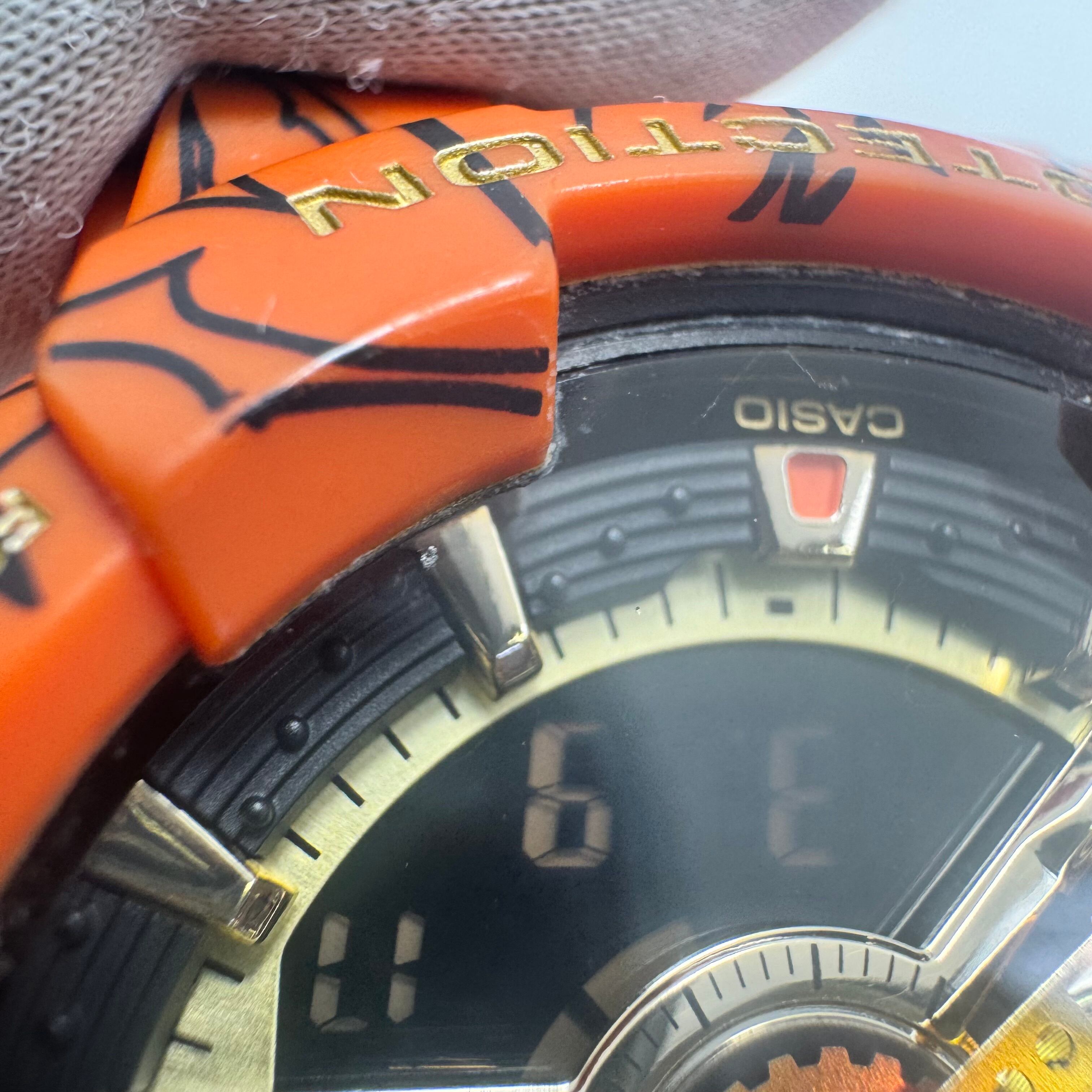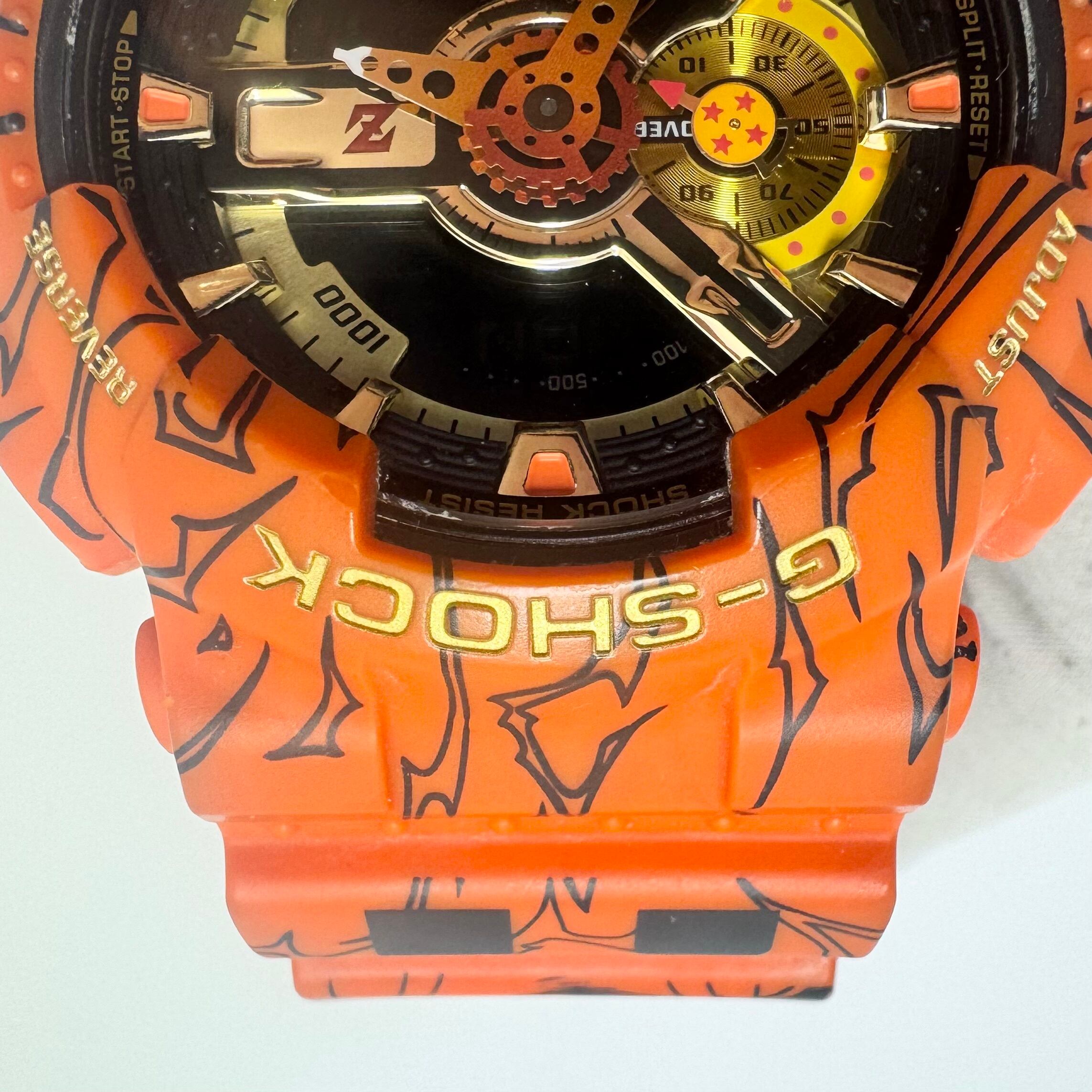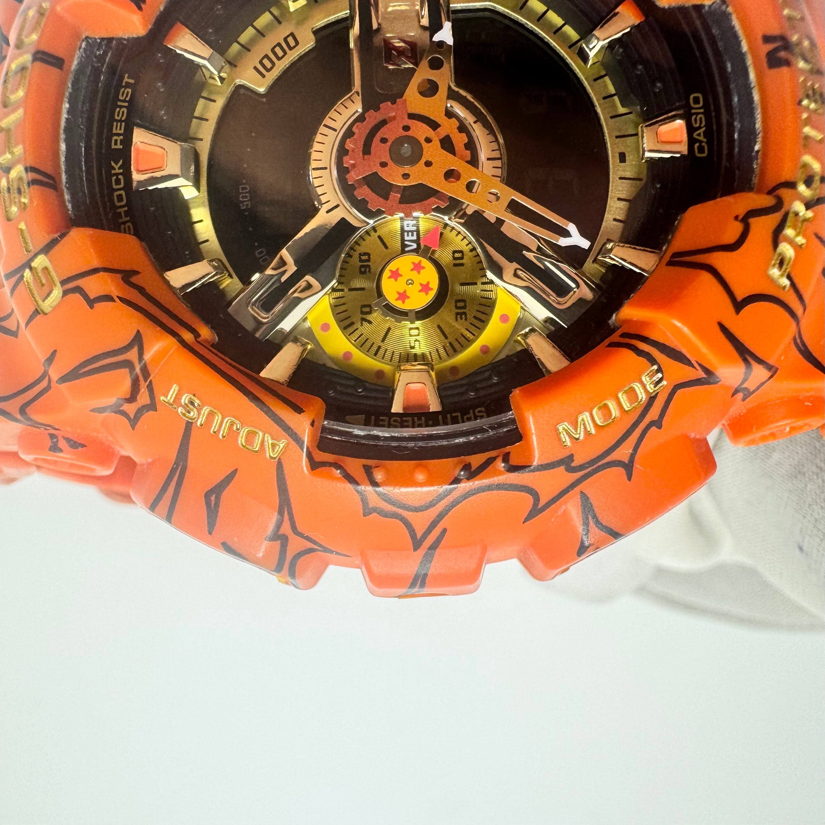 ベースモデルには迫力あるビッグケースデザインで人気のGA-110シリーズを採用し、アナログとデジタルを組み合わせた視認性の高いアナデジ表示が特徴です。作品を象徴するオレンジカラーをアクセントに取り入れ、文字盤やバンドにはドラゴンボールの世界観を表現した特別なデザインが施されています。
