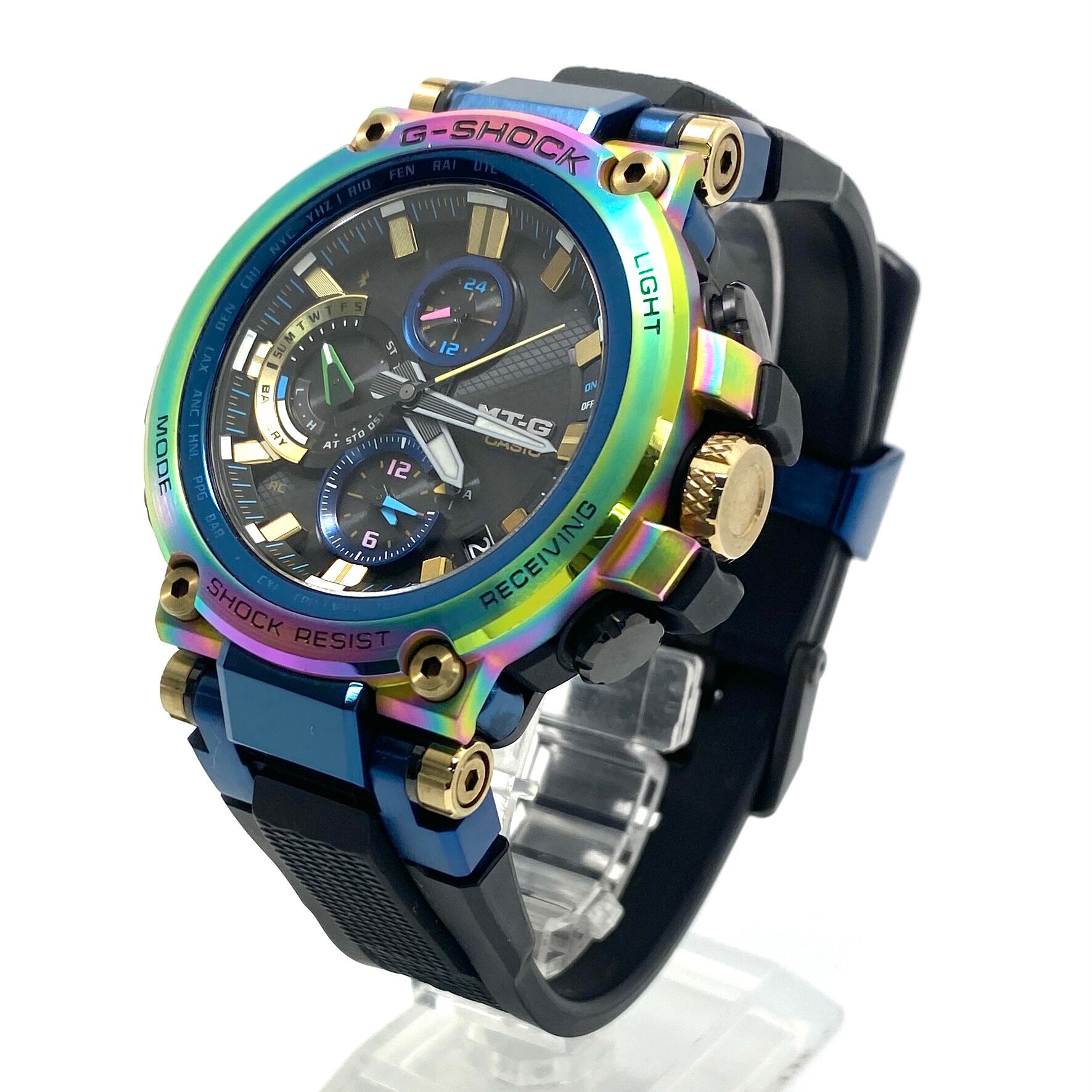 メタルと樹脂を融合したMT-Gならではの重厚な外装に、虹色に輝くレインボーIPベゼルを採用した存在感抜群の一本です。個体ごとに異なる色合いを見せる特殊加工により、同モデルでありながら一点一点異なる表情を楽しめるのも大きな魅力です。
