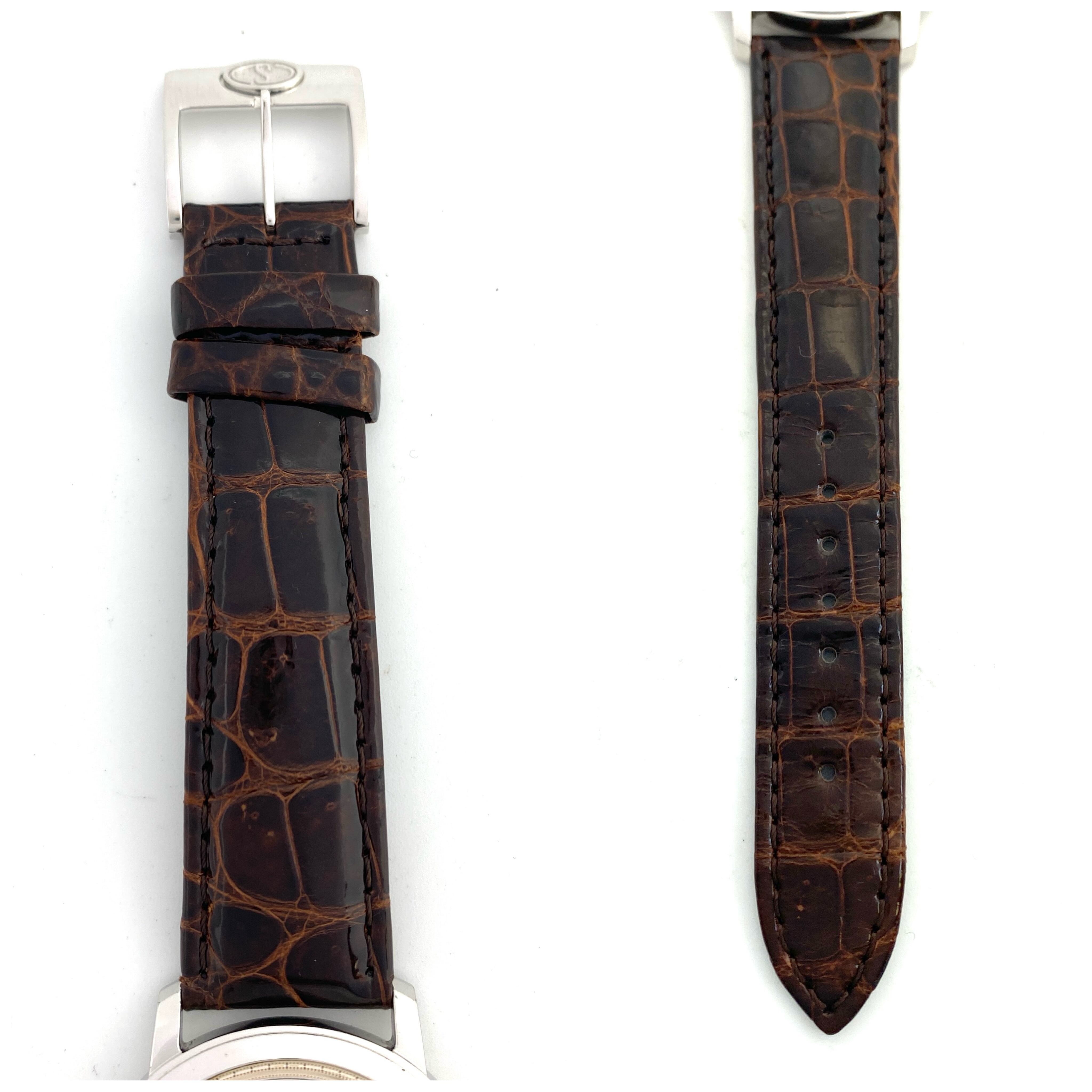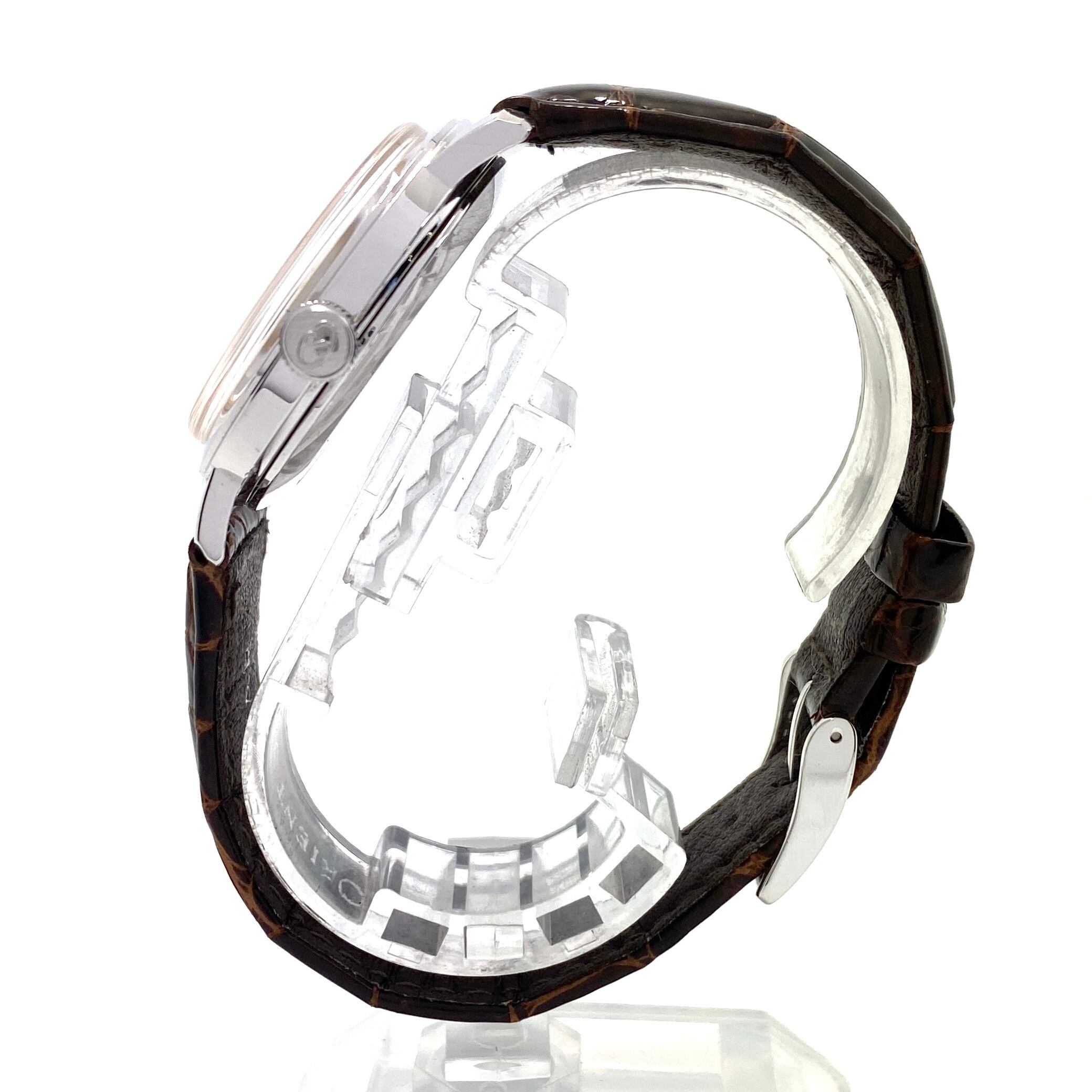 シンプルで上品なシルバーダイヤルに、機械式ならではの味わいを感じさせるパワーリザーブ表示を備え、視認性と機能美を兼ね備えた一本です。 小ぶりなケースサイズは腕元にさりげない品格を添え、スーツスタイルやフォーマルシーンとの相性も抜群。