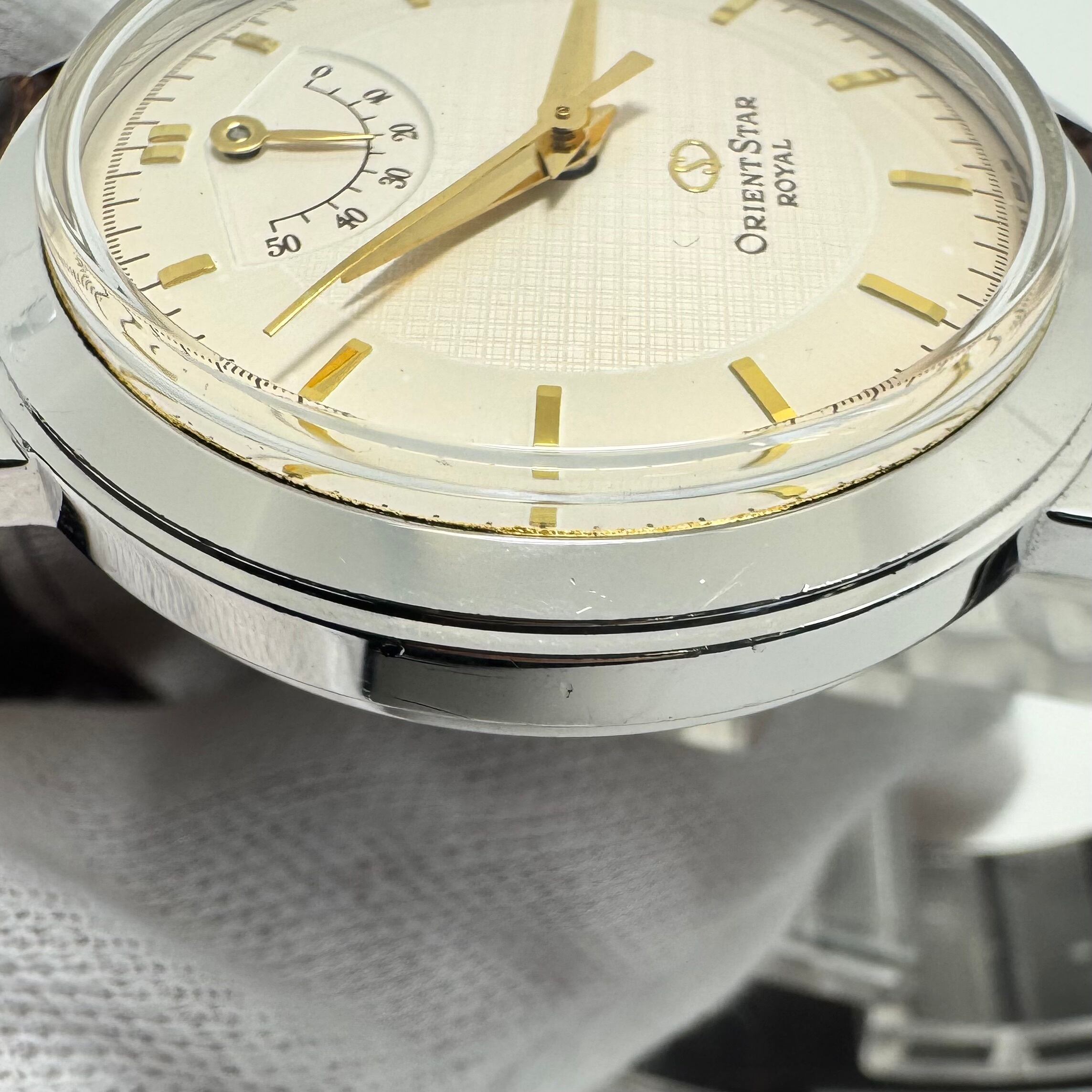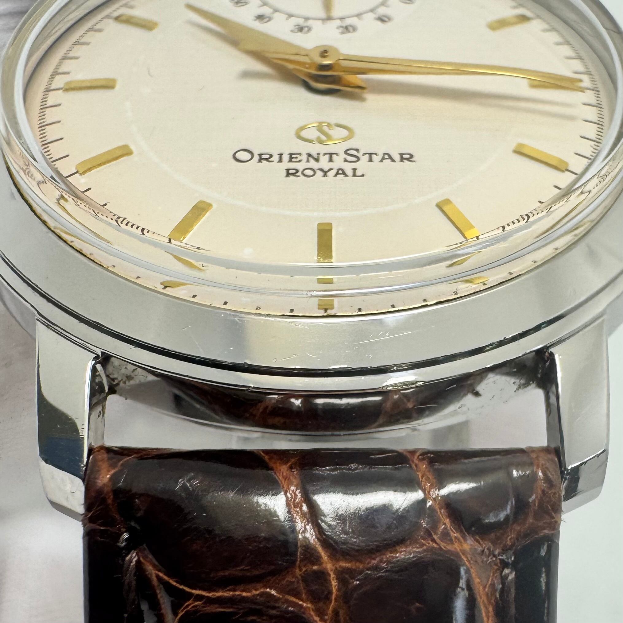 裏蓋はシースルーバック仕様となっており、丁寧に仕上げられたムーブメントの動きを目で愉しむことができます。 現行ラインにはない「ロイヤル」ならではの上質感と希少性を備えたモデルで、人と被らない国産ドレスウォッチをお探しの方にもおすすめです。