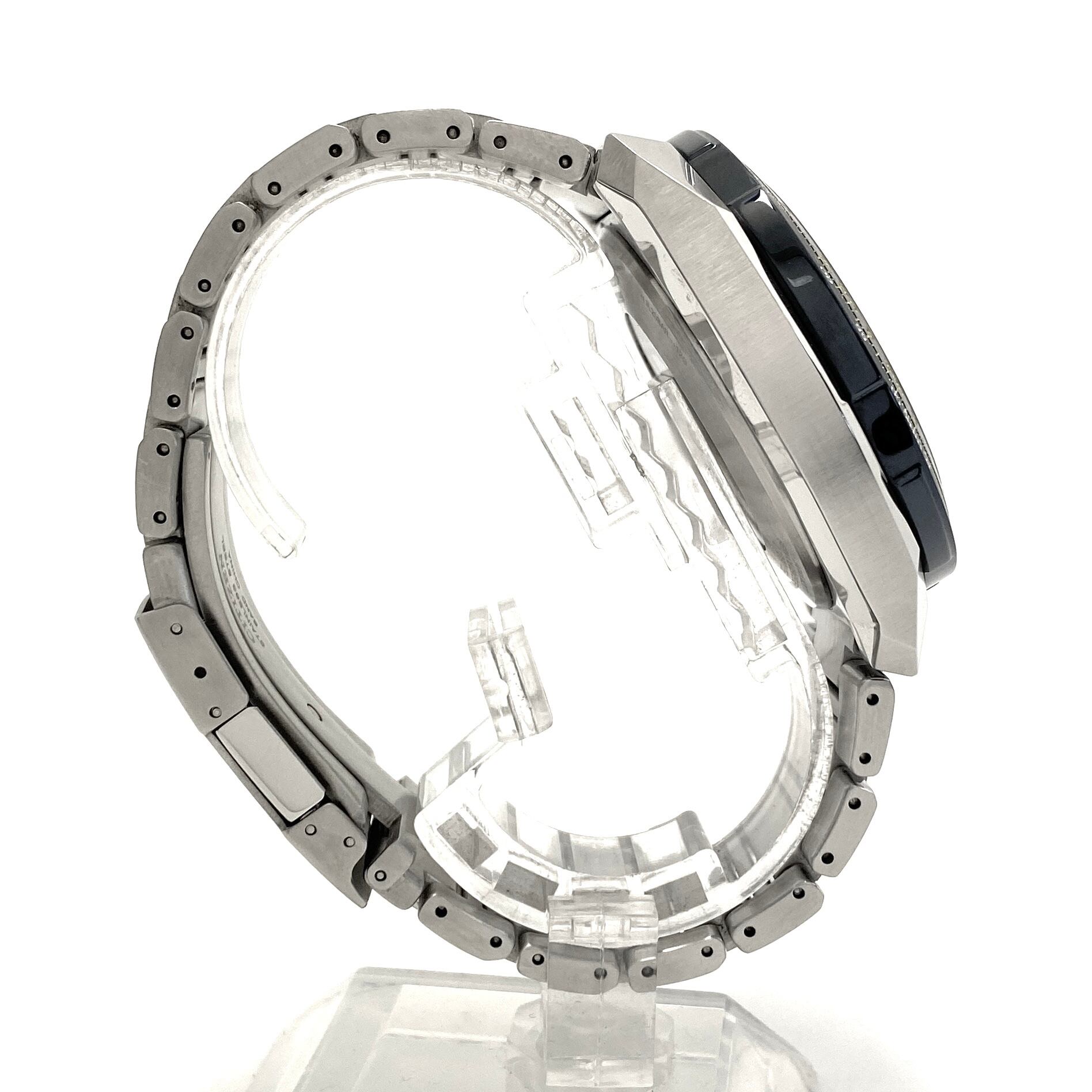 エコ・ドライブによる光発電機能に加え、電波受信による高精度な時刻修正機能を搭載し、実用性も非常に高いモデルです。さらに、ワールドタイムやクロノグラフ、パーペチュアルカレンダー、アラームなど多彩な機能を備え、まさに“空のための計器”とも言える充実したスペックを誇ります。