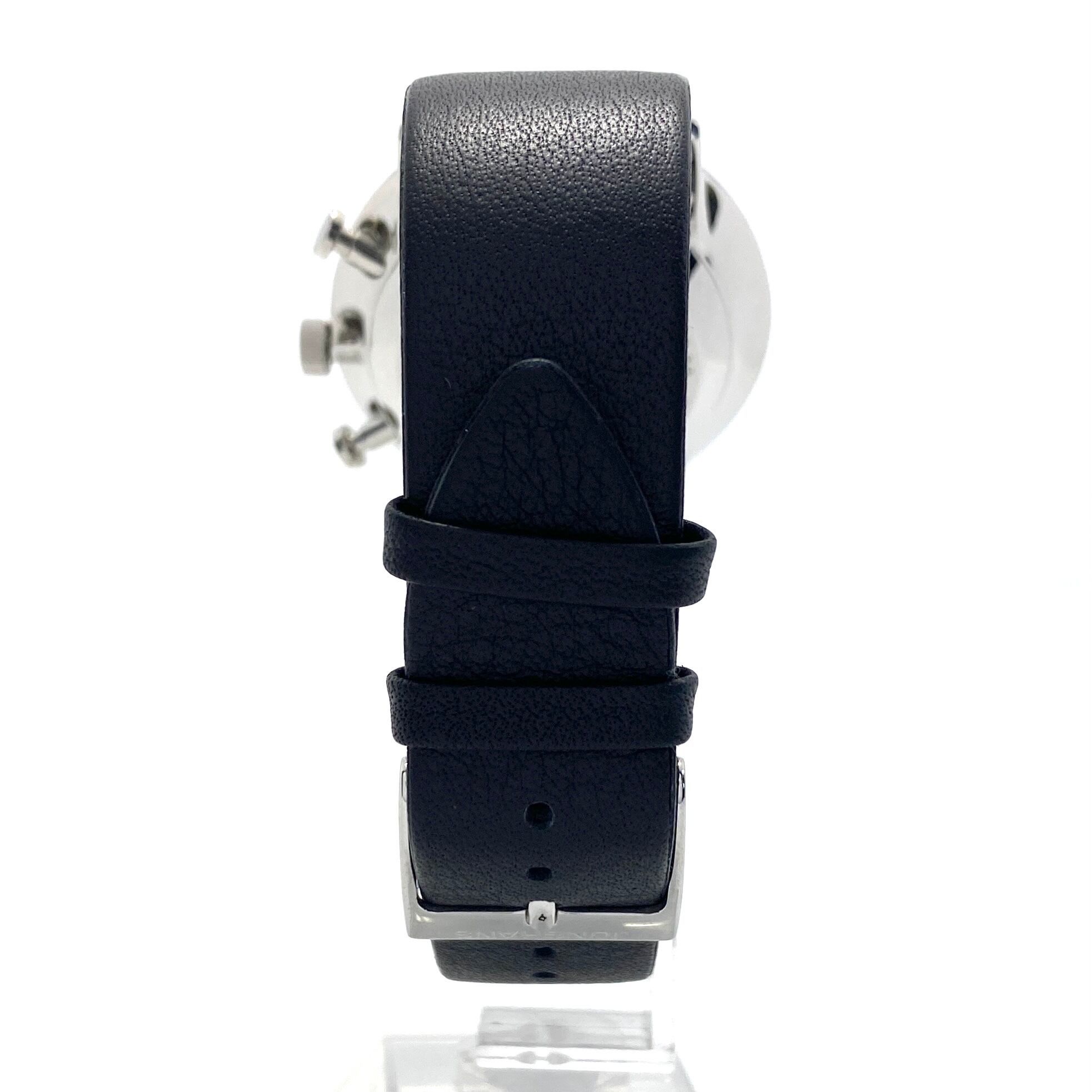 無駄を削ぎ落としたシンプルなホワイトダイヤルに、バランスよく配置されたインダイヤルが調和し、クロノグラフでありながら洗練された印象を与える一本です。