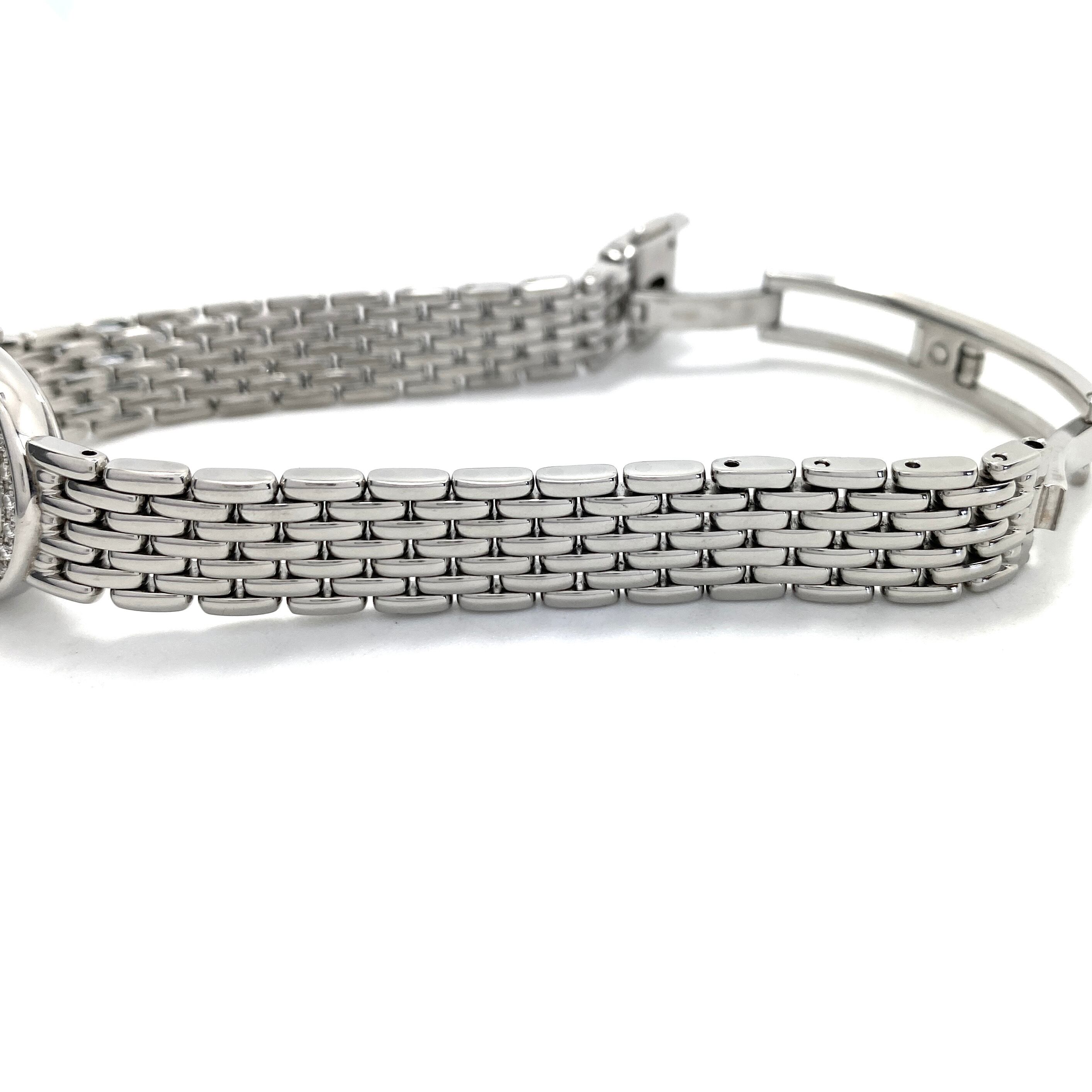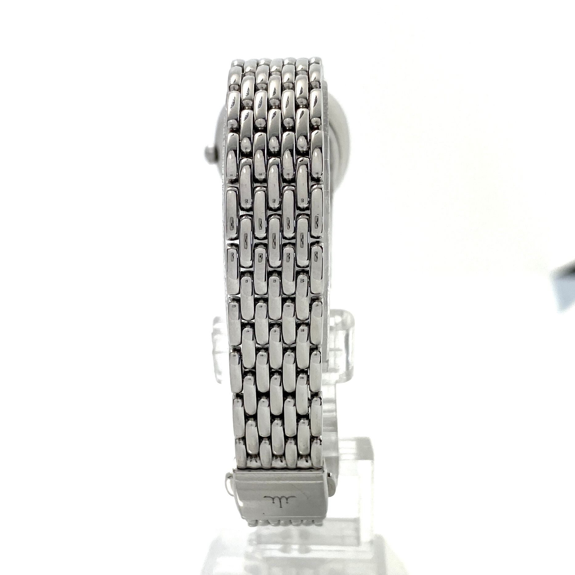 小ぶりで洗練されたケースサイズは腕元を美しく見せ、フォーマルから日常使いまで幅広いシーンにマッチ。ホワイトシェル文字盤が放つ柔らかな輝きに、ベゼルには上品に配されたダイヤモンドが華やかさを添え、ジュエリーのような存在感を演出します。